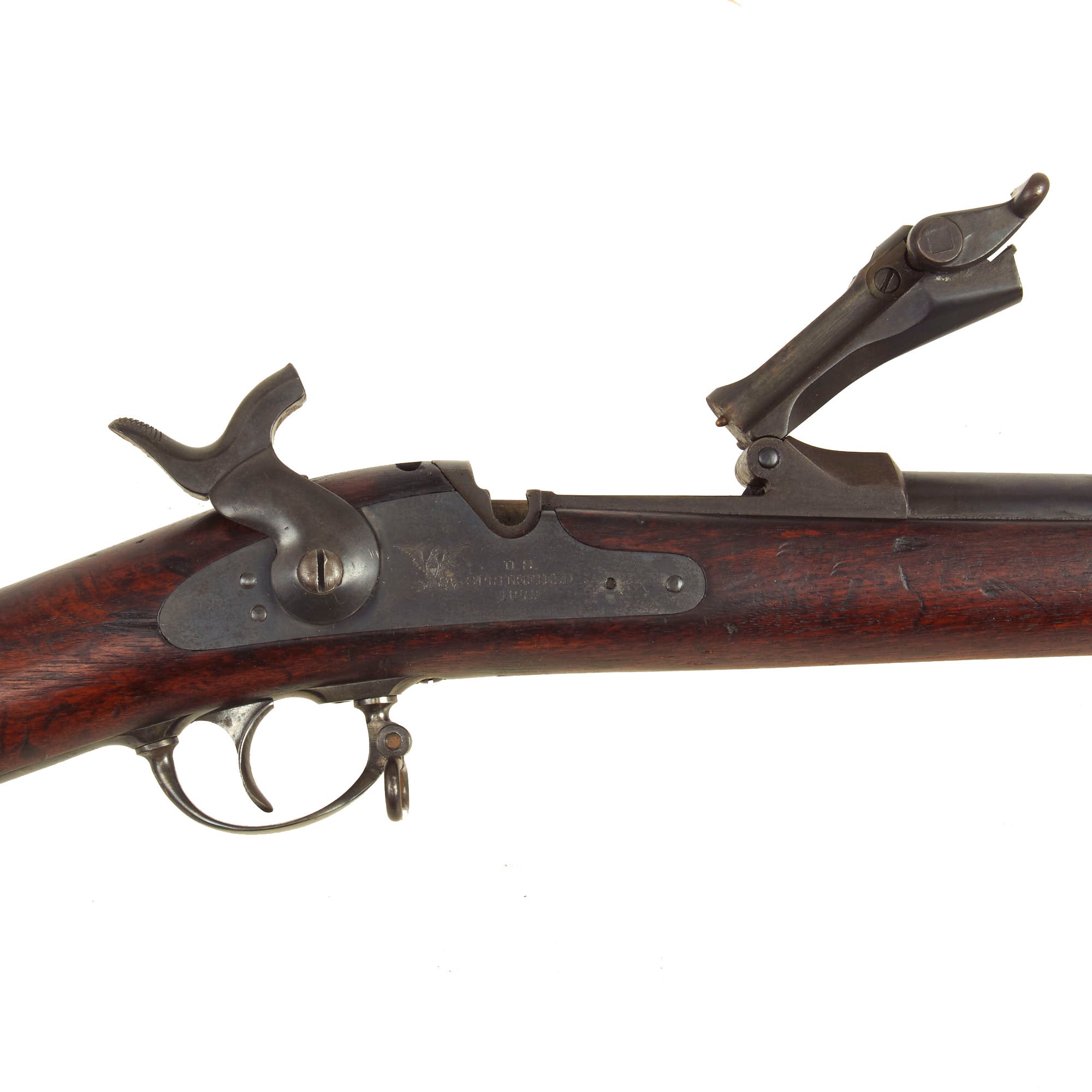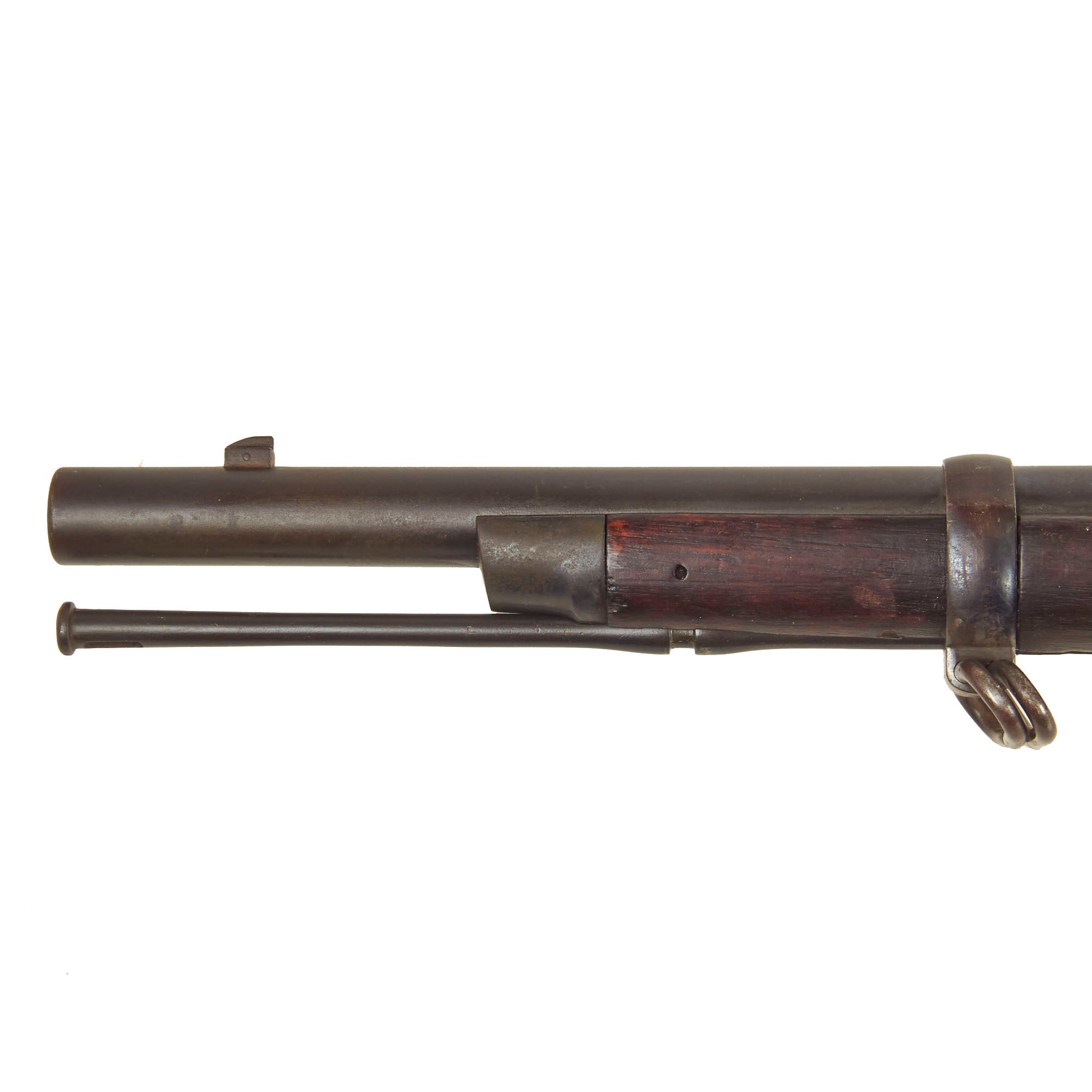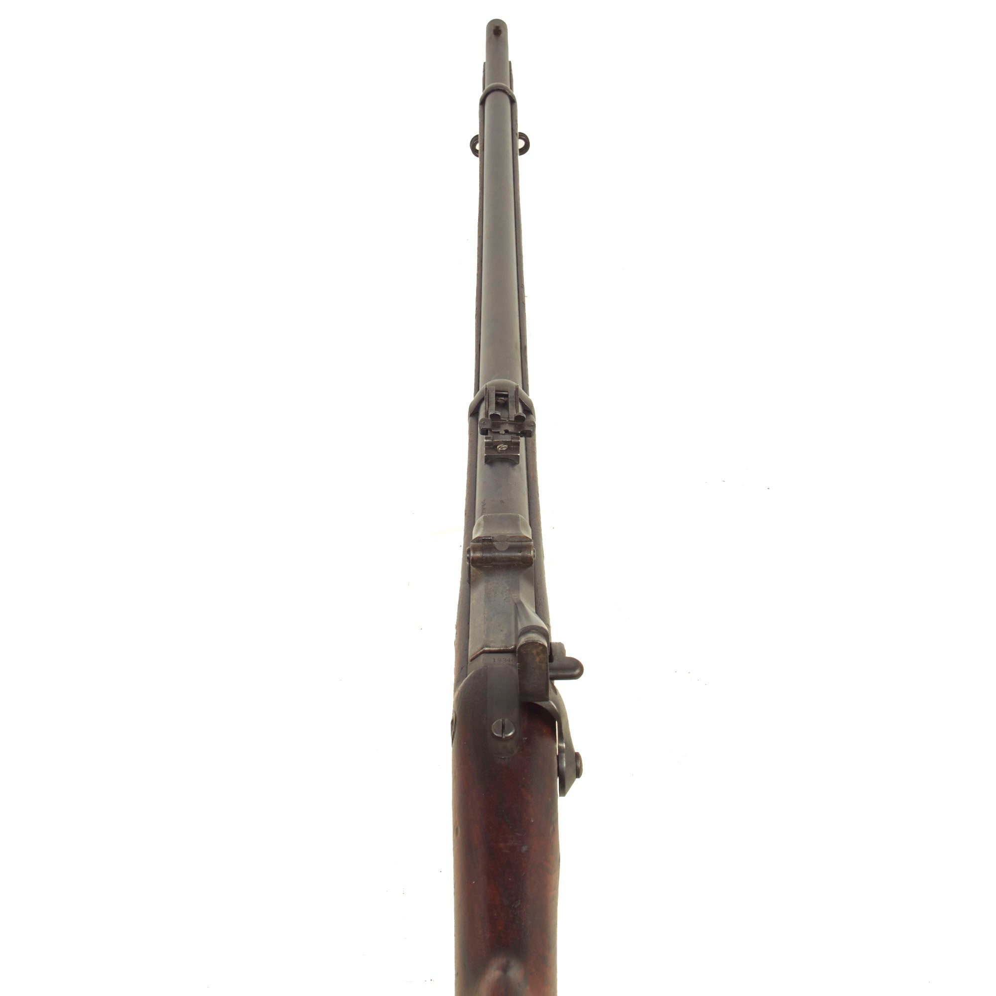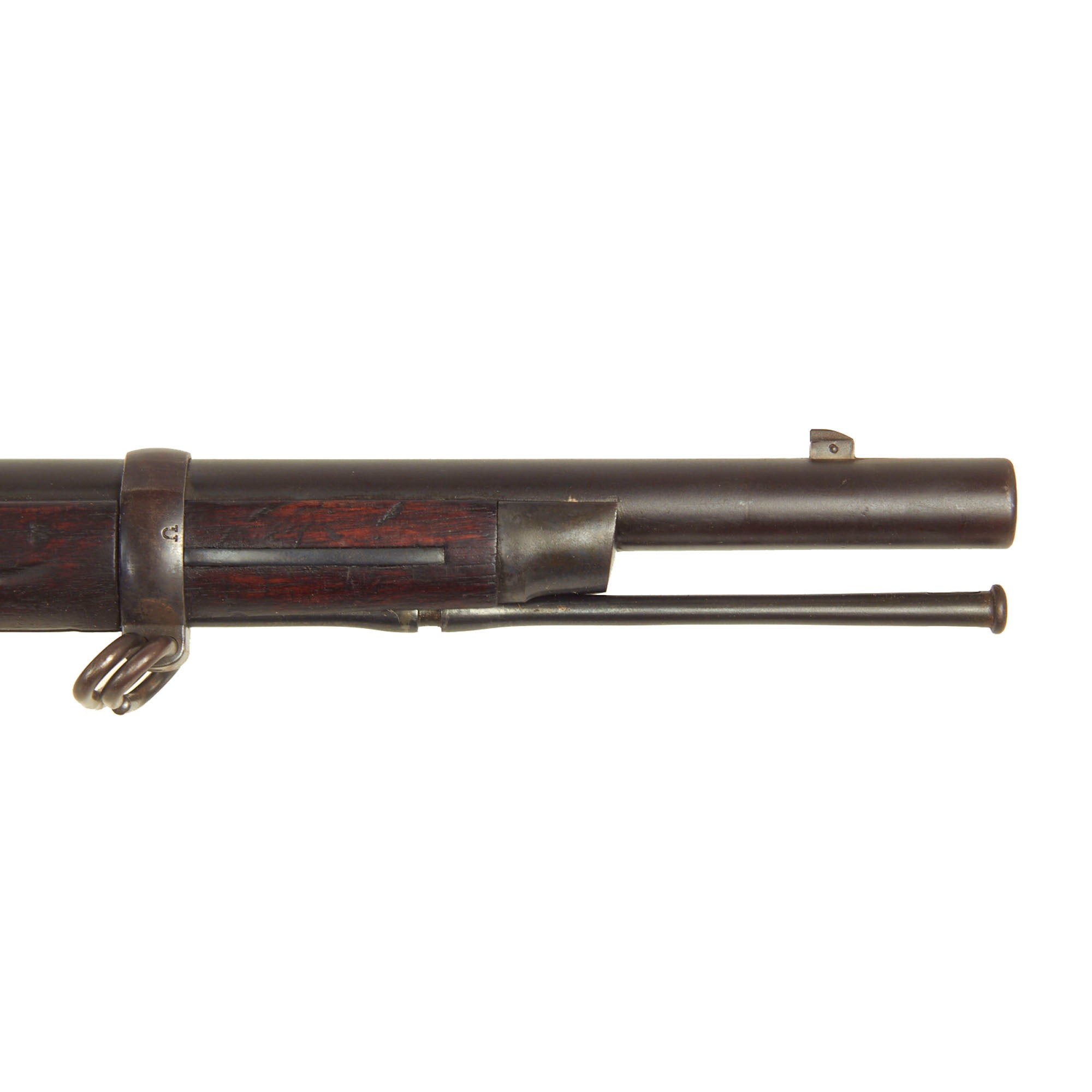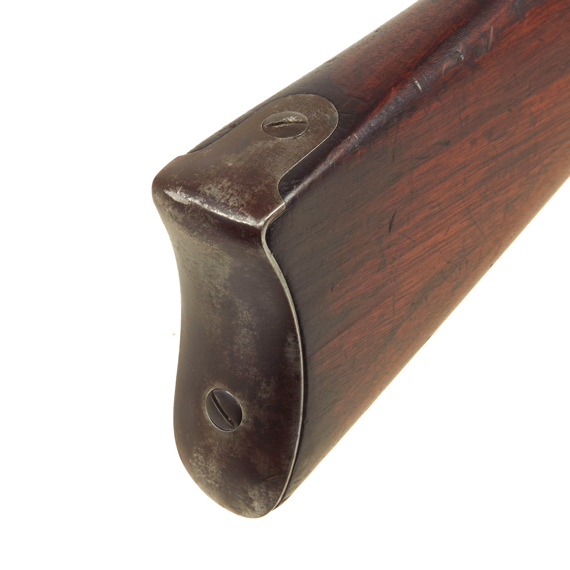 The butt plate is marked U.S. and both barrel bands are U marked. The overall metal finish still shows some of the original bluing, with the balance mostly showing a dark gray oxidized patina. Center fire breechloader, .45 cal., two bands, two sling swivels with stacking swivel, standard model 1879 sliding sight, and standard ramrod. Lock is marked with a Federal Eagle and U.S. / SPRINGFIELD / 1873, indicating that it was manufactured at the United States Armory and Arsenal at Springfield, in Springfield, Massachusetts. This is an early pattern lock plate, but it has the correct three notch tumbler, and was most likely fit onto this rifle as an arsenal replacement.