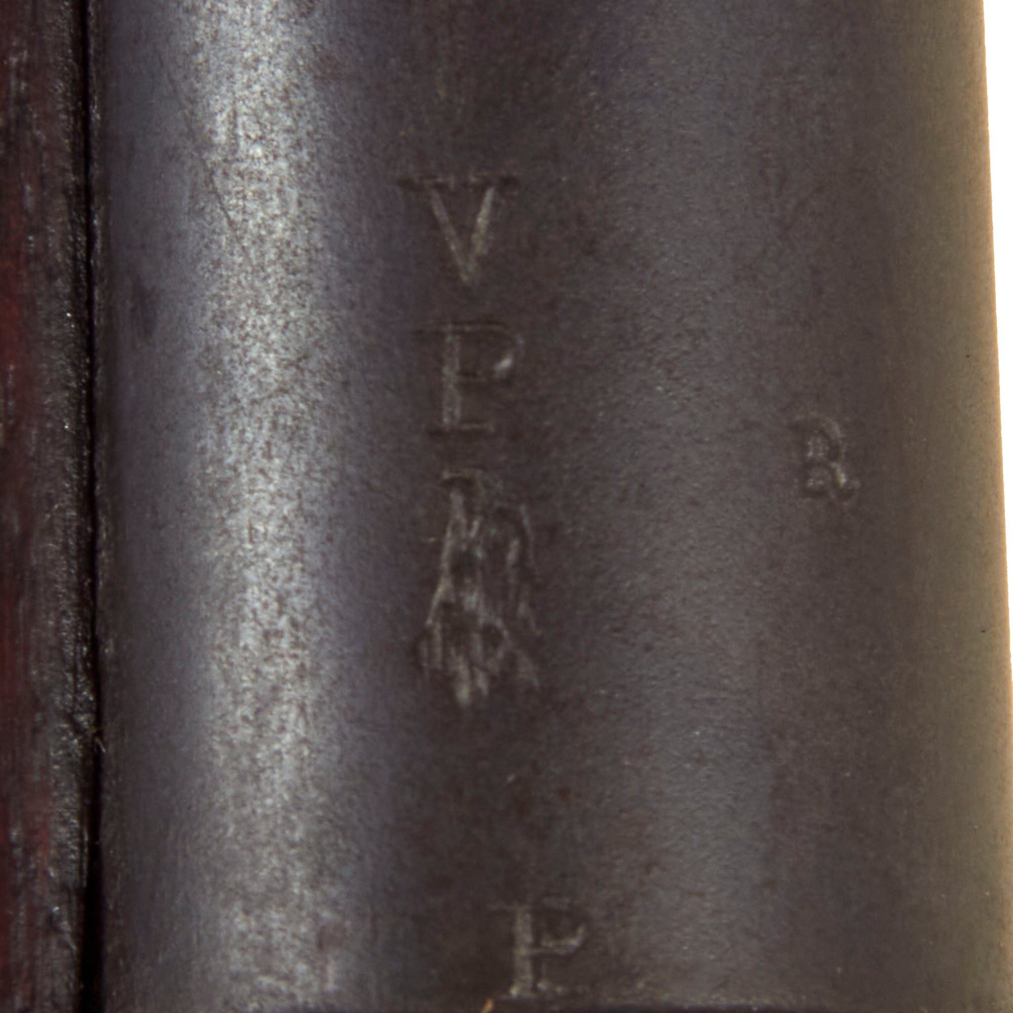 The stylized P in a circle under the wrist of the stock indicates that the rifle passed all of its overpressure proof testing. Additional marks of interest include inspectors' and proof marks around the breech end of the barrel: a capital R on top; a V over a P over an eagle's head over another P on the left side just above the stock. The upper right corner of the standard M1879 sliding sight leaf and the left side of the ramp are marked R to indicate that the sight graduations are for a rifle and not a carbine.