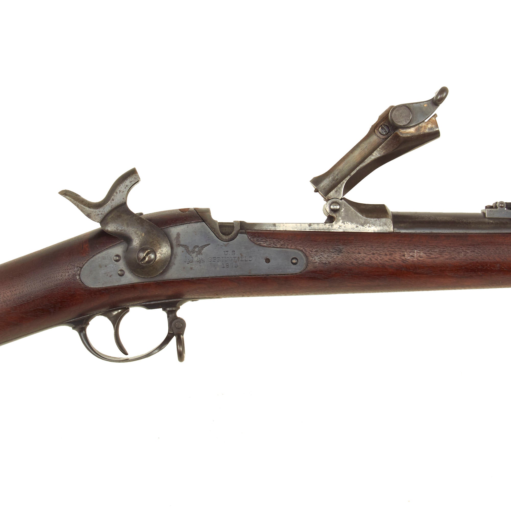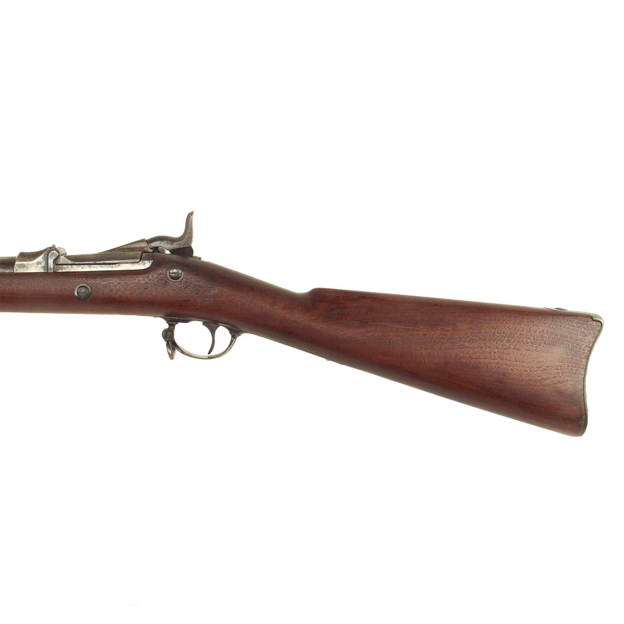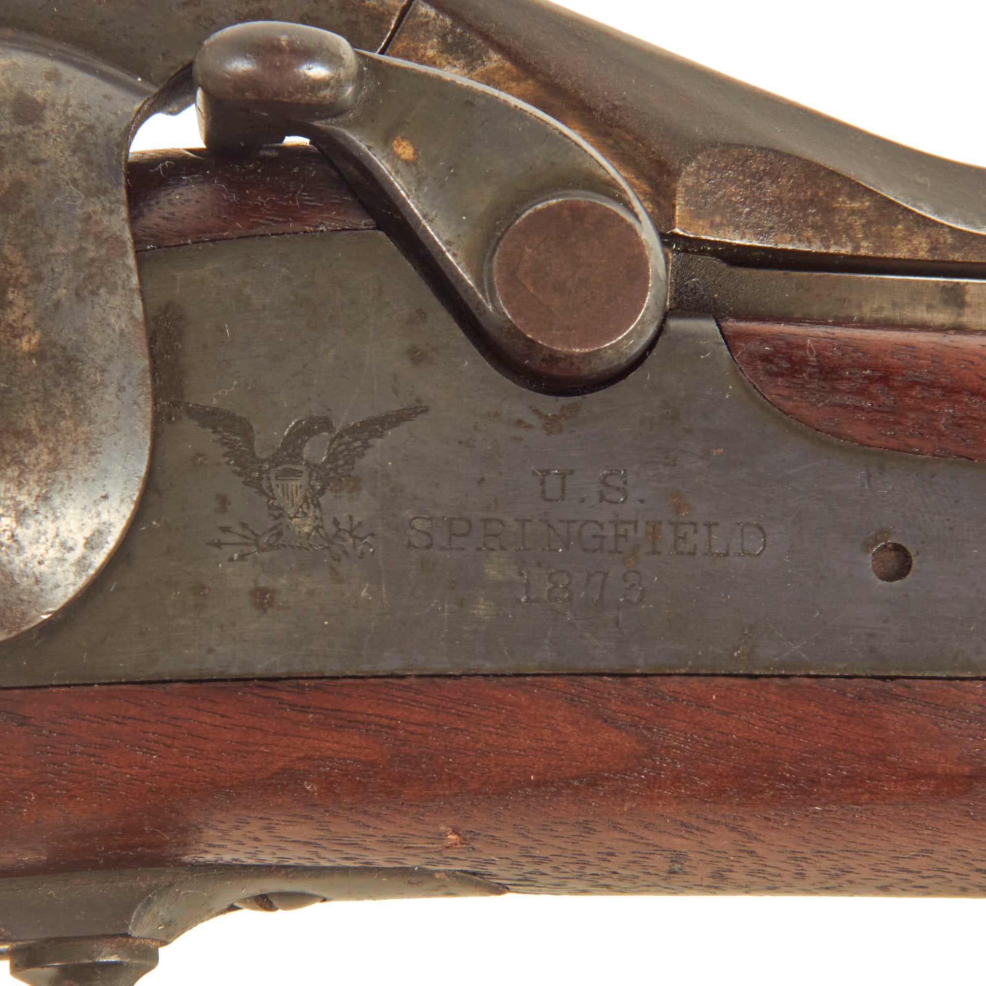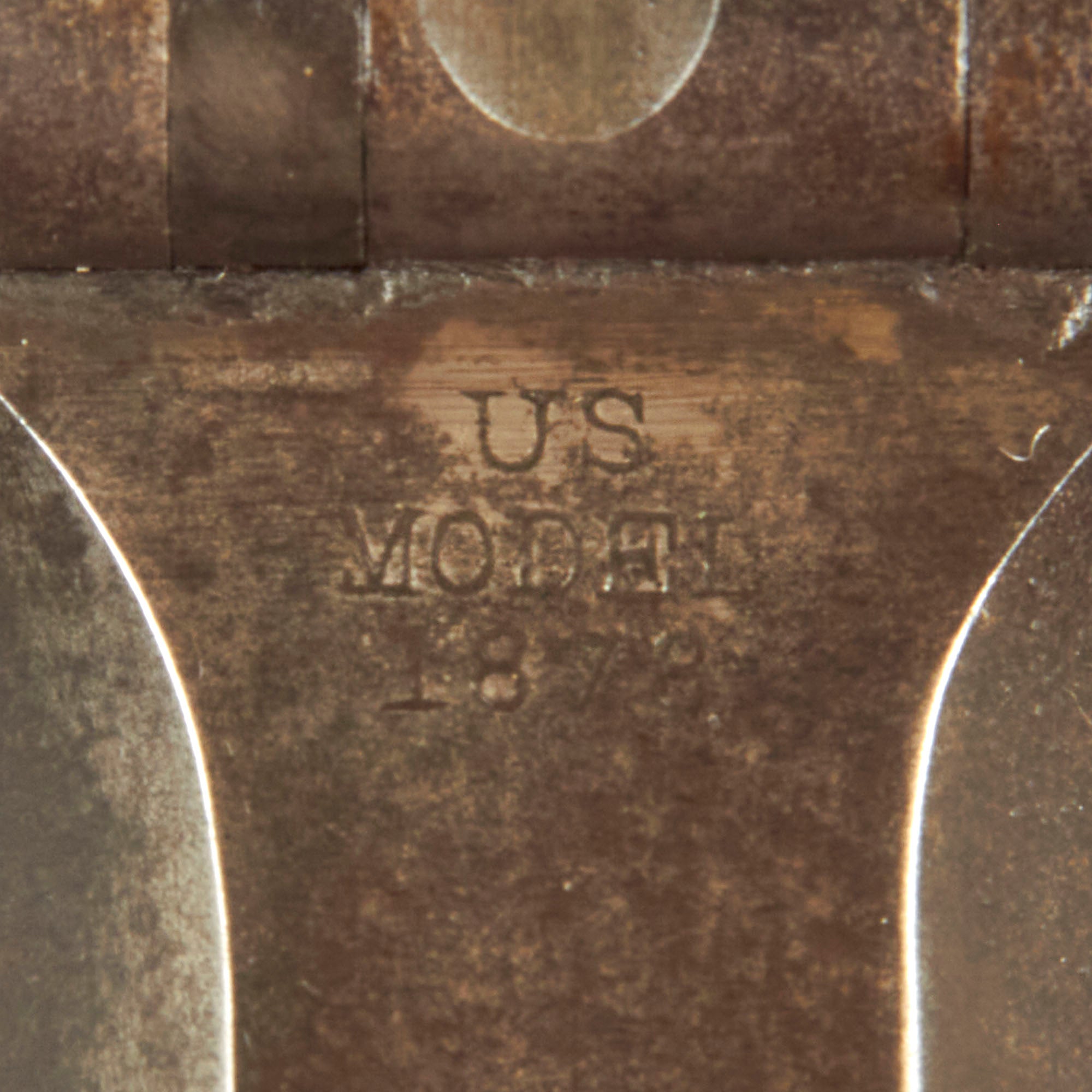 The butt plate is marked U.S. and both barrel bands are U marked. The overall metal finish still shows some of the original bluing, with the balance mostly showing a dark gray oxidized patina. Center fire breechloader, .45 cal., two bands, two sling swivels with stacking swivel, standard model 1879 sliding sight, and an early model 1873 "Enfield Style" ramrod. Lock is marked with a Federal Eagle and U.S. / SPRINGFIELD / 1873, indicating that it was manufactured at the United States Armory and Arsenal at Springfield, in Springfield, Massachusetts. This is an early pattern lock plate, but it has the correct three notch tumbler, and was most likely fit onto this rifle as an arsenal replacement along with the early cleaning rod, which does not have any threads on the end.