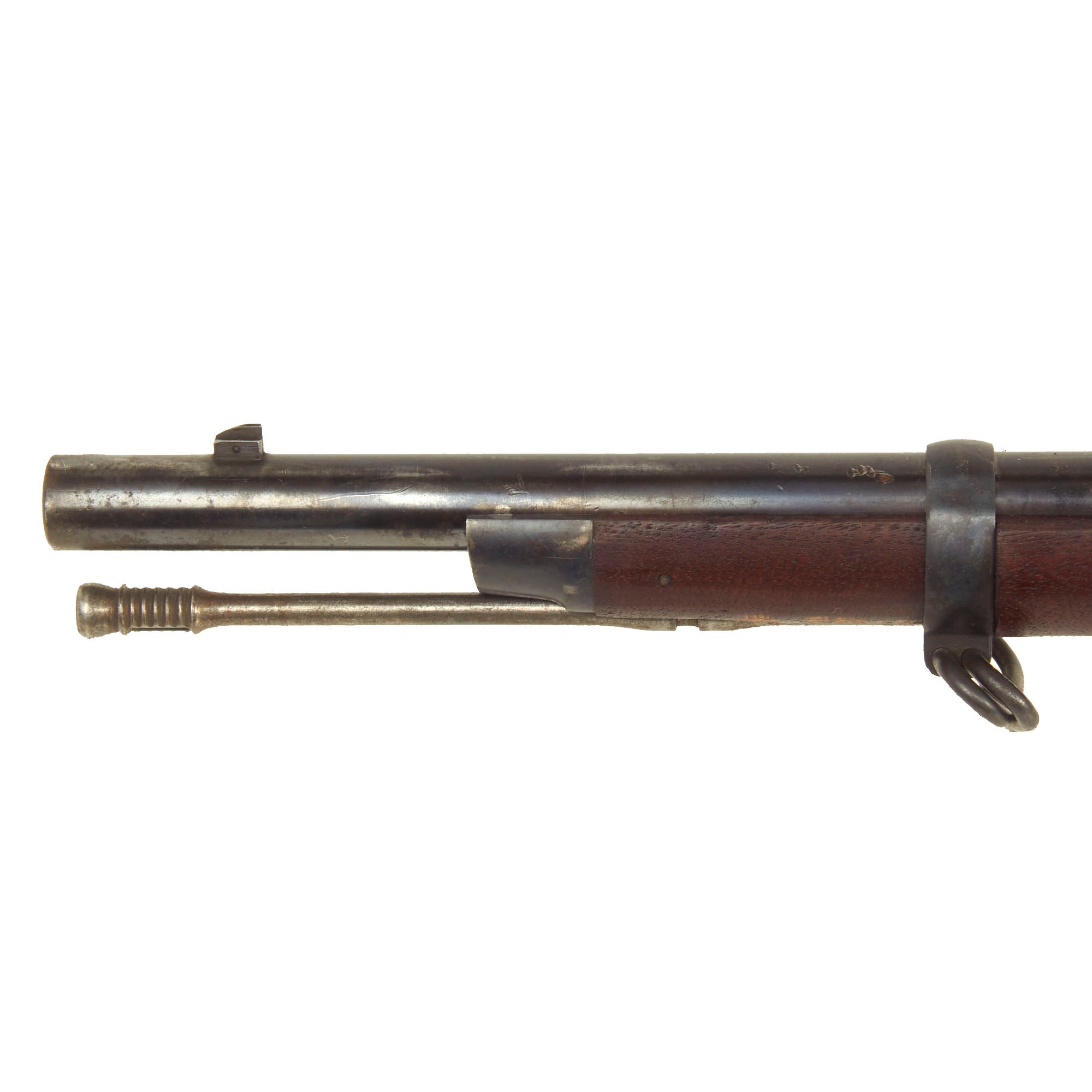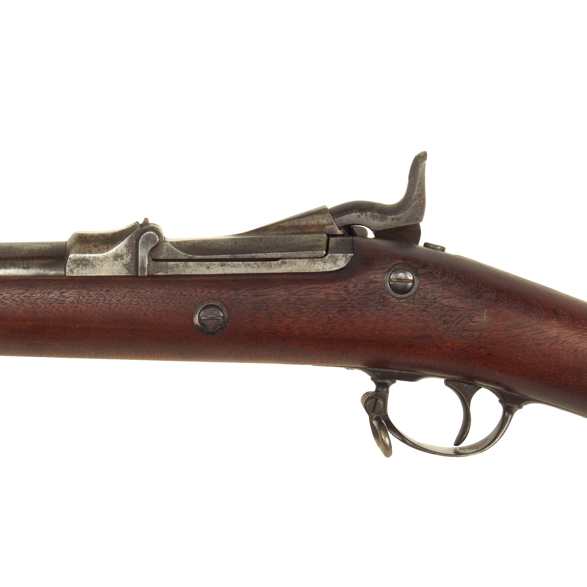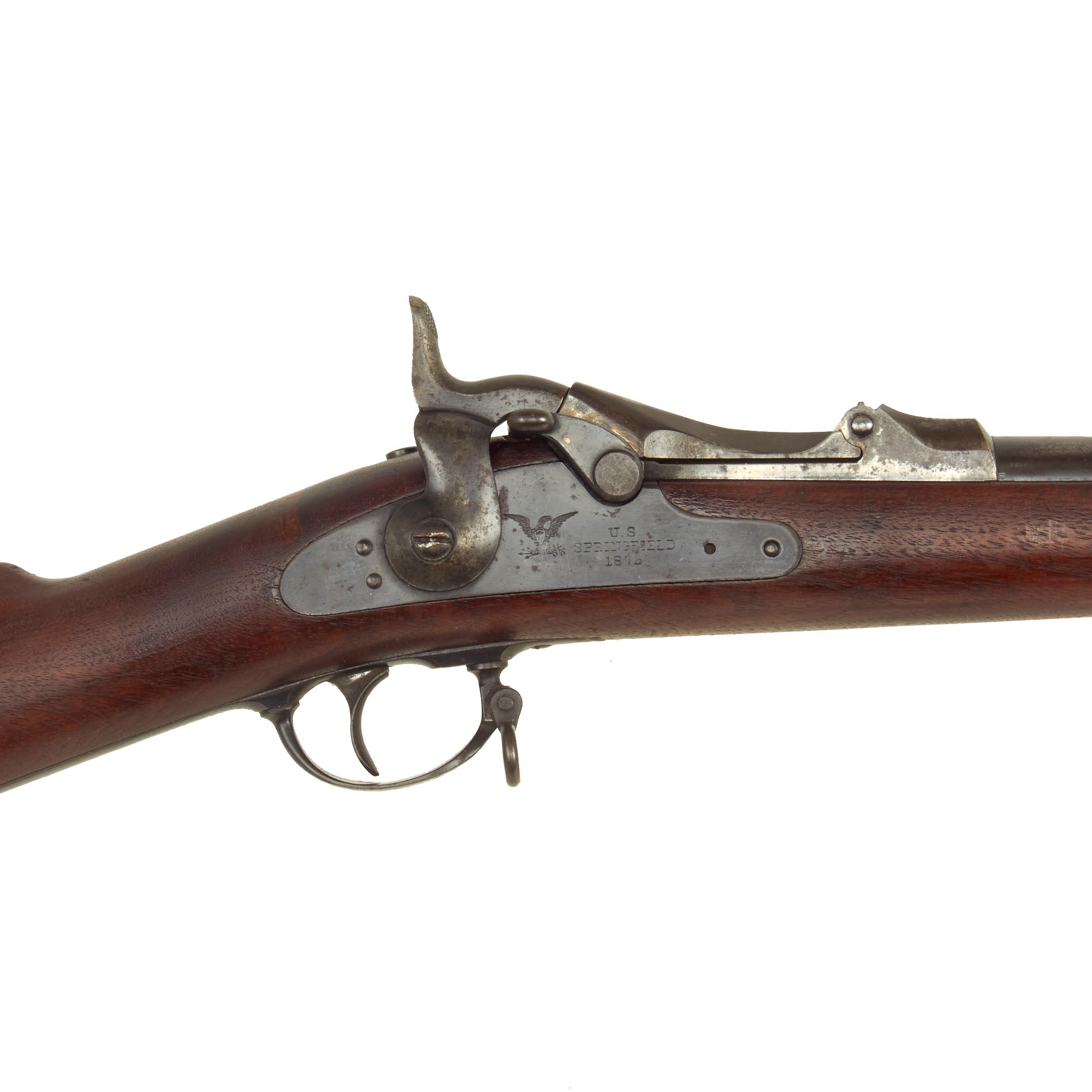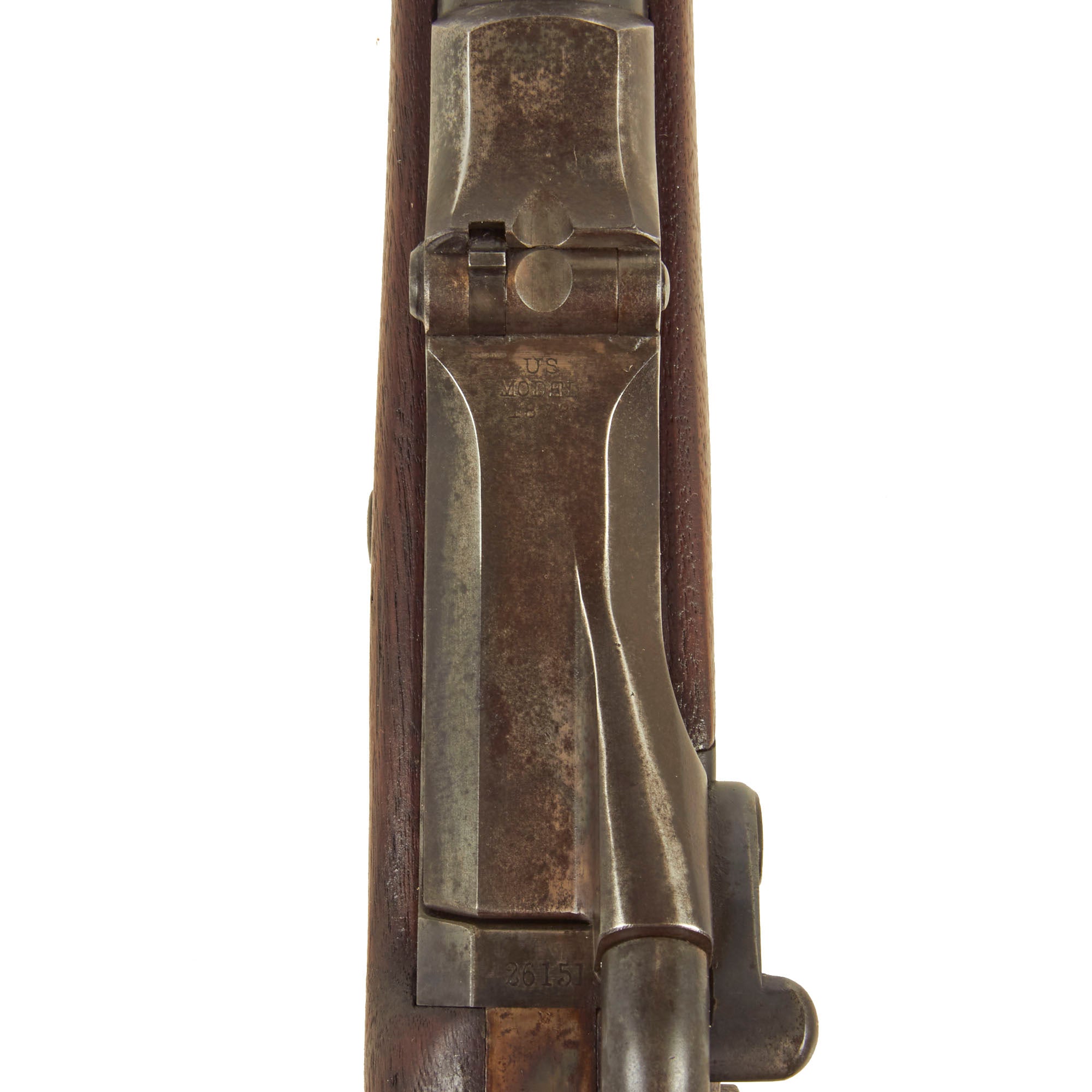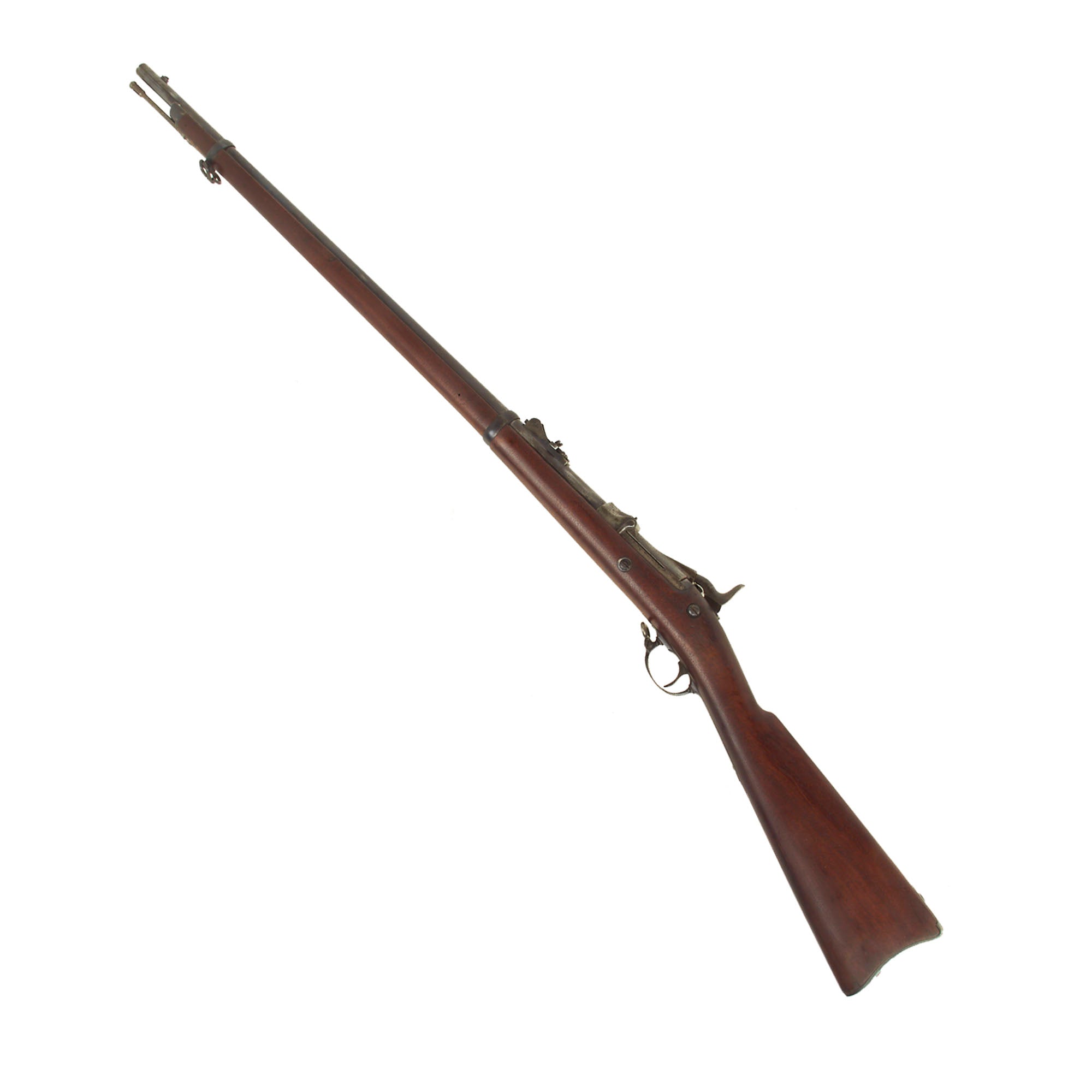 The butt plate is marked U.S. and both barrel bands are U marked. The overall metal finish still shows some of the original bluing, with the balance mostly showing a dark gray oxidized patina. Center fire breechloader, .45 cal., two bands, two sling swivels with stacking swivel, standard model 1879 sliding sight, and an early model 1873 "Enfield Style" ramrod. Lock is marked with a Federal Eagle and U.S. / SPRINGFIELD / 1873, indicating that it was manufactured at the United States Armory and Arsenal at Springfield, in Springfield, Massachusetts. This is an early pattern lock plate, but it has the correct three notch tumbler, and was most likely fit onto this rifle as an arsenal replacement along with the early cleaning rod, which does not have any threads on the end.