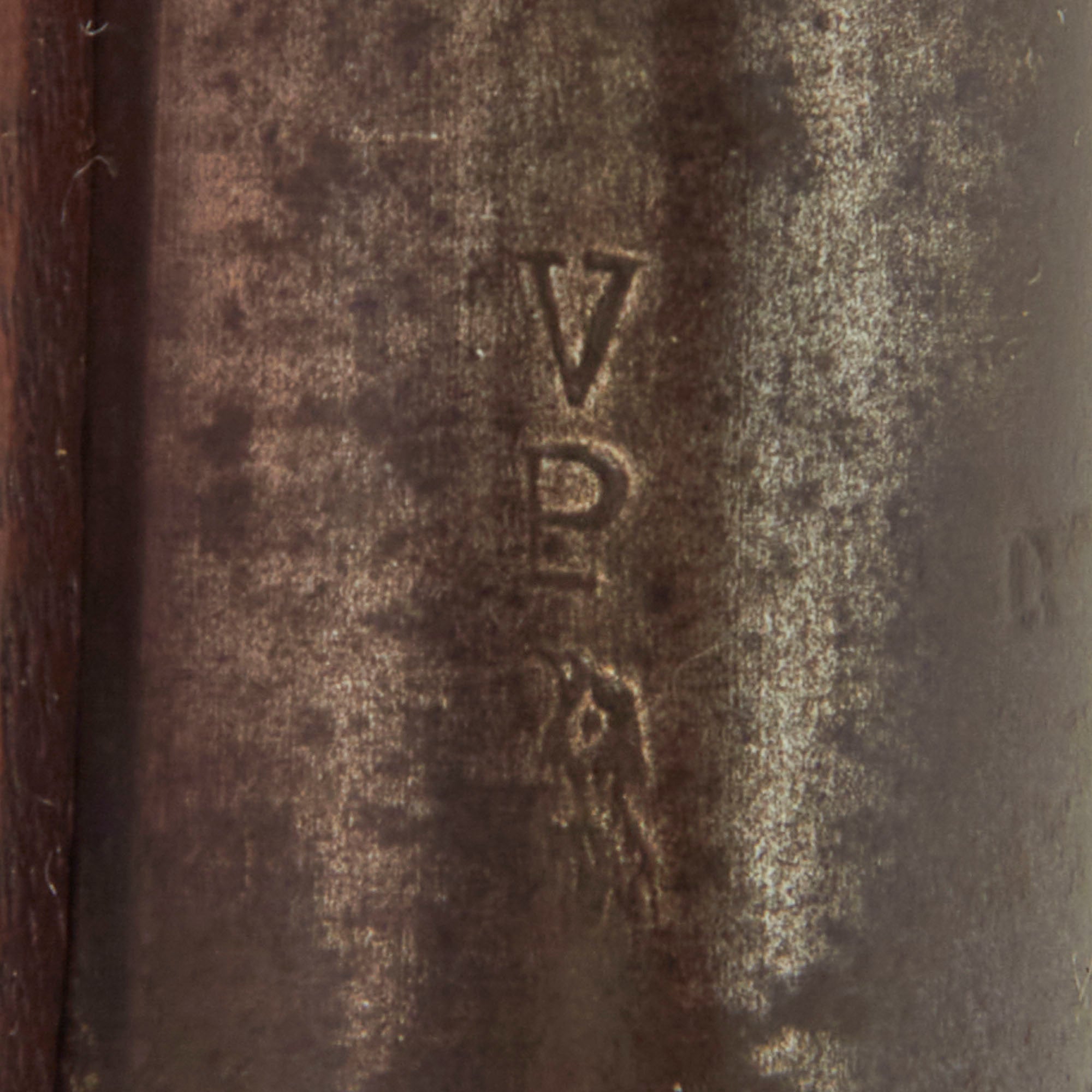 The elegant script SWP belongs to Samuel W. Porter, who was the Master Armorer and Chief Inspector of Springfield Armory from 15 September 1879 to 18 June 1894. The faint stylized P in a circle under the wrist of the stock indicates that the rifle passed all of its overpressure proof testing. Additional marks of interest include inspectors' and proof marks around the breech end of the barrel: a capital R on top; a V over a P over an eagle's head over another P on the left side just above the stock. The upper right corner of the standard M1879 sliding sight leaf and the left side of the ramp are marked R to indicate that the sight graduations are for a rifle and not a carbine.