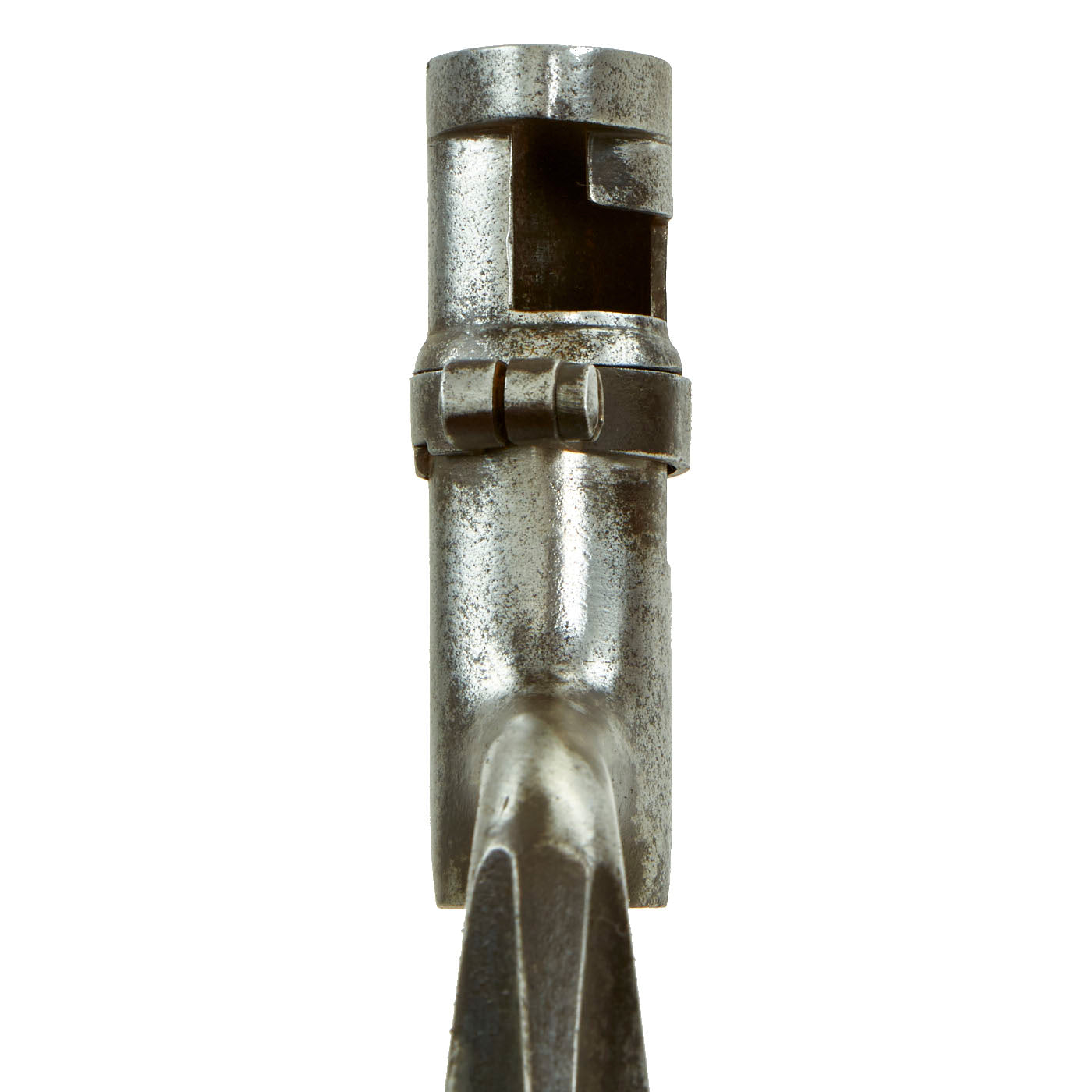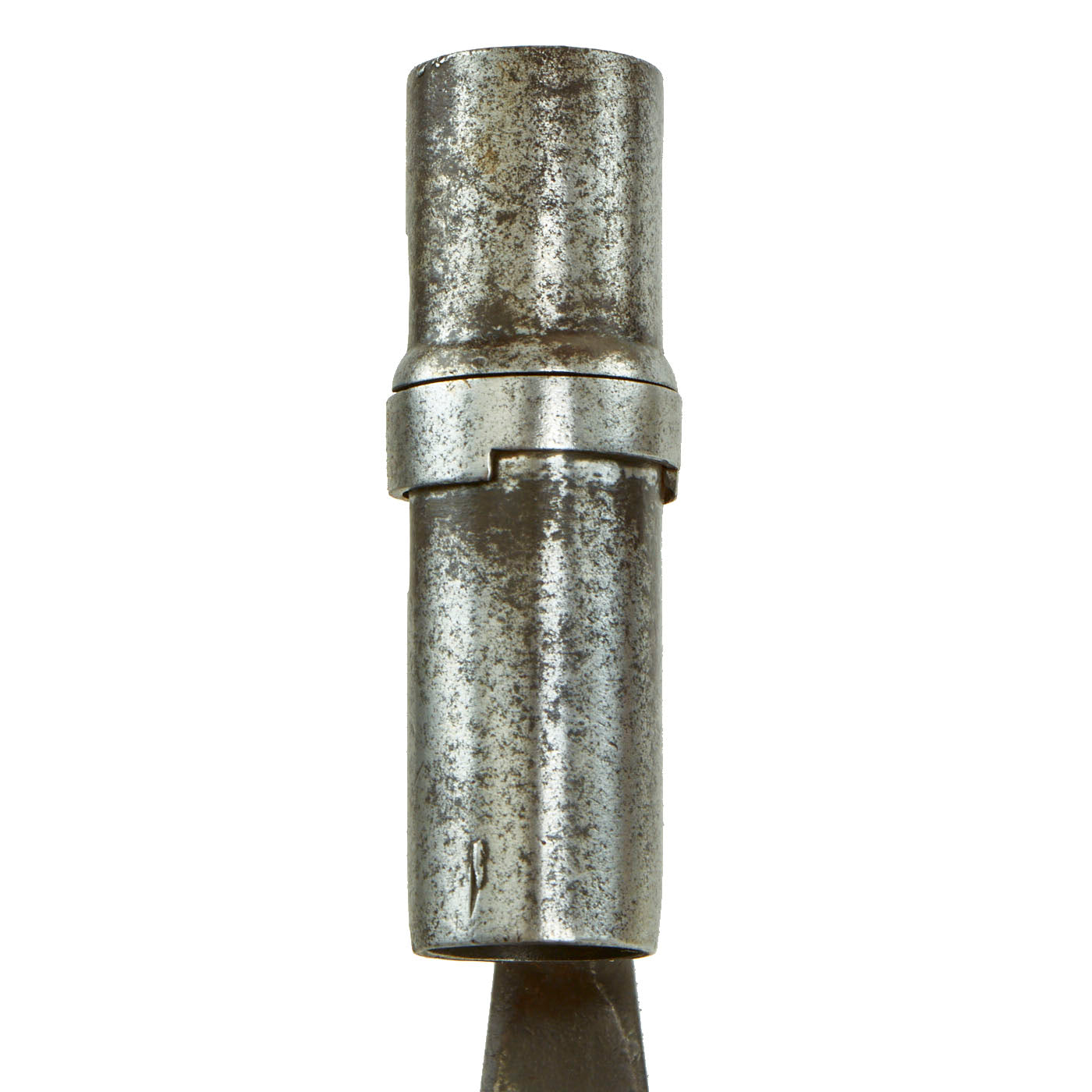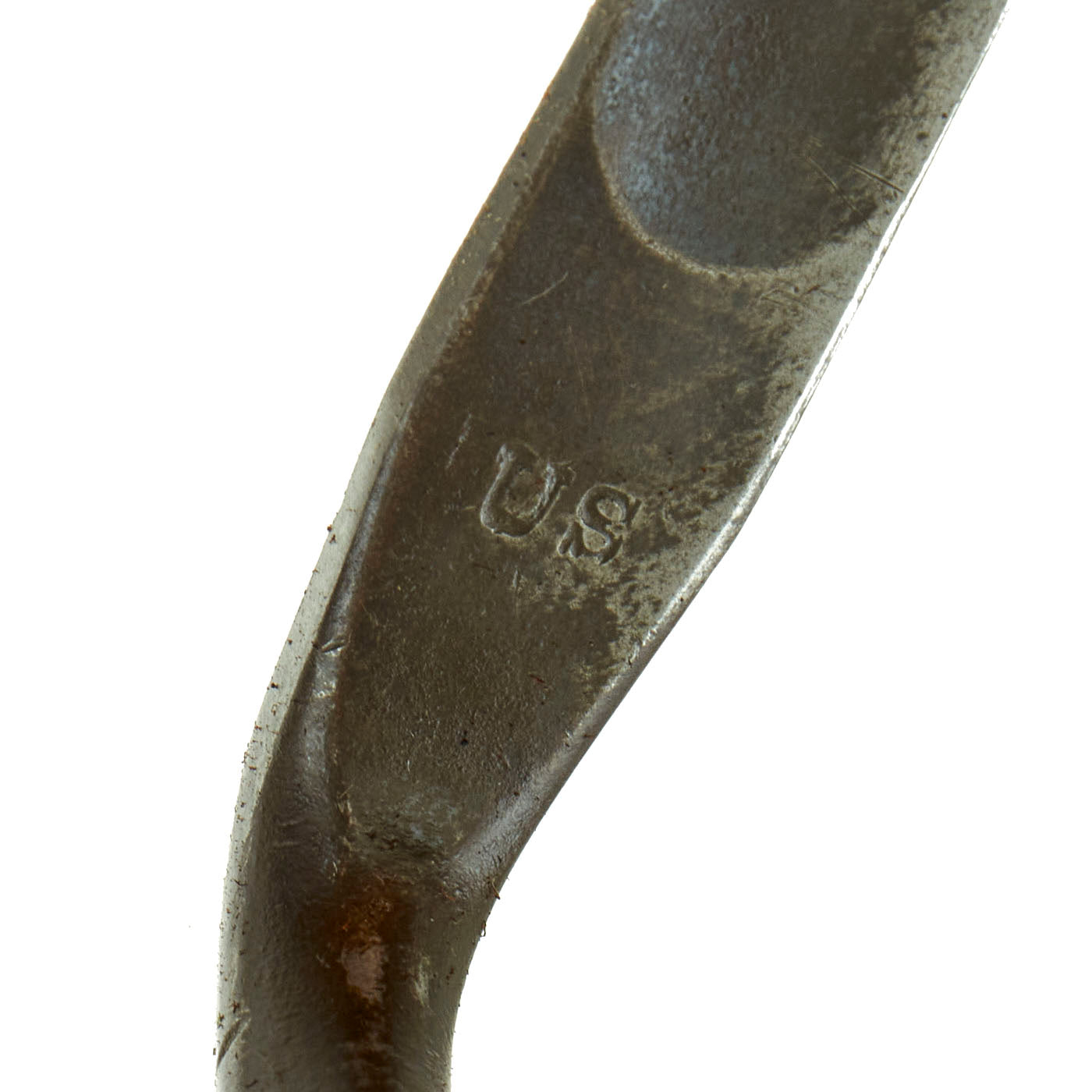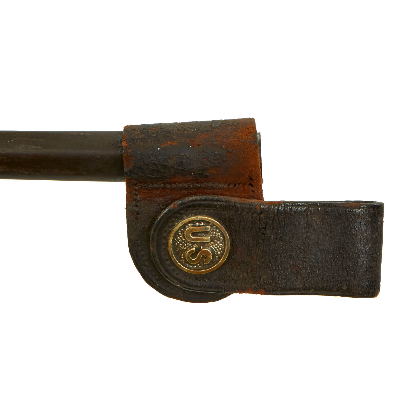 The included socket bayonet is in very good condition, and much of the original blued finish, with a clear U.S. stamp on the ricasso. There are a few areas of light surface rusting on the socket, which is missing most of the finish. The scabbard body is dent free, with a nice worn blue, with some areas of surface rusting towards the bottom. The attached swivel frog is in good condition, with the leather worn and a bit delicate, and the stitching has rotted out in parts. It has a U.S. marked rosette on the hinge joint with the leather belt loop. There is an arsenal marking on the frog, but we cannot make out what it says.