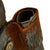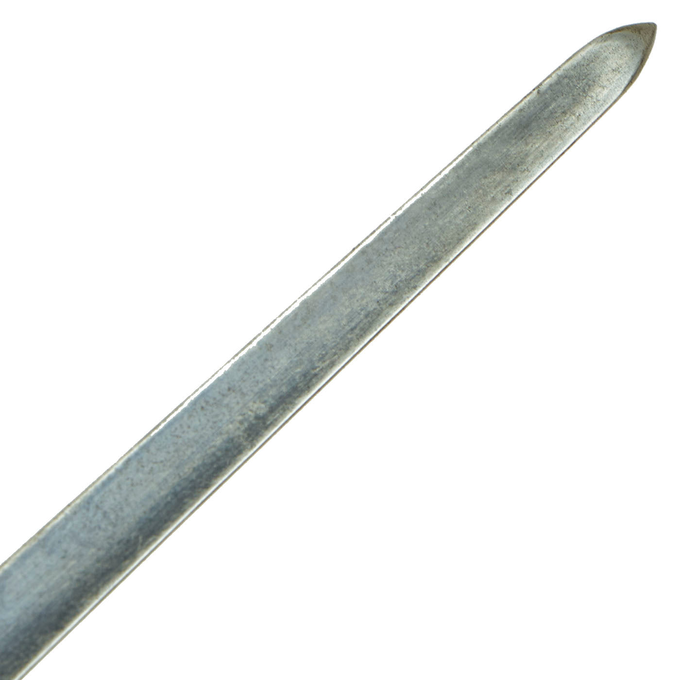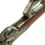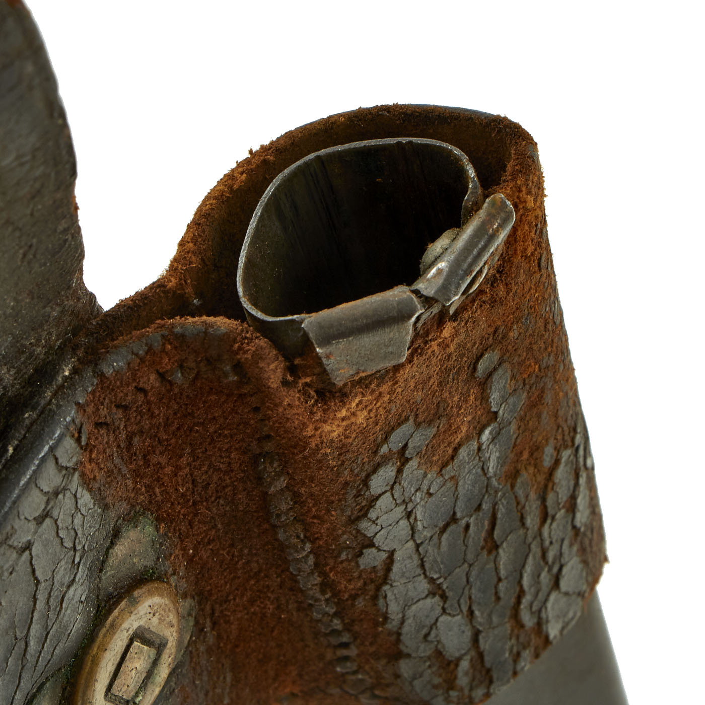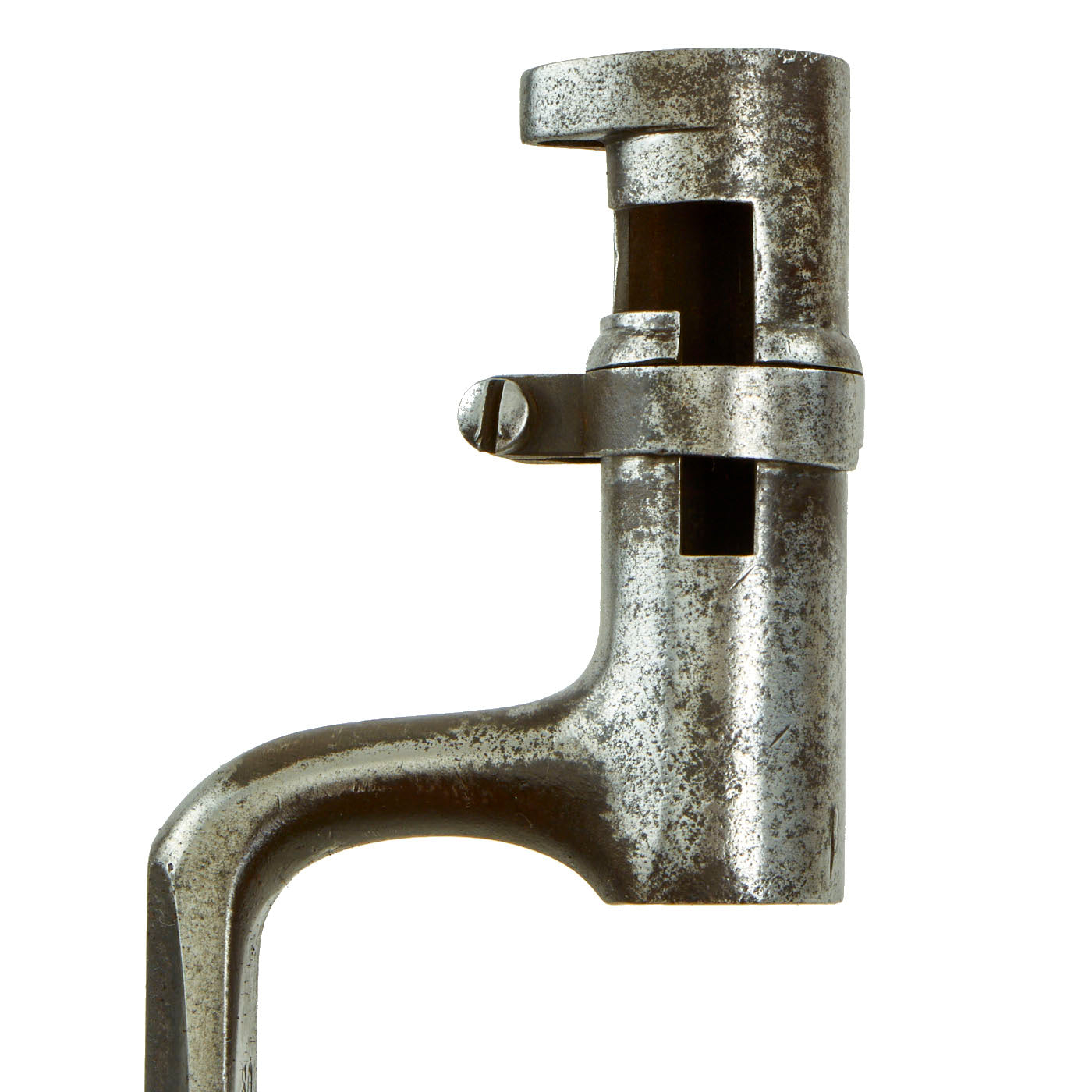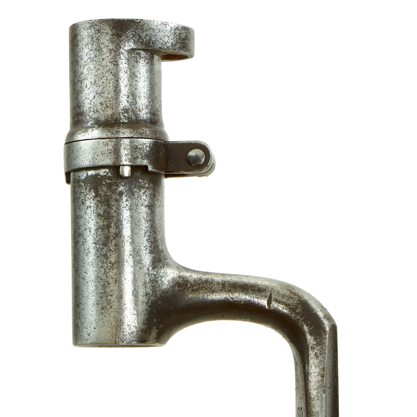The included socket bayonet is in very good condition, and much of the original blued finish, with a clear U.S. stamp on the ricasso. There are a few areas of light surface rusting on the socket, which is missing most of the finish. The scabbard body is dent free, with a nice worn blue, with some areas of surface rusting towards the bottom. The attached swivel frog is in good condition, with the leather worn and a bit delicate, and the stitching has rotted out in parts. It has a U.S. marked rosette on the hinge joint with the leather belt loop. There is an arsenal marking on the frog, but we cannot make out what it says.