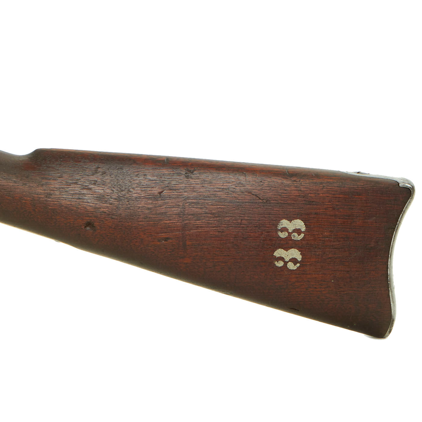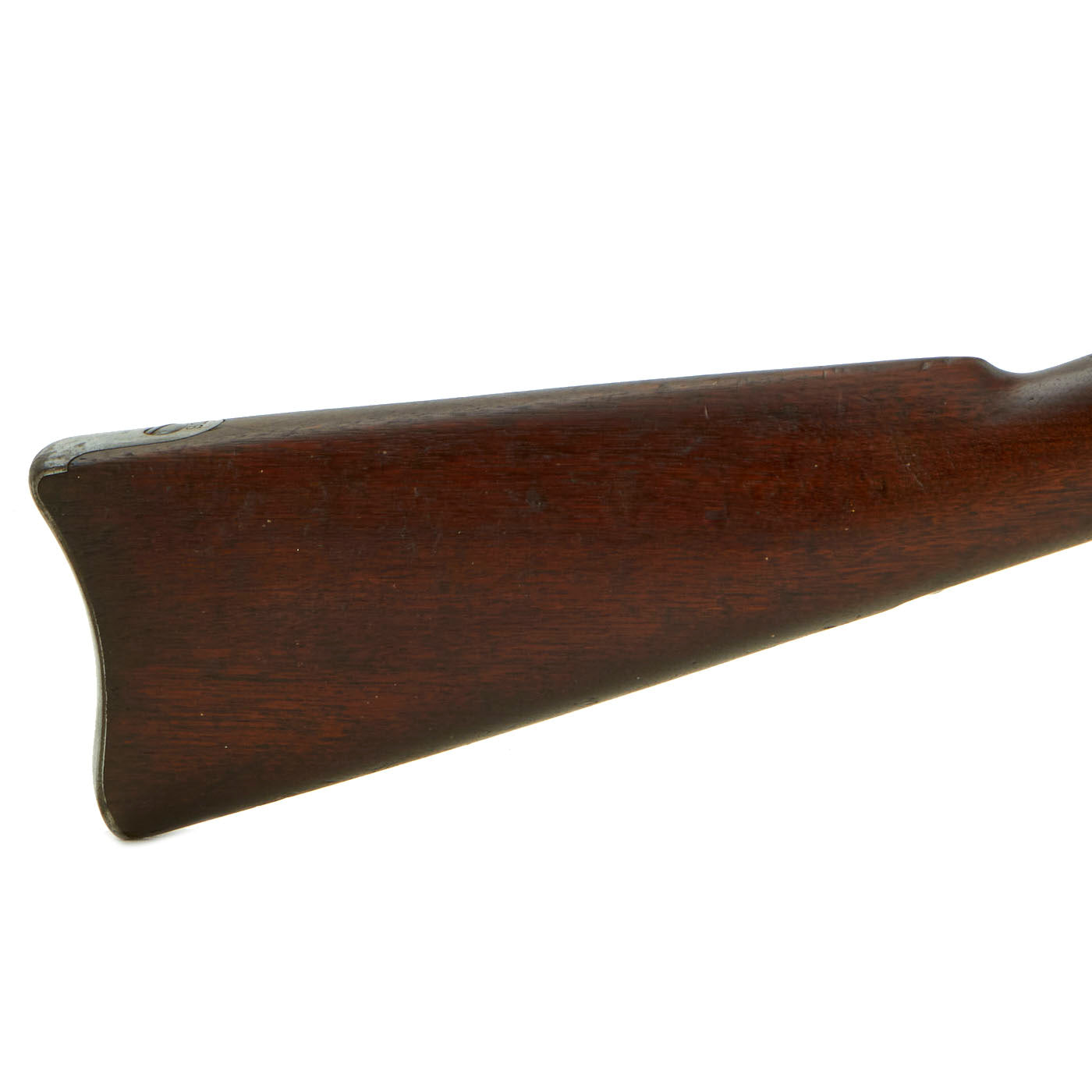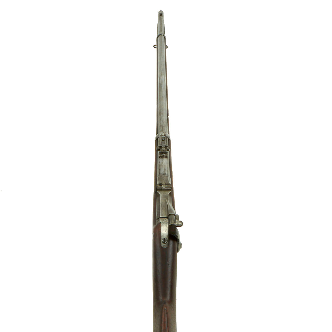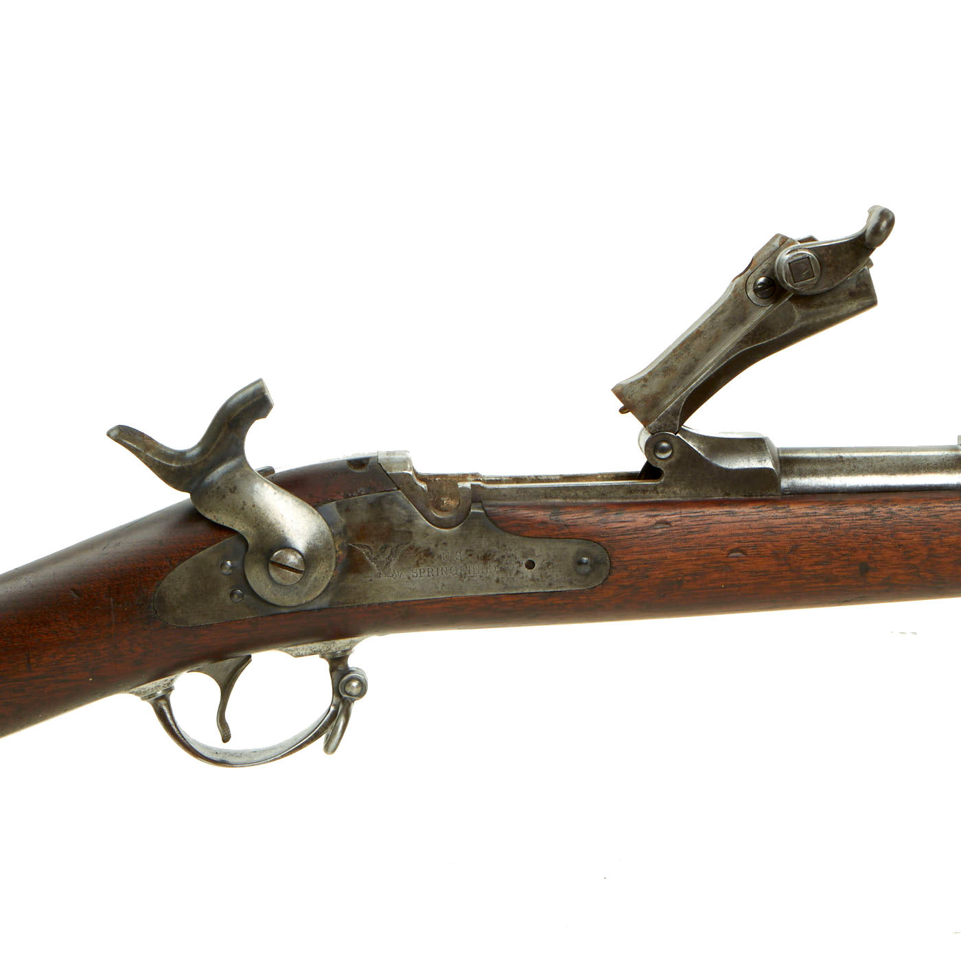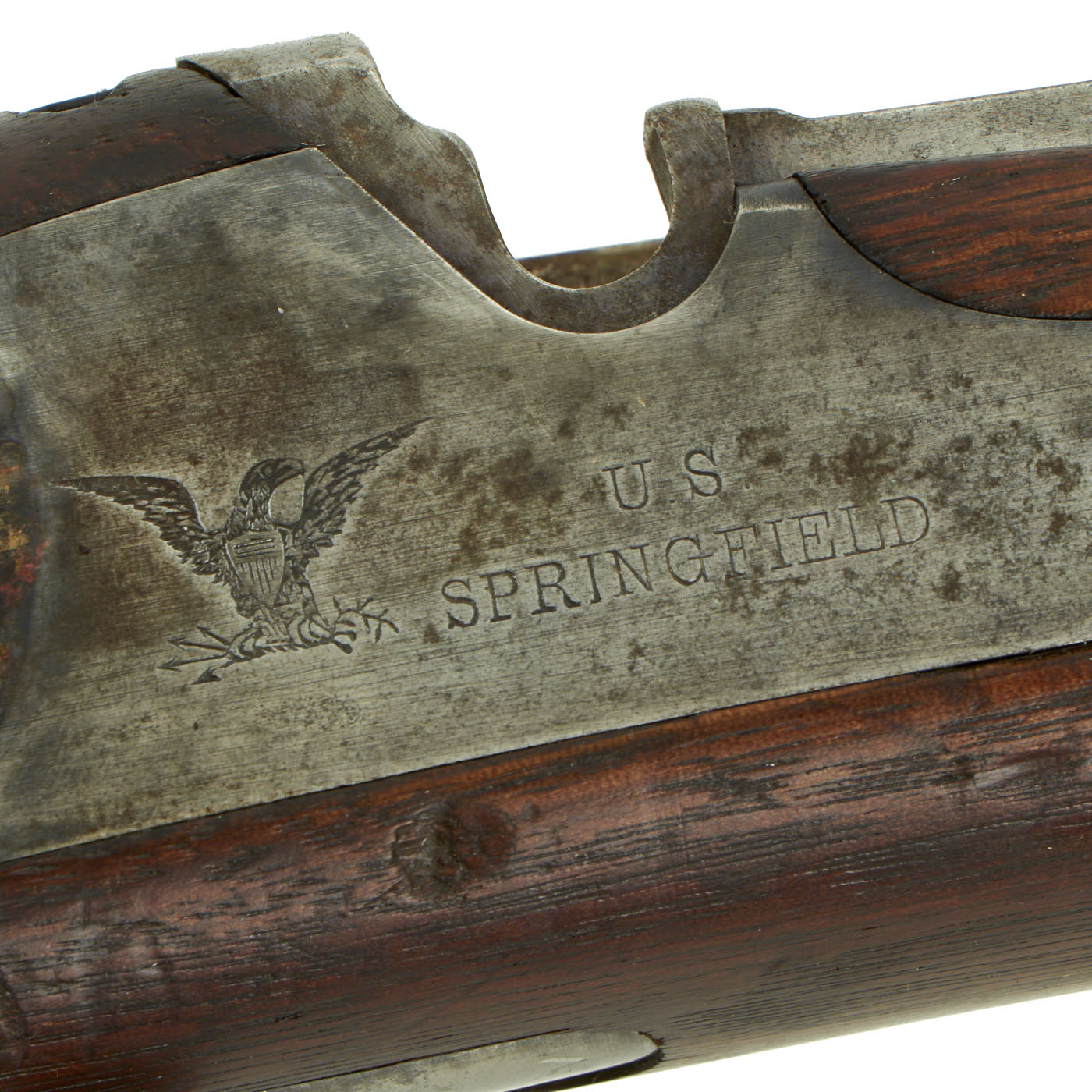 The bore is in very good condition, probably rating a 9 out of 10, showing crisp land and grooves with a bright finish. There is just a bit of oxidation in places, particularly near the muzzle. The ejector is present, and functions correctly, though we have not tested it with real brass. Metal finish is a nice light gray patina, showing years of careful cleaning, with a bit of peppering in places. Center fire breechloader, .45 cal., two bands, two sling swivels with stacking swivel, standard sliding sight, and standard ramrod. Lock is marked with an eagle and US SPRINGFIELD, manufactured by Springfield Armory, Springfield Massachusetts. The butt plate is marked U.S. and both barrel bands are U marked.