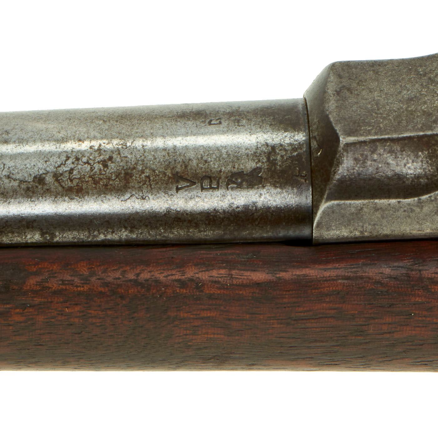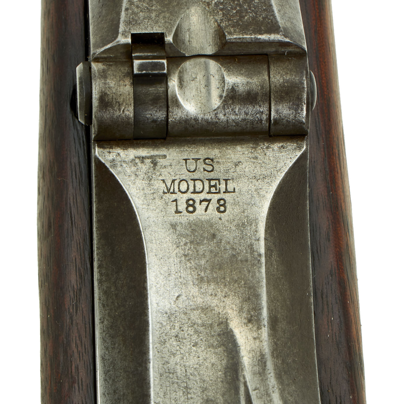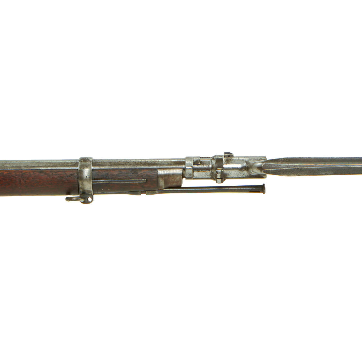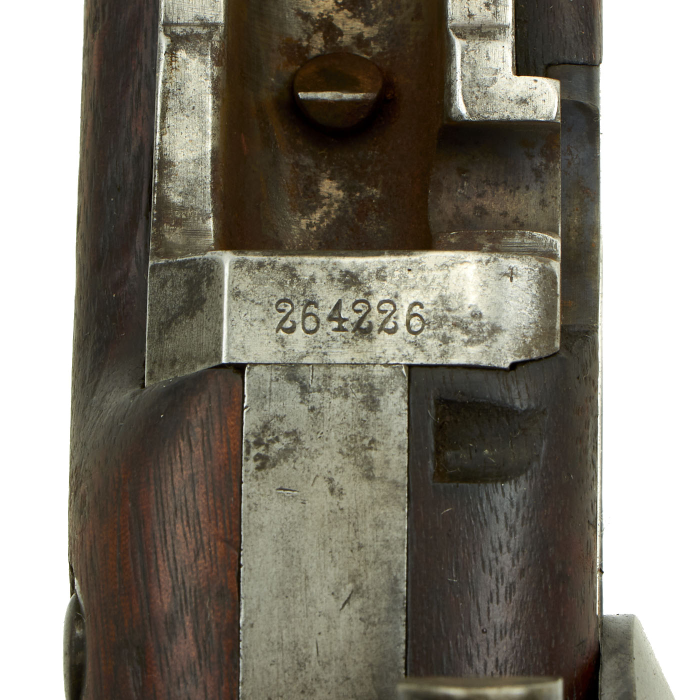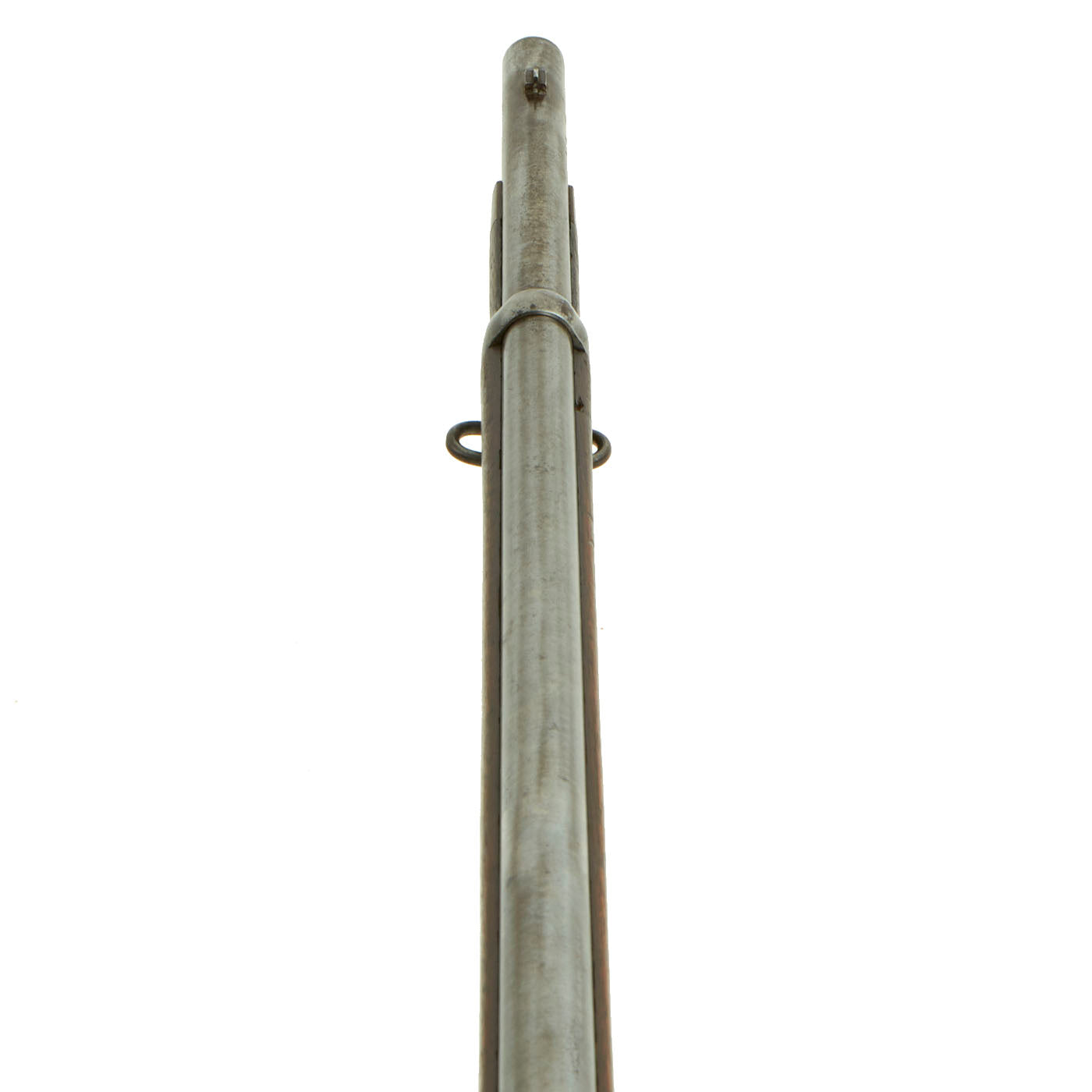 The bore is in very good condition, probably rating a 9 out of 10, showing crisp land and grooves with a bright finish. There is just a bit of oxidation in places, particularly near the muzzle. The ejector is present, and functions correctly, though we have not tested it with real brass. Metal finish is a nice light gray patina, showing years of careful cleaning, with a bit of peppering in places. Center fire breechloader, .45 cal., two bands, two sling swivels with stacking swivel, standard sliding sight, and standard ramrod. Lock is marked with an eagle and US SPRINGFIELD, manufactured by Springfield Armory, Springfield Massachusetts. The butt plate is marked U.S. and both barrel bands are U marked.