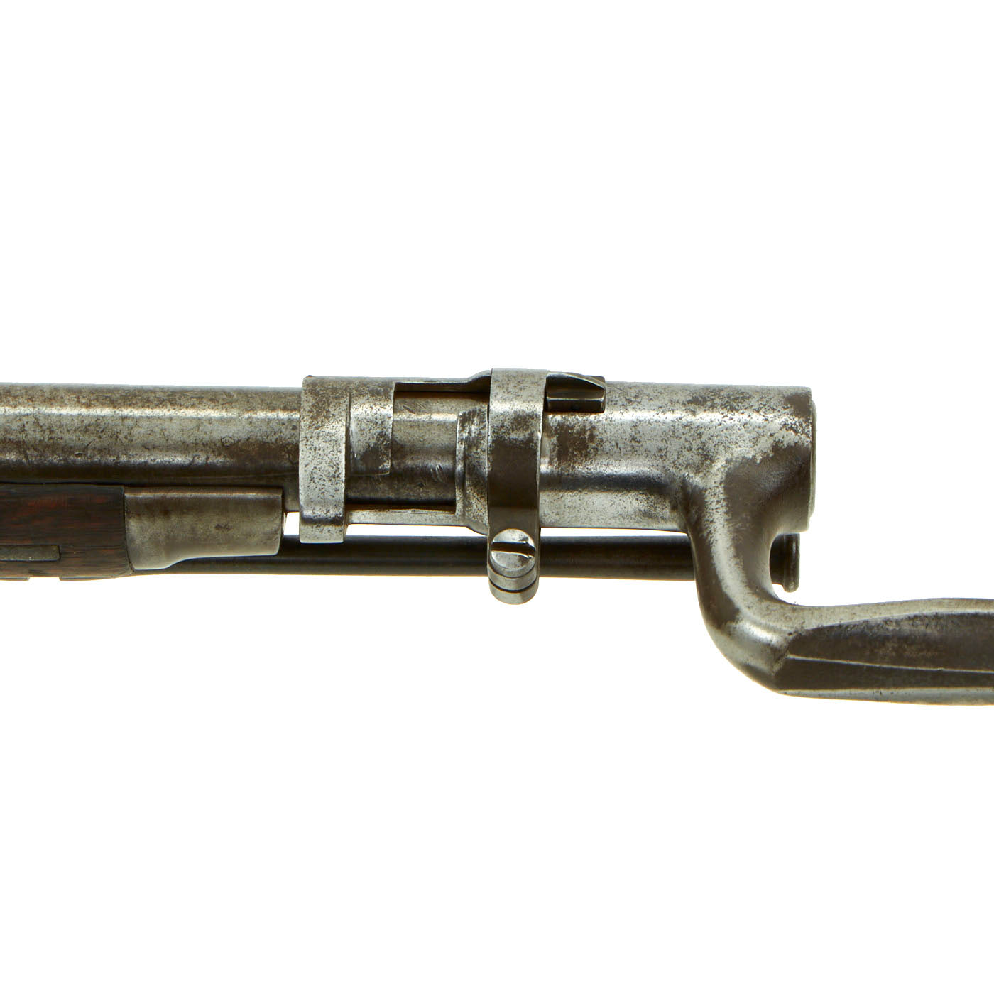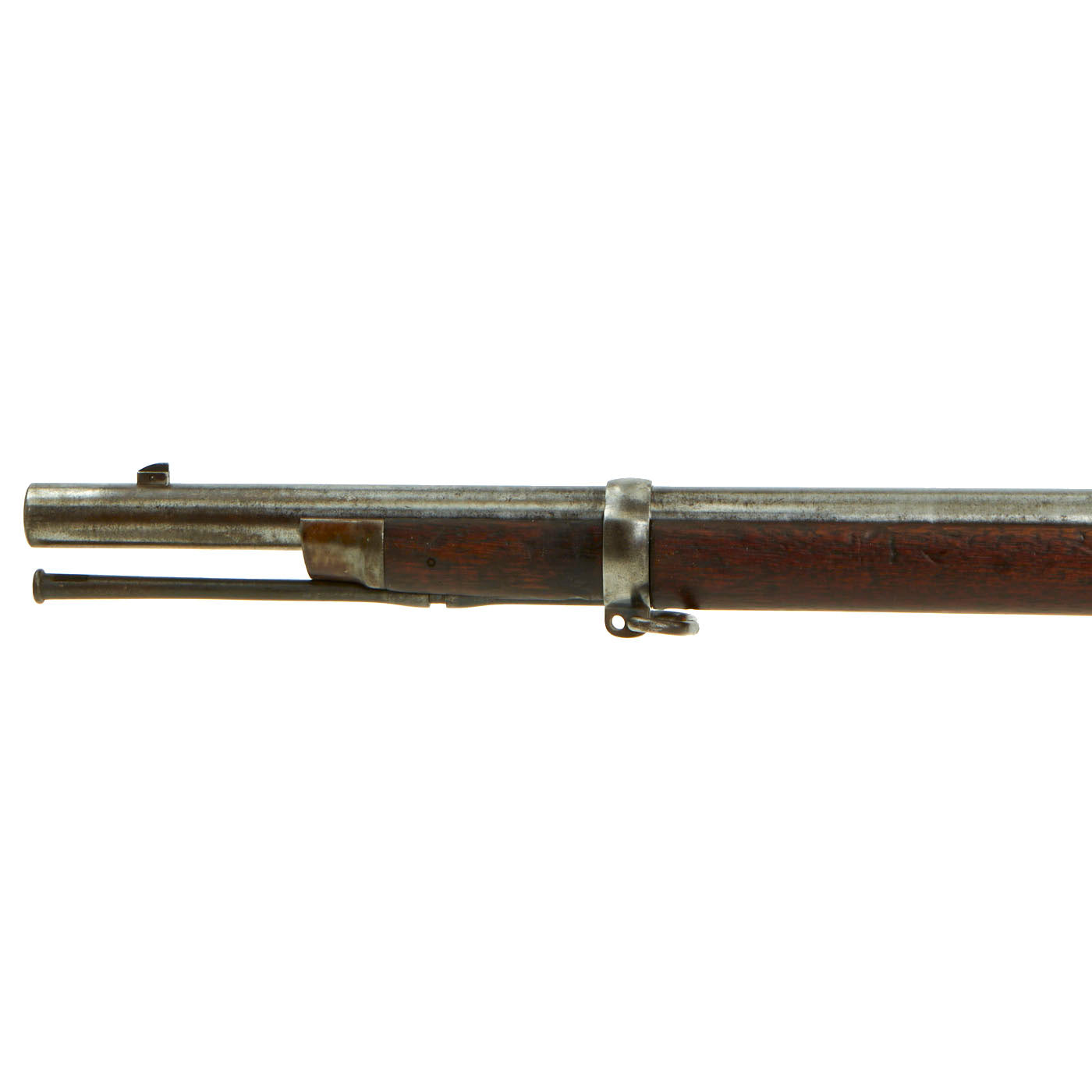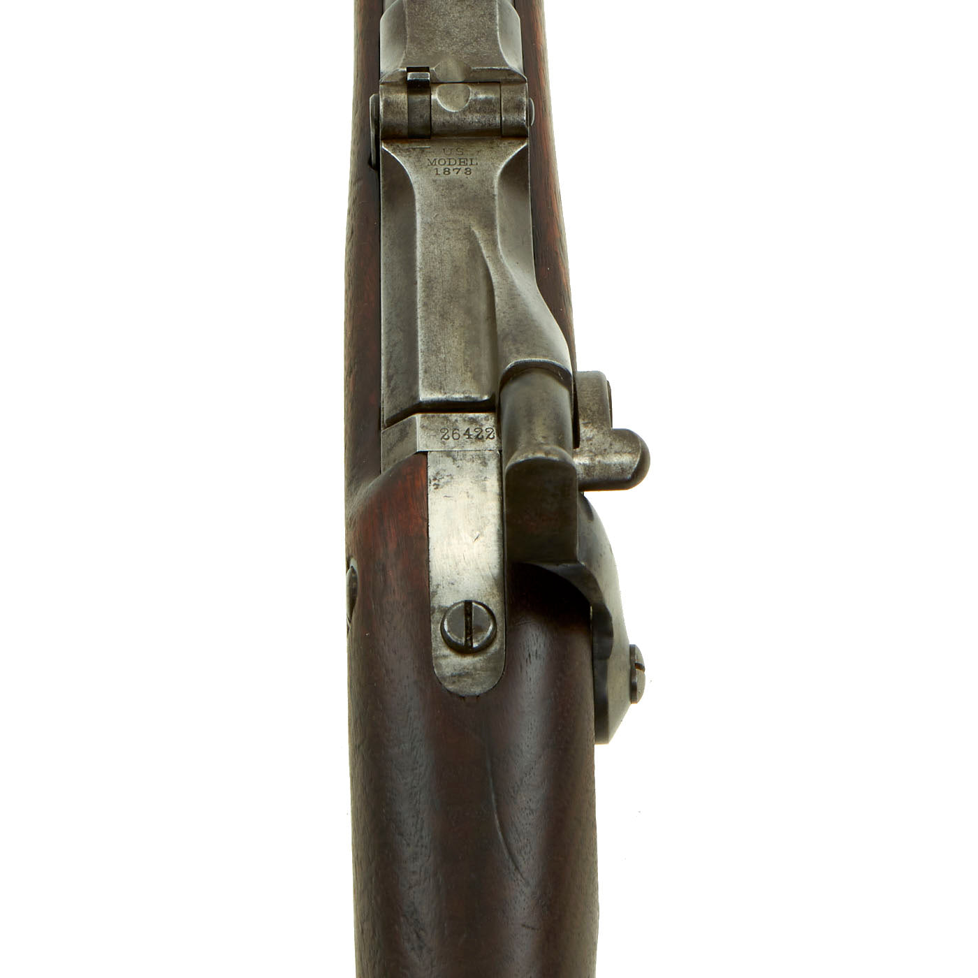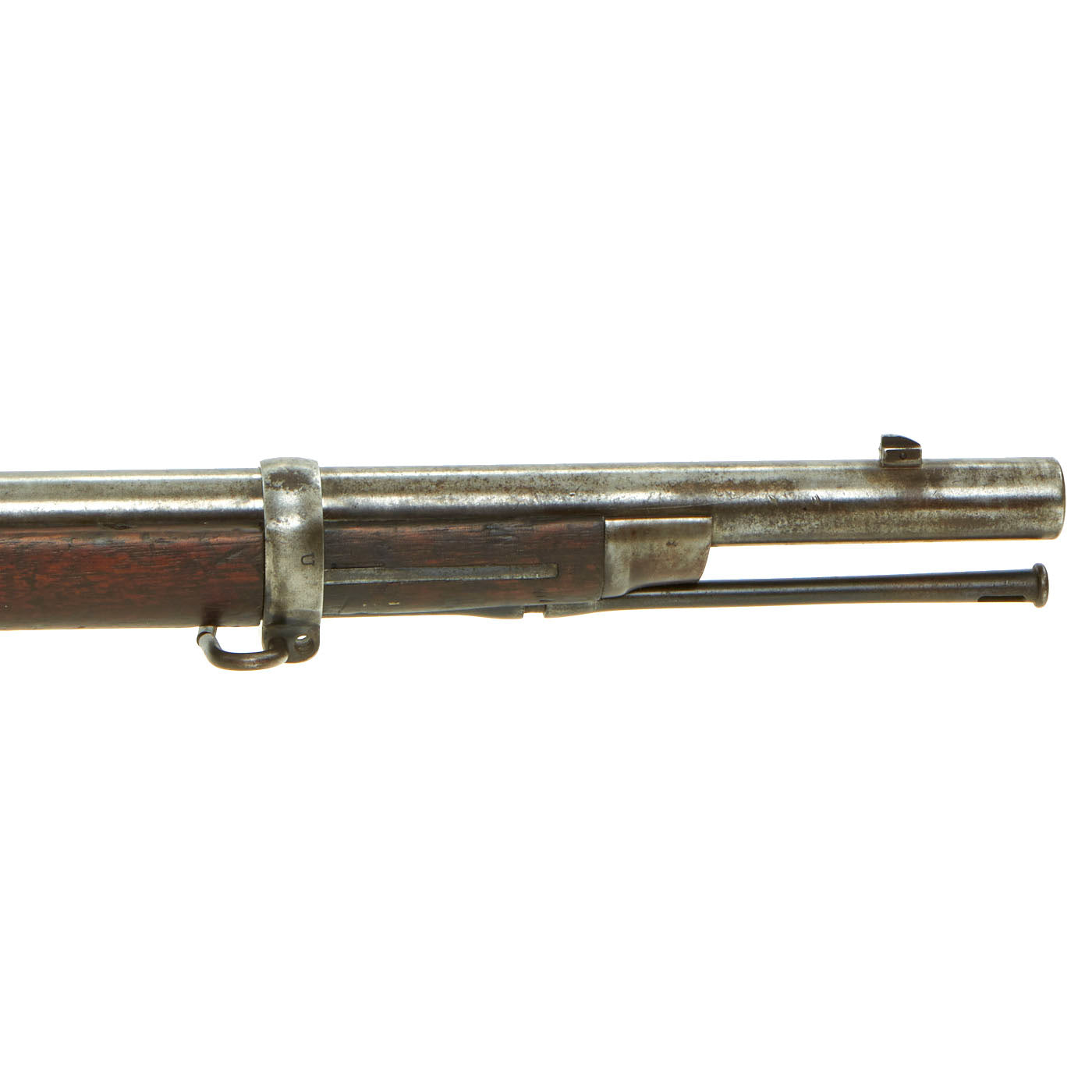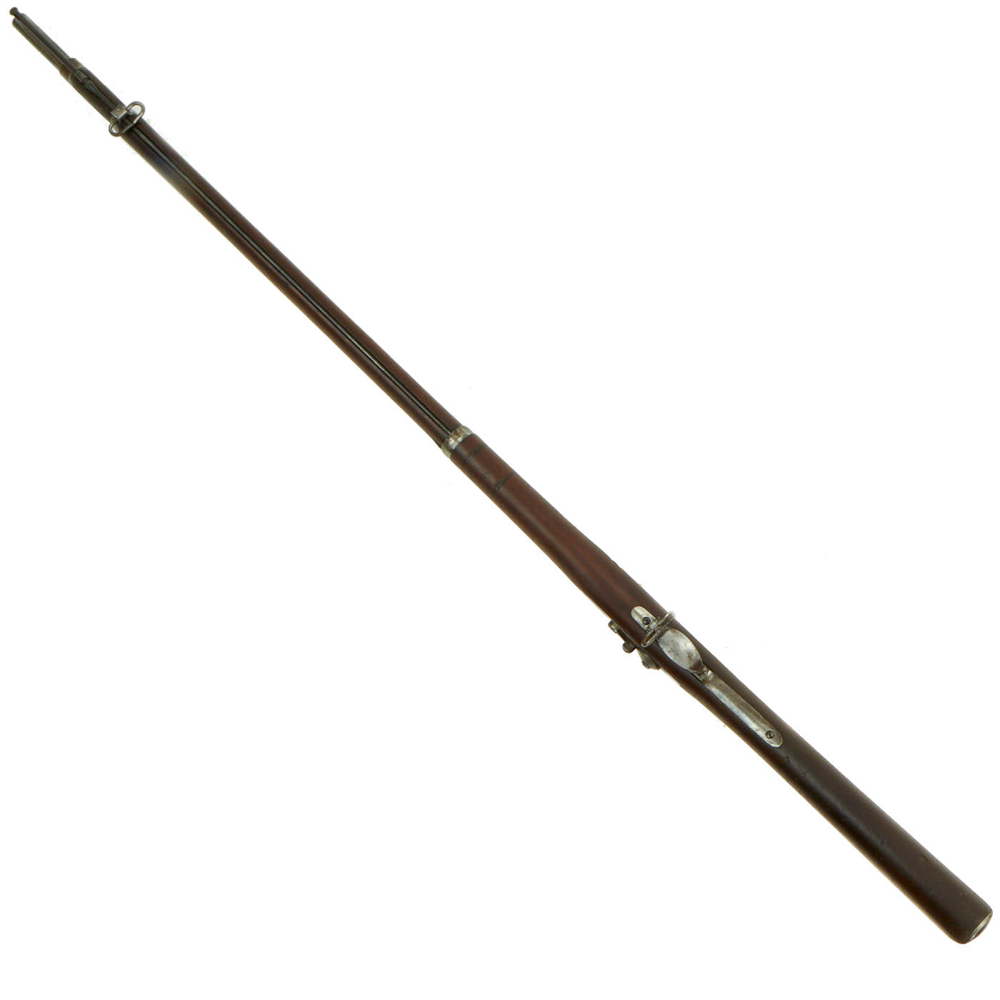 The bore is in very good condition, probably rating a 9 out of 10, showing crisp land and grooves with a bright finish. There is just a bit of oxidation in places, particularly near the muzzle. The ejector is present, and functions correctly, though we have not tested it with real brass. Metal finish is a nice light gray patina, showing years of careful cleaning, with a bit of peppering in places. Center fire breechloader, .45 cal., two bands, two sling swivels with stacking swivel, standard sliding sight, and standard ramrod. Lock is marked with an eagle and US SPRINGFIELD, manufactured by Springfield Armory, Springfield Massachusetts. The butt plate is marked U.S. and both barrel bands are U marked.