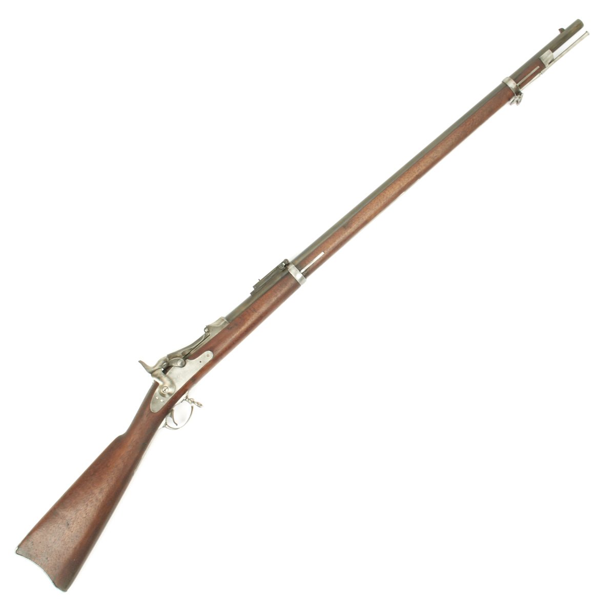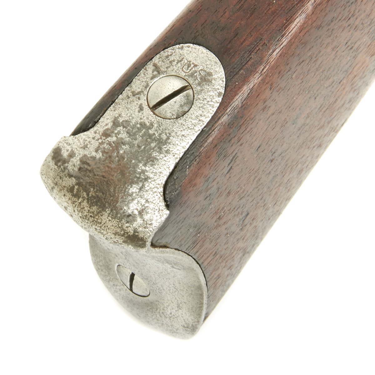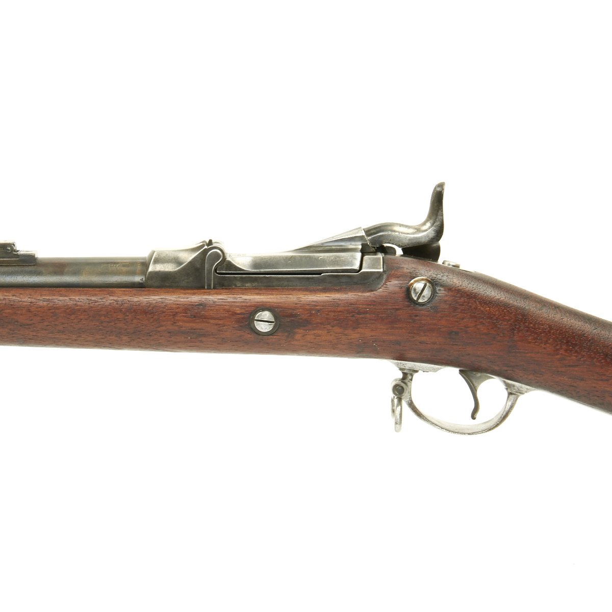 The butt plate is marked "U.S." and both barrel bands are "U" marked. Center fire breechloader, .45 cal., Buffington adjustable rear sight, two bands, two sling swivels, standard sliding sight, and standard ramrod. Lock is marked with an eagle and "US SPRINGFIELD", manufactured by Springfield Armory, Springfield Massachusetts.
