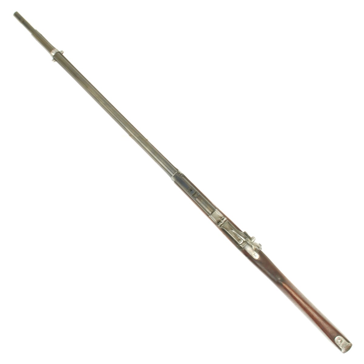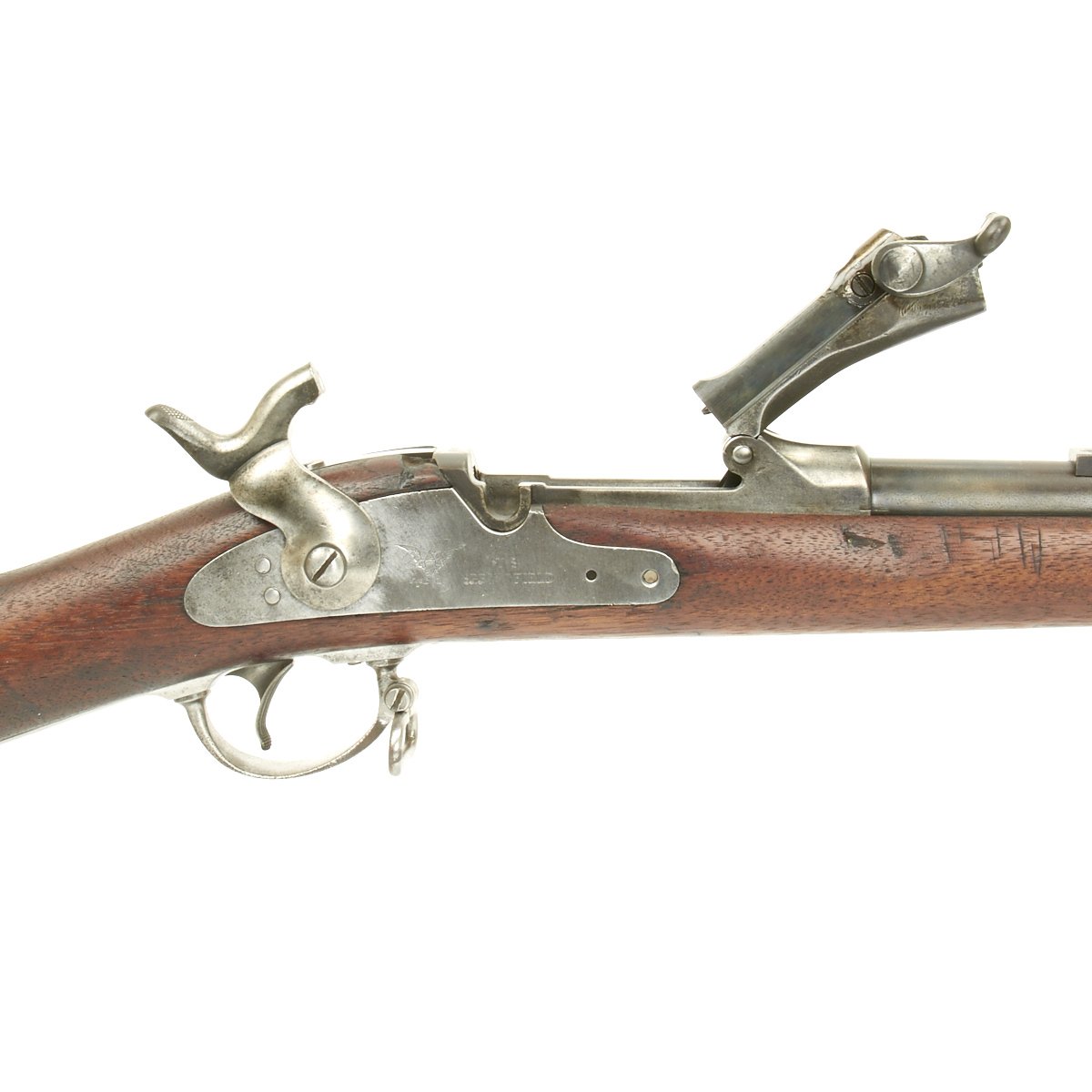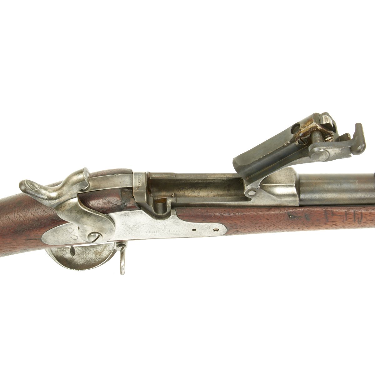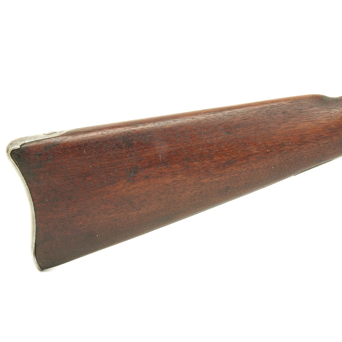 The butt plate is marked "U.S." and both barrel bands are "U" marked. Center fire breechloader, .45 cal., Buffington adjustable rear sight, two bands, two sling swivels, standard sliding sight, and standard ramrod. Lock is marked with an eagle and "US SPRINGFIELD", manufactured by Springfield Armory, Springfield Massachusetts.