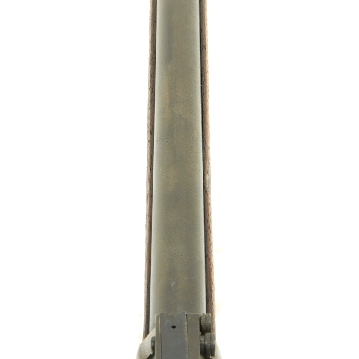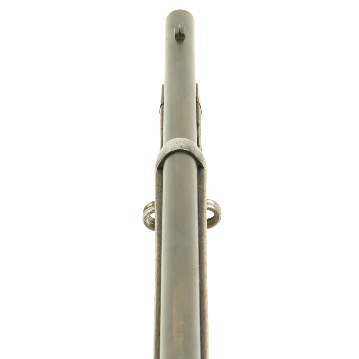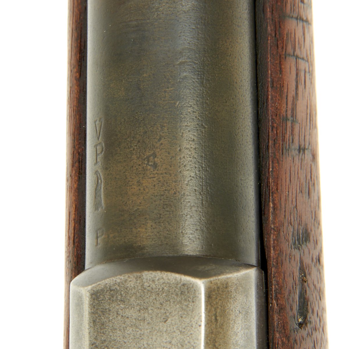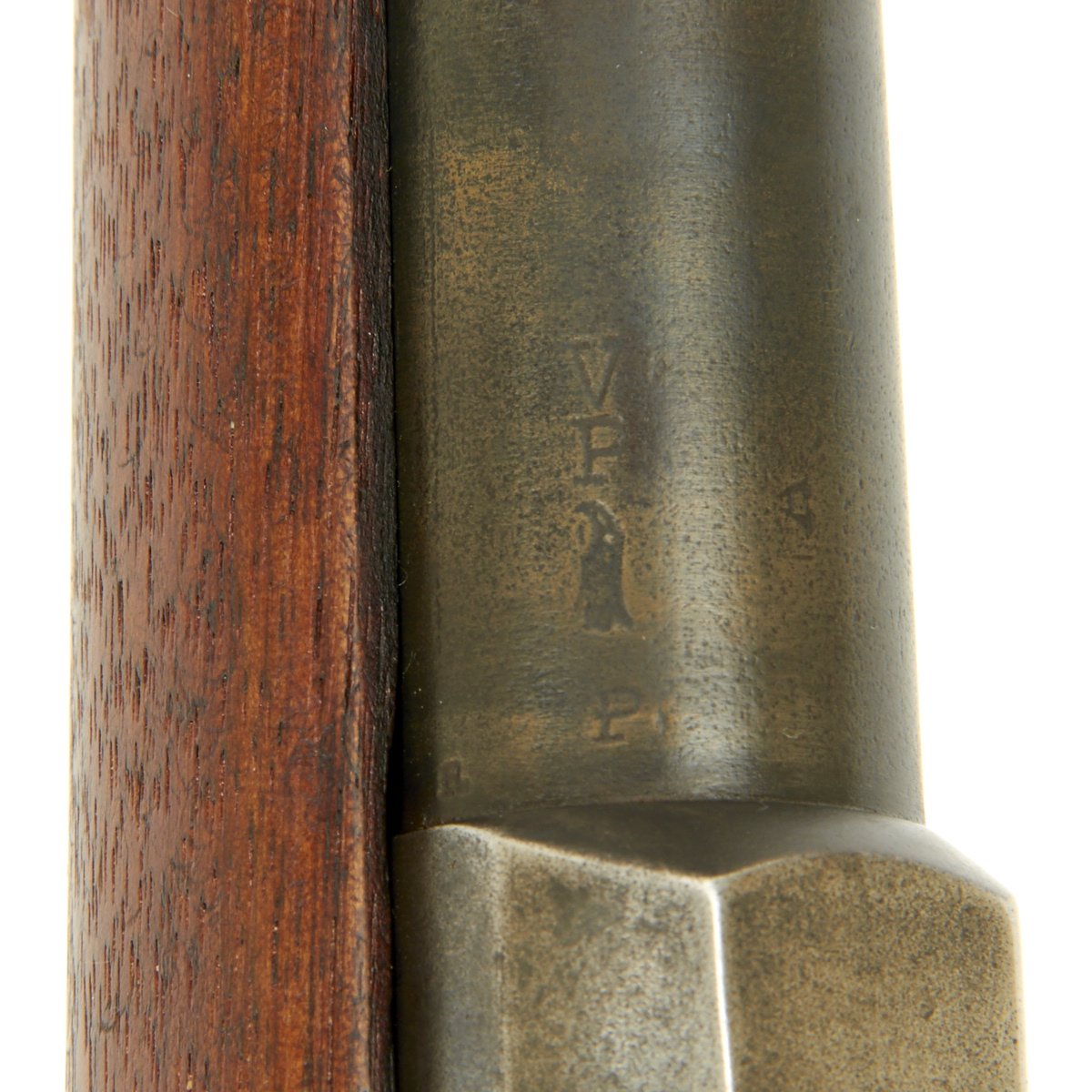Additional marks of interest include inspectors' and proof marks around the breech end of the barrel: a capital A on top; and a V over a P over an eagle's head over another P on the left side just above the stock. The upper right corner of the Buffington sight leaf is marked R to indicate that the sight graduations are for a rifle and not a carbine.