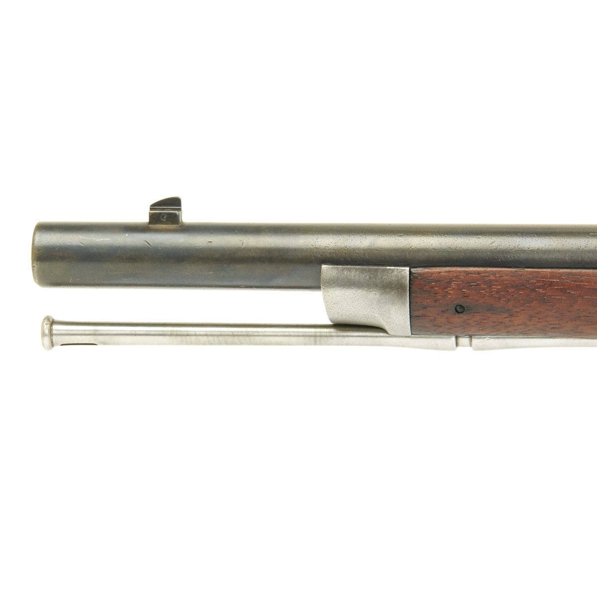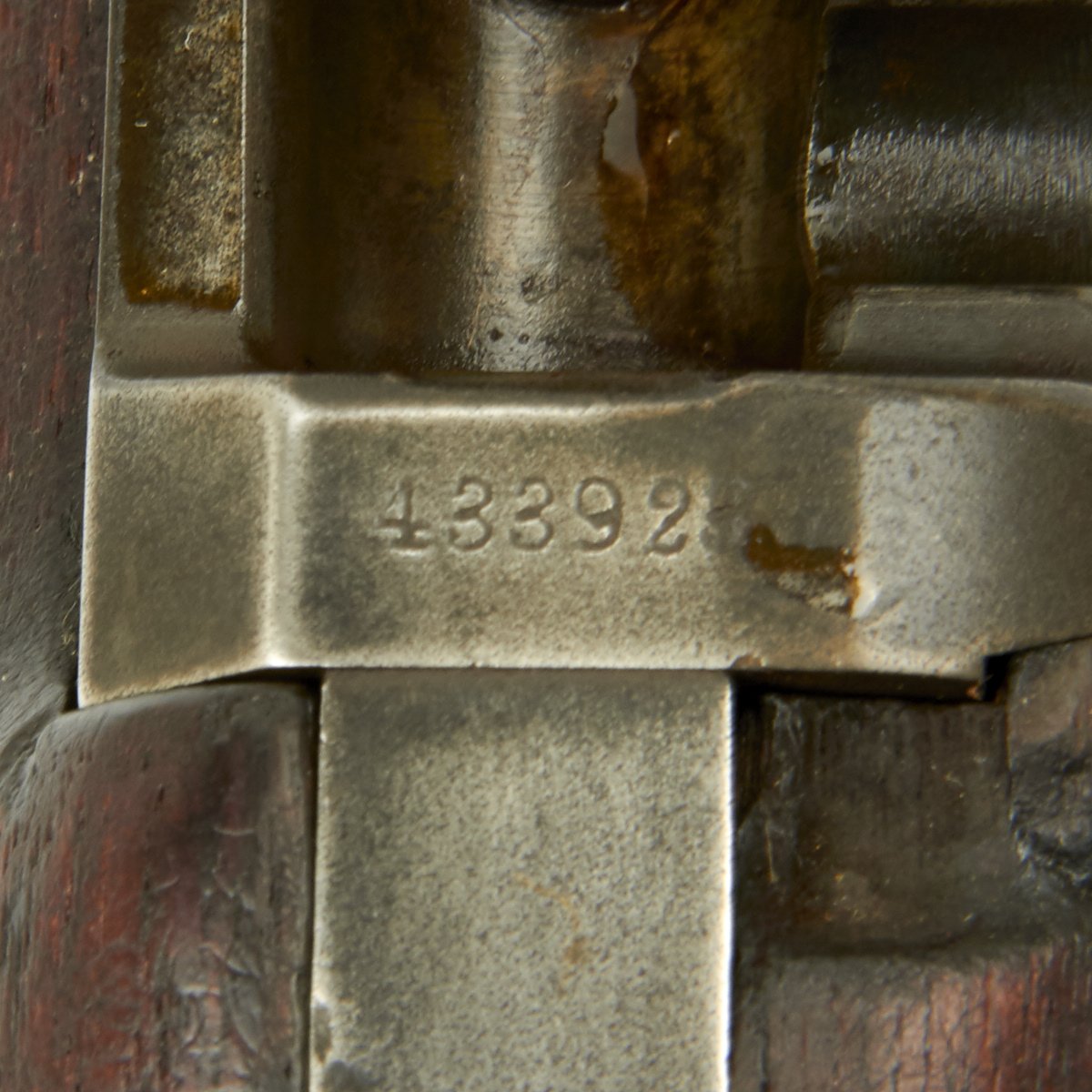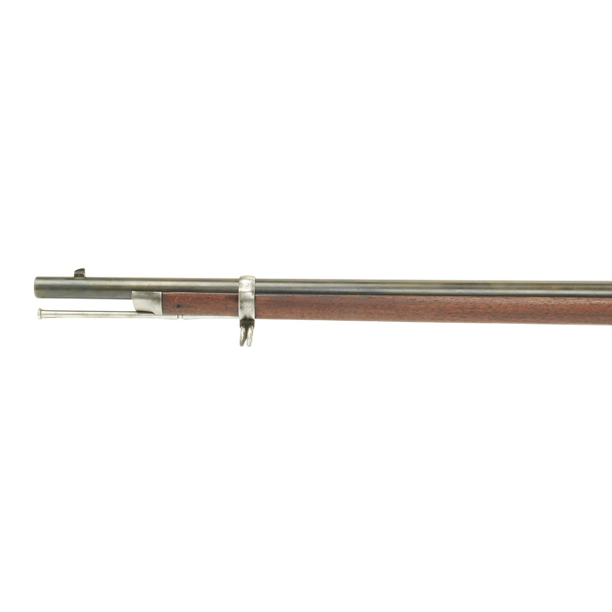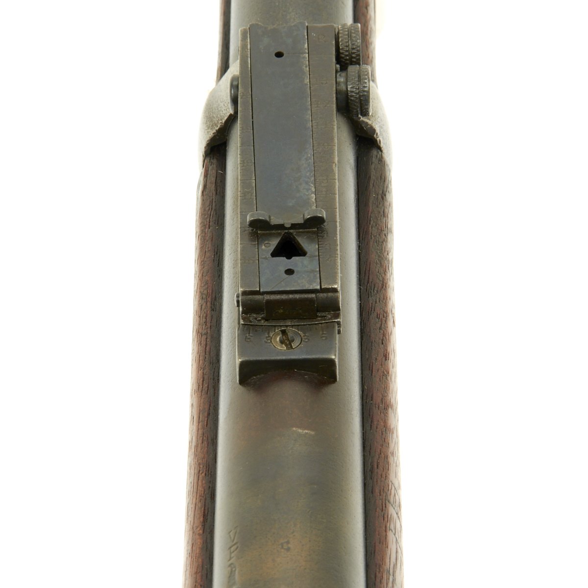 Additional marks of interest include inspectors' and proof marks around the breech end of the barrel: a capital A on top; and a V over a P over an eagle's head over another P on the left side just above the stock. The upper right corner of the Buffington sight leaf is marked R to indicate that the sight graduations are for a rifle and not a carbine.