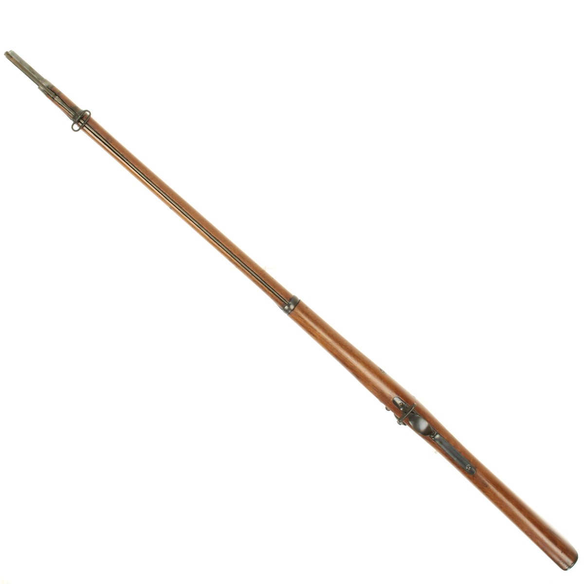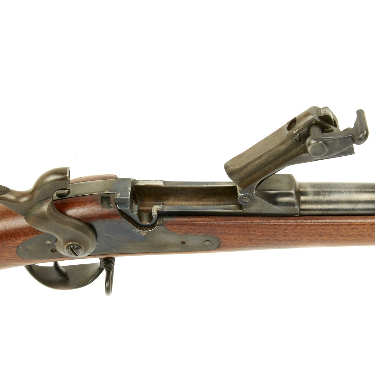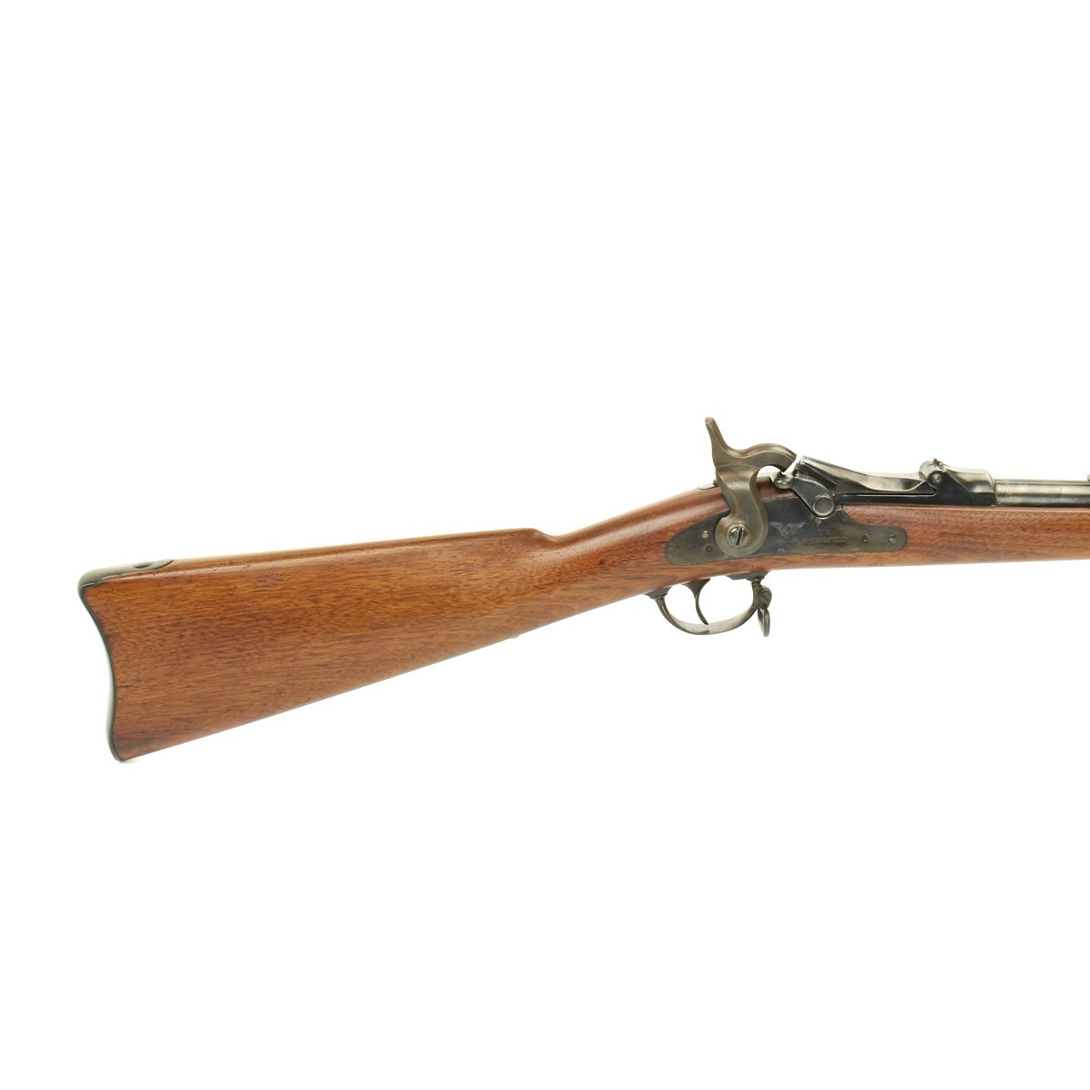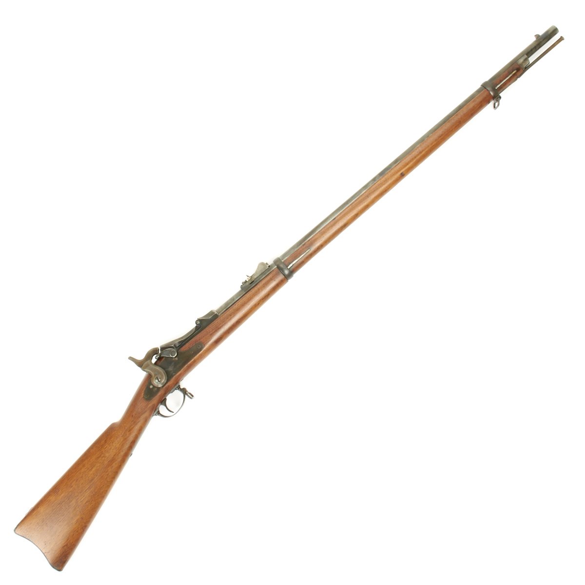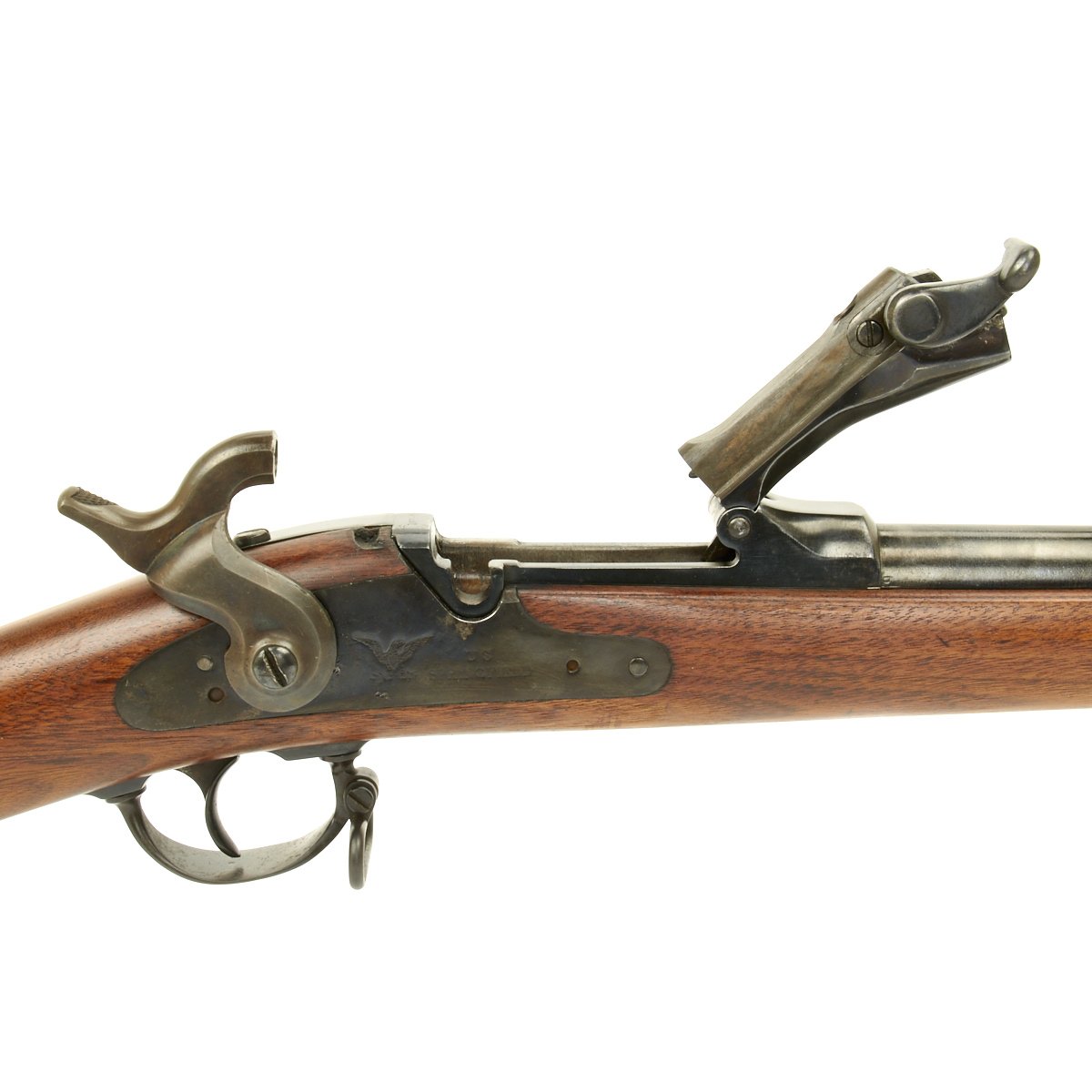The butt plate is marked "U.S." and both barrel bands are "U" marked. Center fire breechloader, .45 cal., two bands, two sling swivels, standard sliding sight, and standard ramrod. Lock is marked with an eagle and "US SPRINGFIELD", manufactured by Springfield Armory, Springfield Massachusetts.