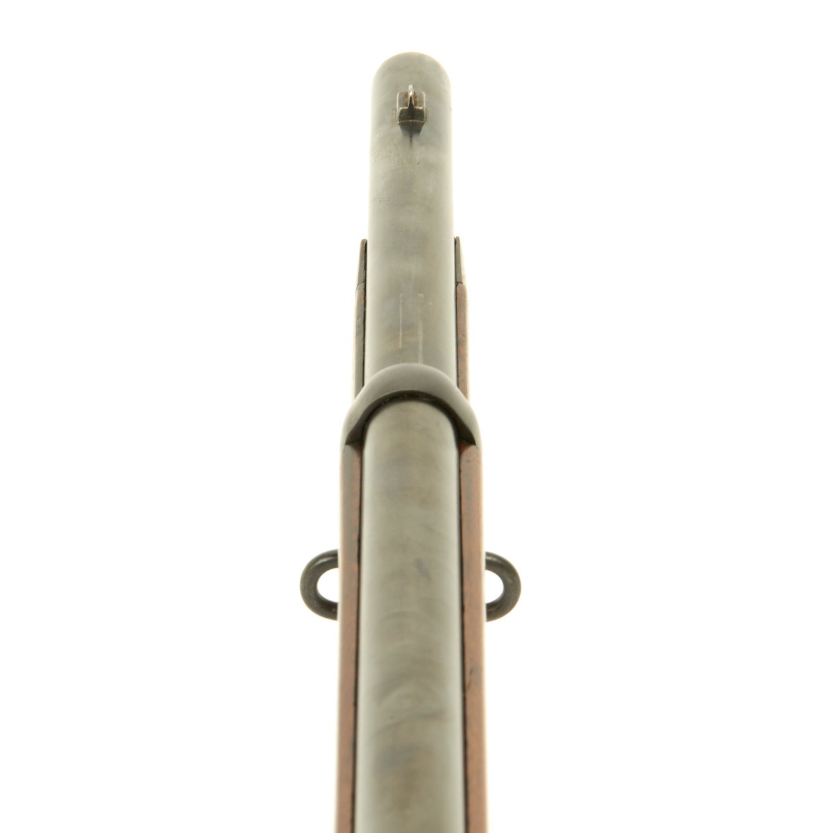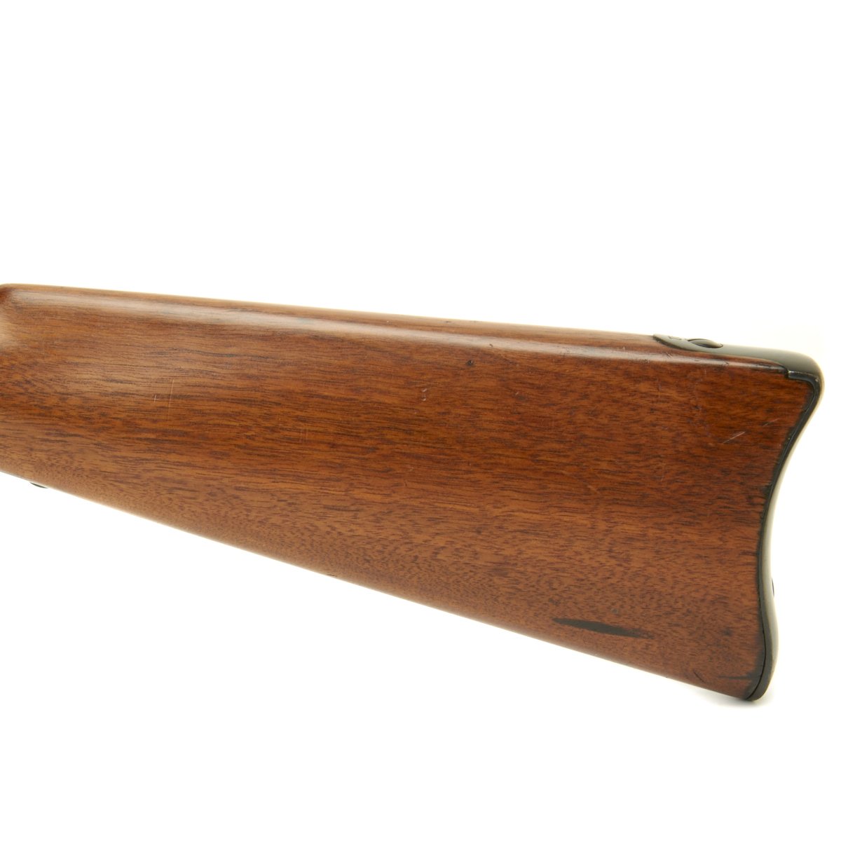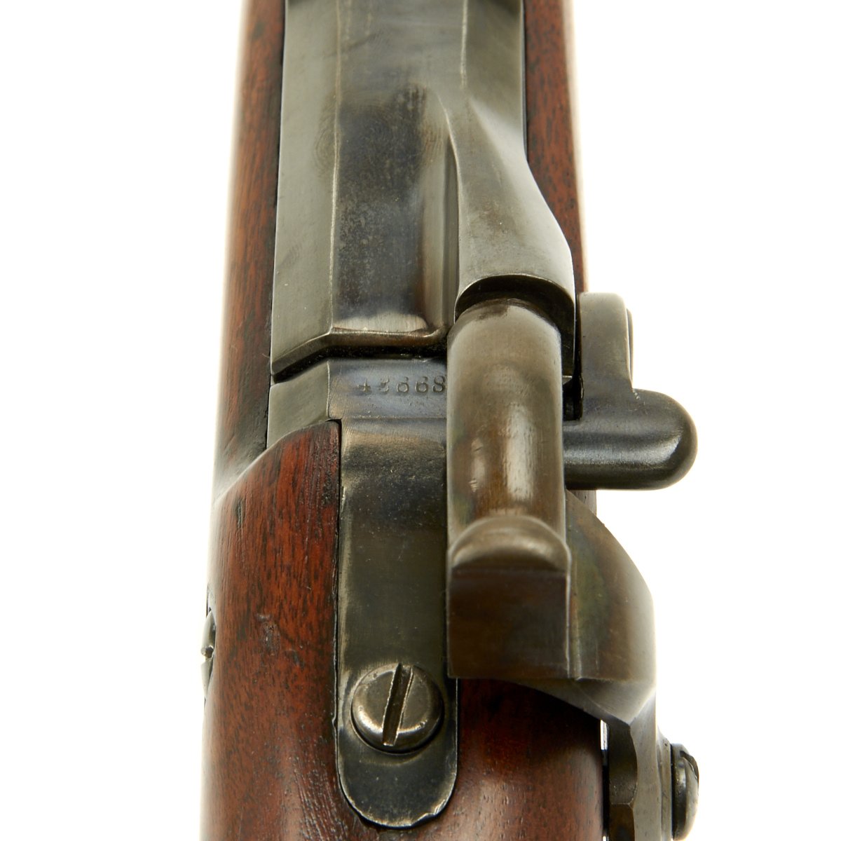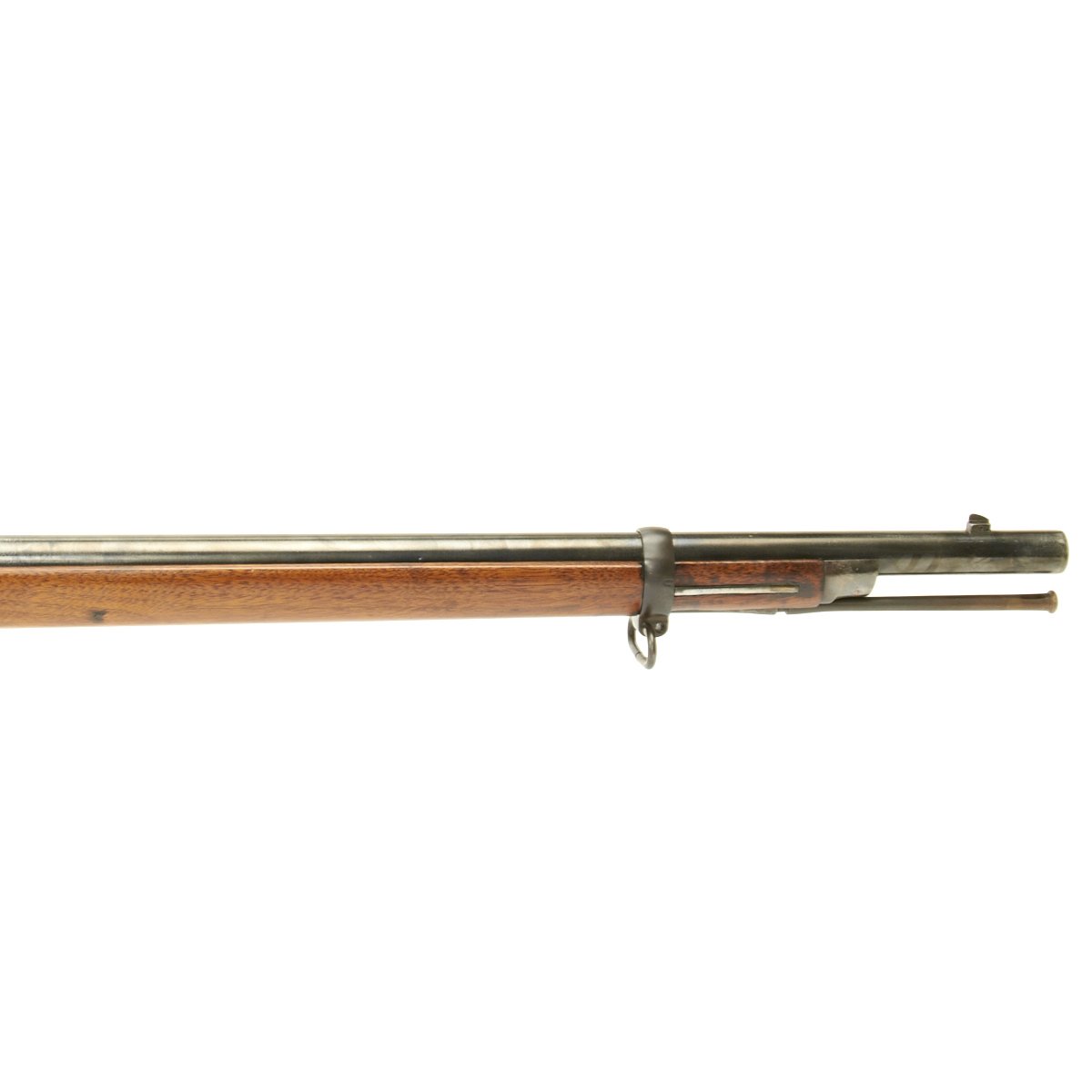 The elegant script SWP belongs to Samuel W. Porter, who was the Master Armorer and Chief Inspector of Springfield Armory from 15 September 1879 to 18 June 1894. A stylized P in a circle under the wrist of the stock indicates that the rifle passed all of its overpressure proof testing. Additional proof marks appear on the breech end of the barrel, though they are somewhat worn and not completely legible. The bore is in very good condition, with clear lands and grooves, mostly bright with just a bit of darkening.