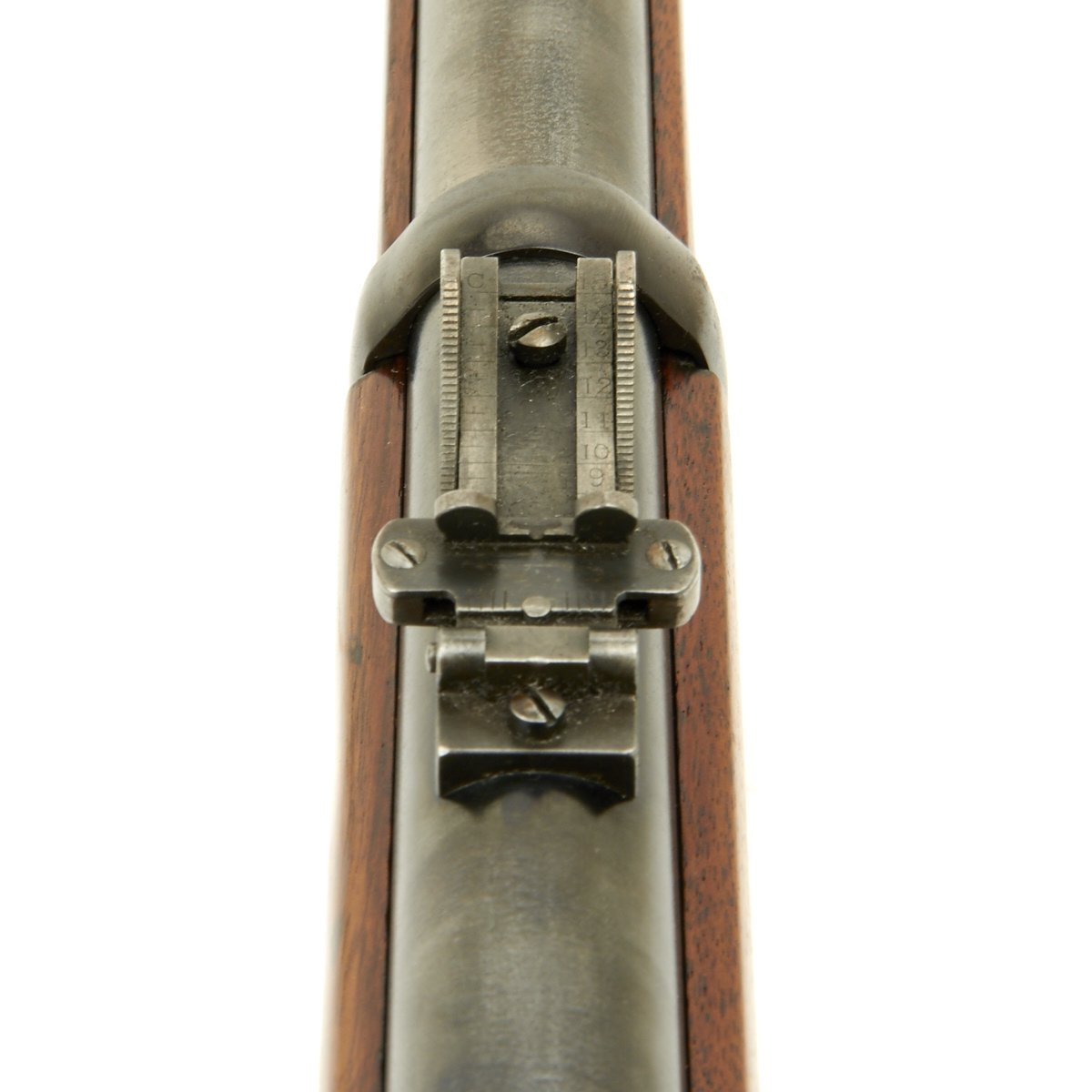 Additional marks of interest include inspectors' and proof marks around the breech end of the barrel: a V over a P over an eagle's head over another P on the left side just above the stock. The upper left corner of the standard sight leaf is marked R to indicate that the sight graduations are for a rifle and not a carbine.