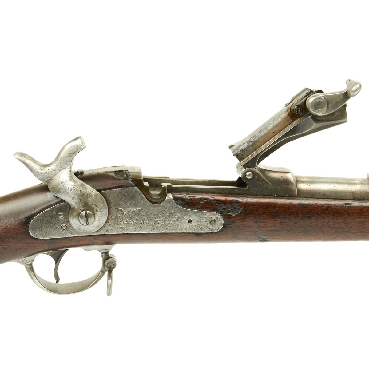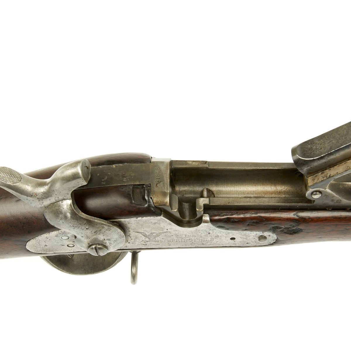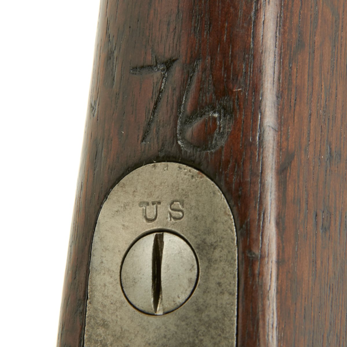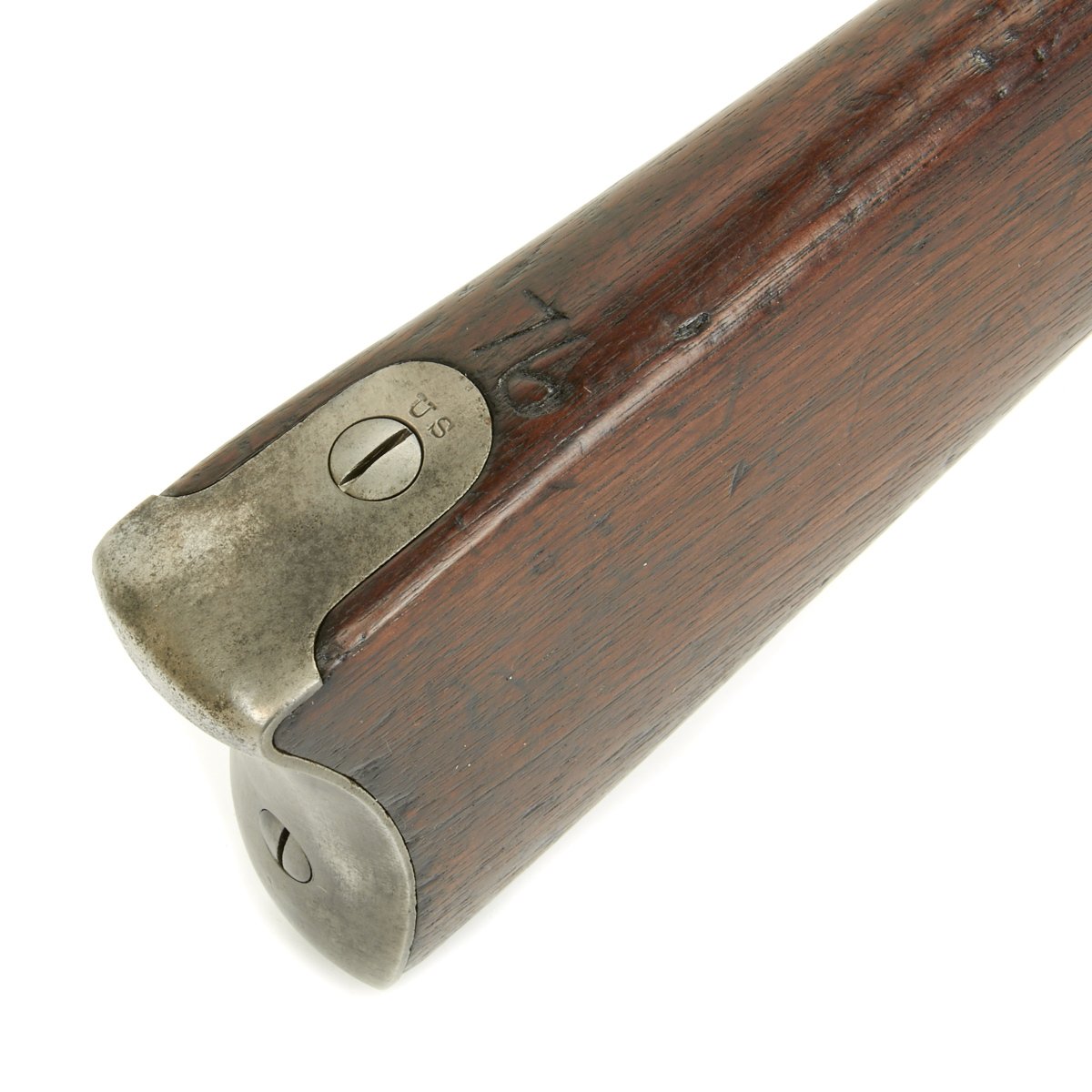 The butt plate is marked "U.S." and both barrel bands are "U" marked. The rifle stock is somewhat worn, with the remains of the cartouche near the lower lock screw. Center fire breechloader, .45 cal., two bands, two sling swivels, Buffington adjustable sight, and standard ramrod. Lock is marked with an eagle and "US SPRINGFIELD", manufactured by Springfield Armory, Springfield Massachusetts.