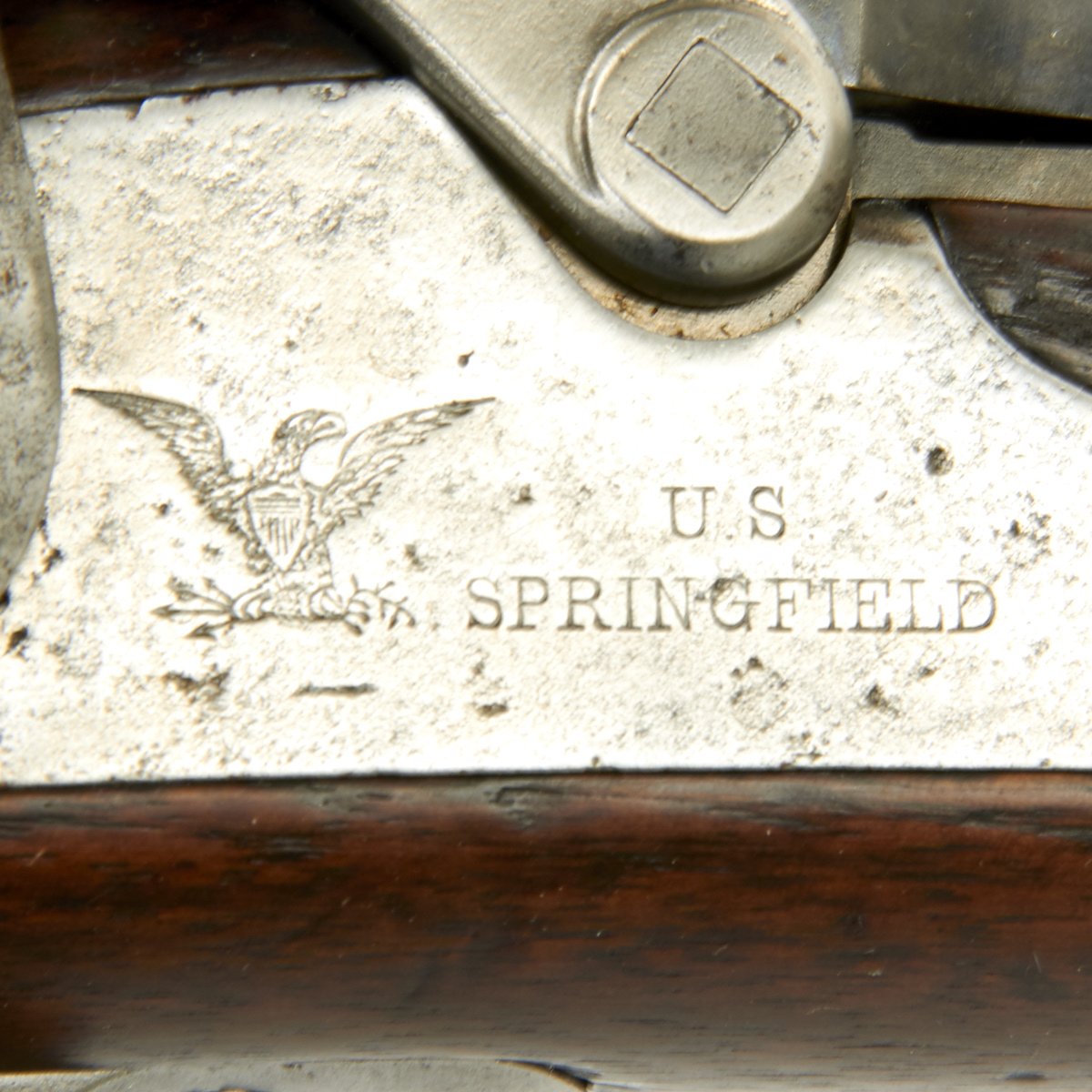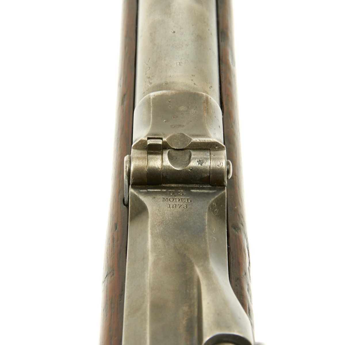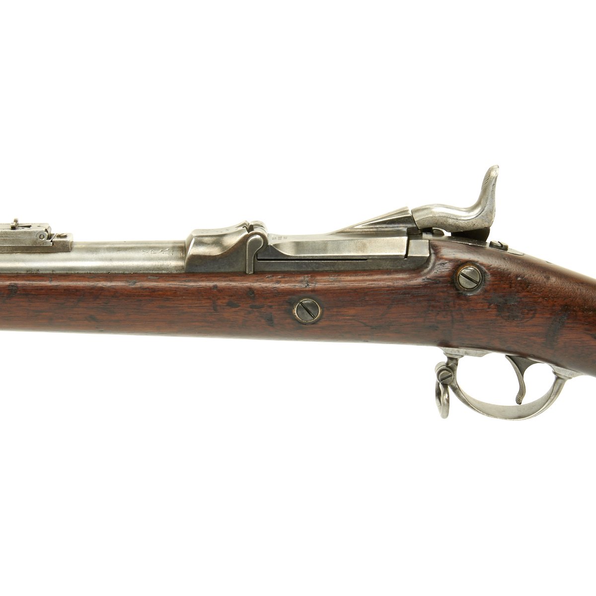 The butt plate is marked "U.S." and both barrel bands are "U" marked. The rifle stock is somewhat worn, with the remains of the cartouche near the lower lock screw. Center fire breechloader, .45 cal., two bands, two sling swivels, Buffington adjustable sight, and standard ramrod. Lock is marked with an eagle and "US SPRINGFIELD", manufactured by Springfield Armory, Springfield Massachusetts.