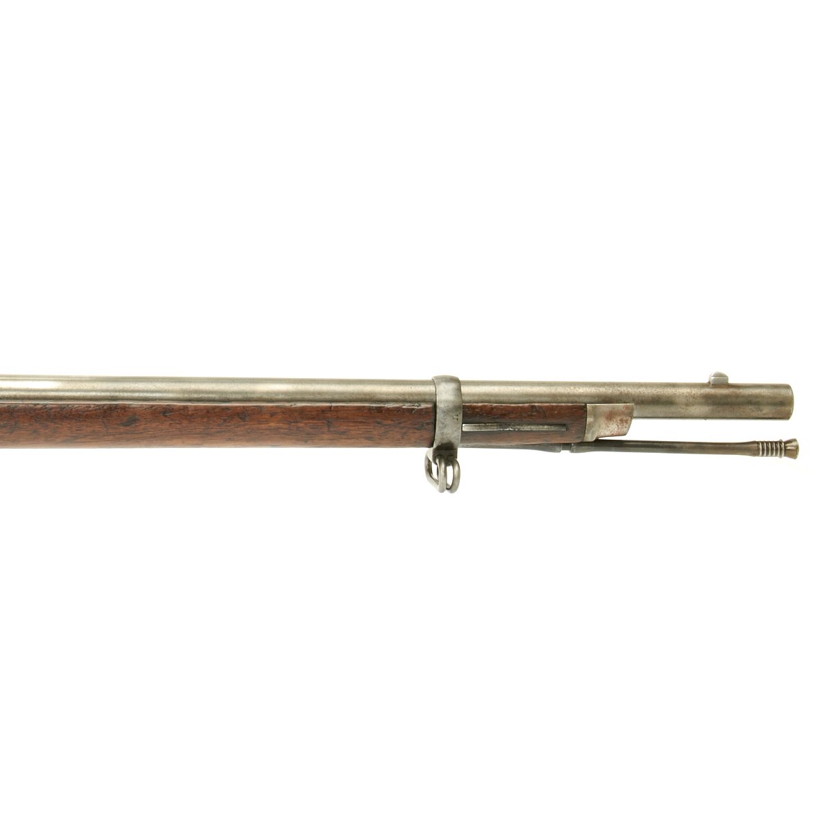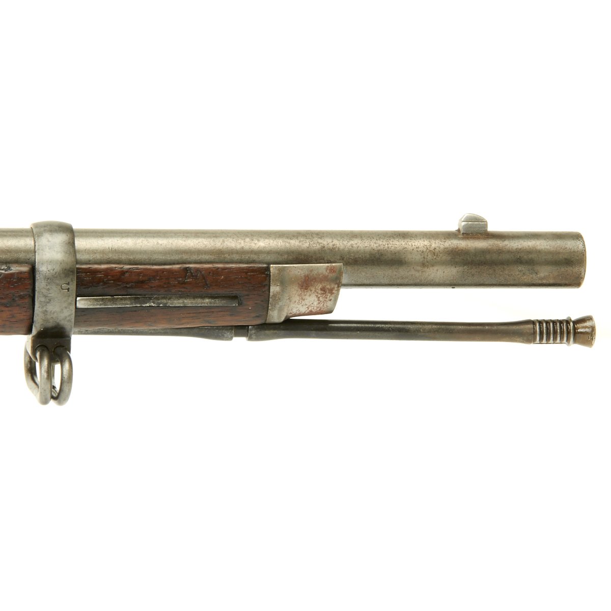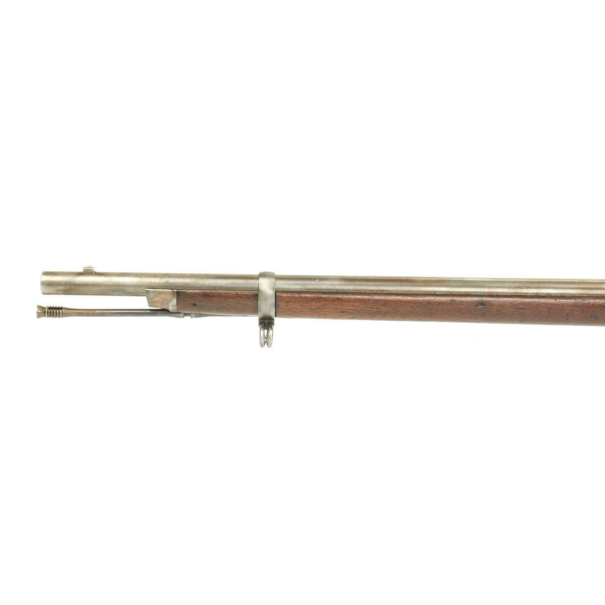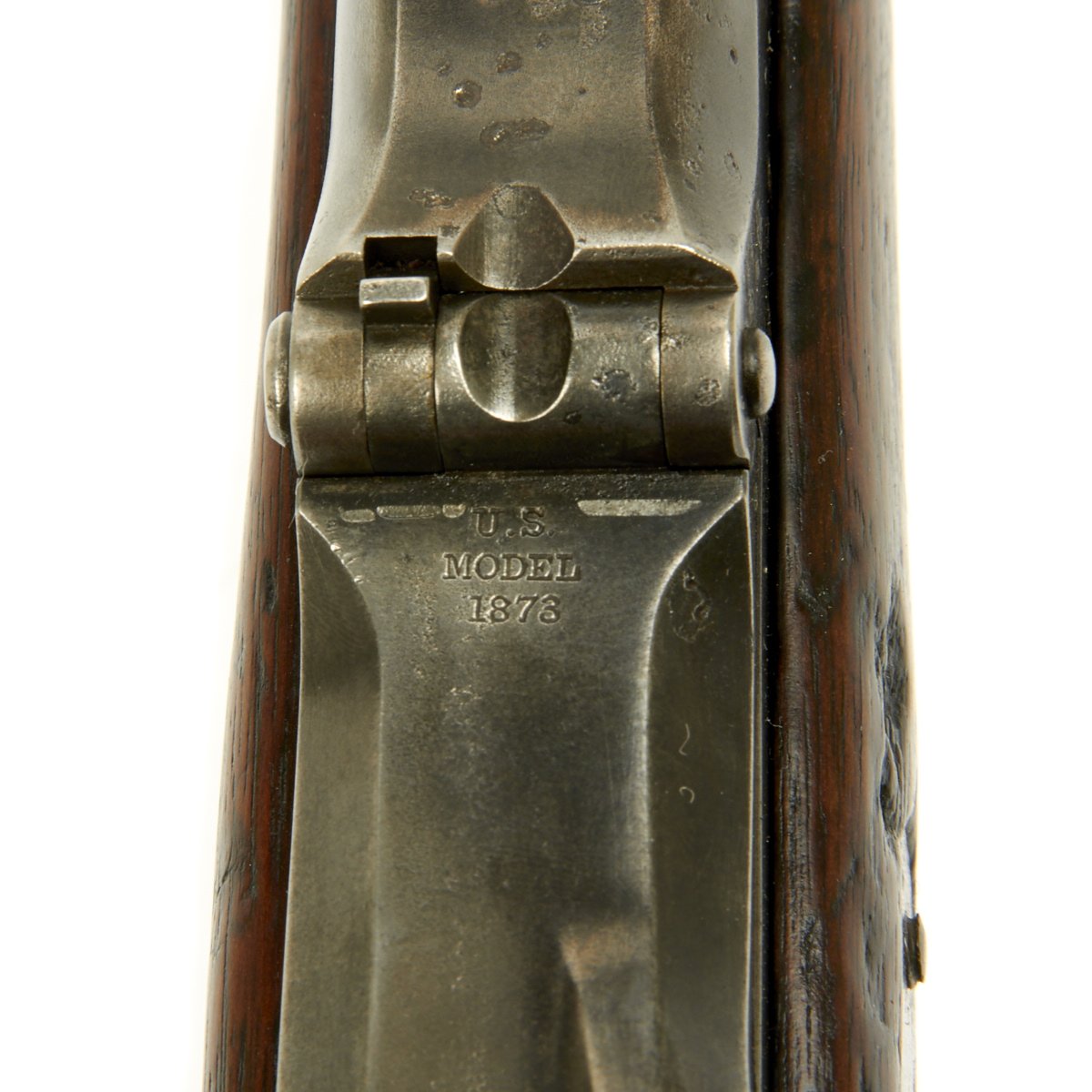 The butt plate is marked "U.S." and both barrel bands are "U" marked. The rifle stock is somewhat worn, with the remains of the cartouche near the lower lock screw. Center fire breechloader, .45 cal., two bands, two sling swivels, Buffington adjustable sight, and standard ramrod. Lock is marked with an eagle and "US SPRINGFIELD", manufactured by Springfield Armory, Springfield Massachusetts.