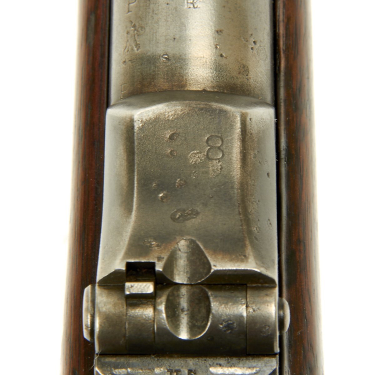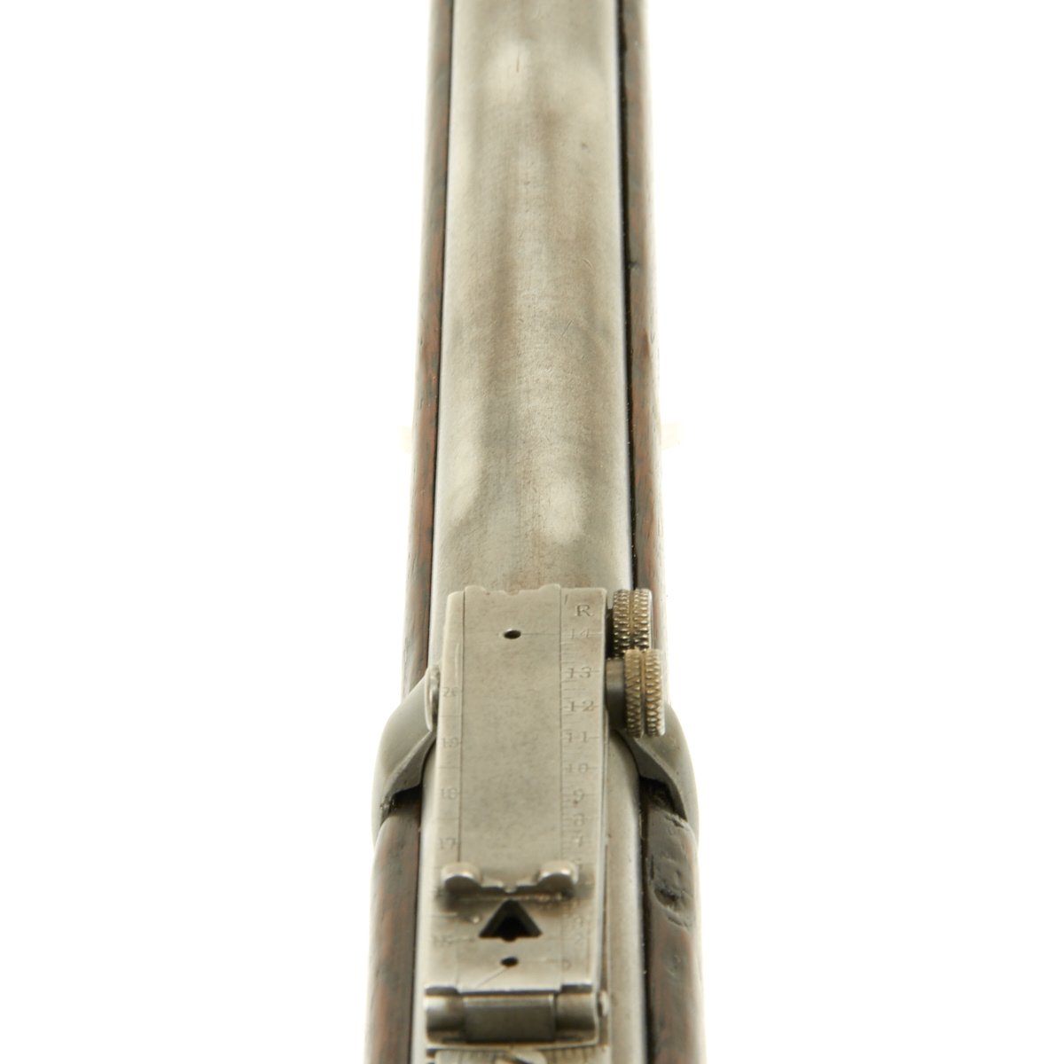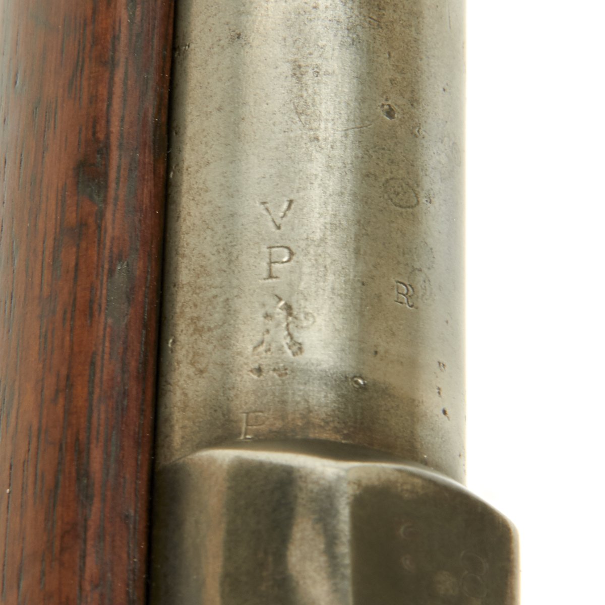 The elegant script SWP belongs to Samuel W. Porter, who was the Master Armorer and Chief Inspector of Springfield Armory from 15 September 1879 to 18 June 1894. A stylized P in a circle under the wrist of the stock indicates that the rifle passed all of its overpressure proof testing. Additional marks of interest include inspectors' and proof marks around the breech end of the barrel: a capital A on top; and a V over a P over an eagle's head over another P on the left side just above the stock. The upper right corner of the Buffington sight leaf is marked R to indicate that the sight graduations are for a rifle and not a carbine.