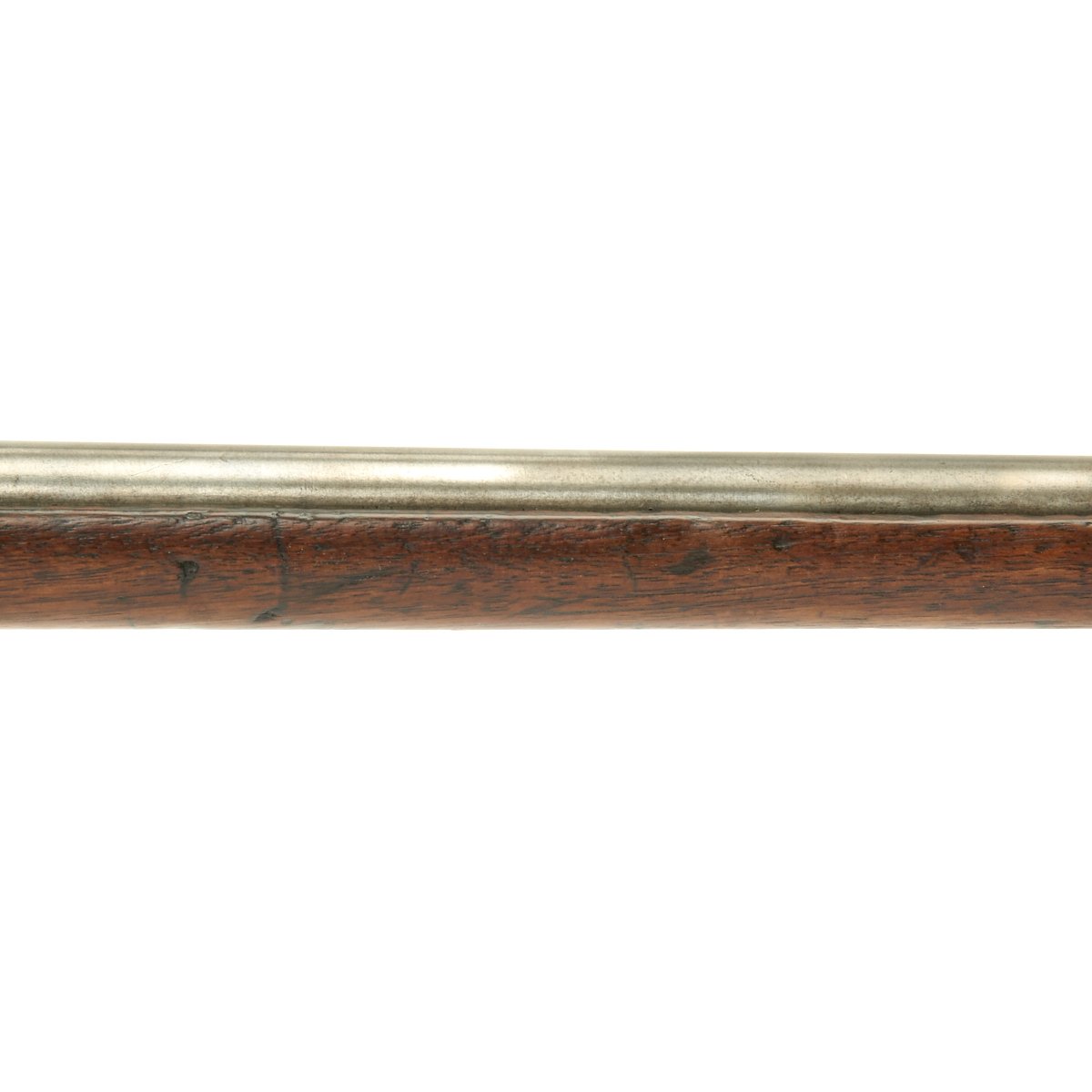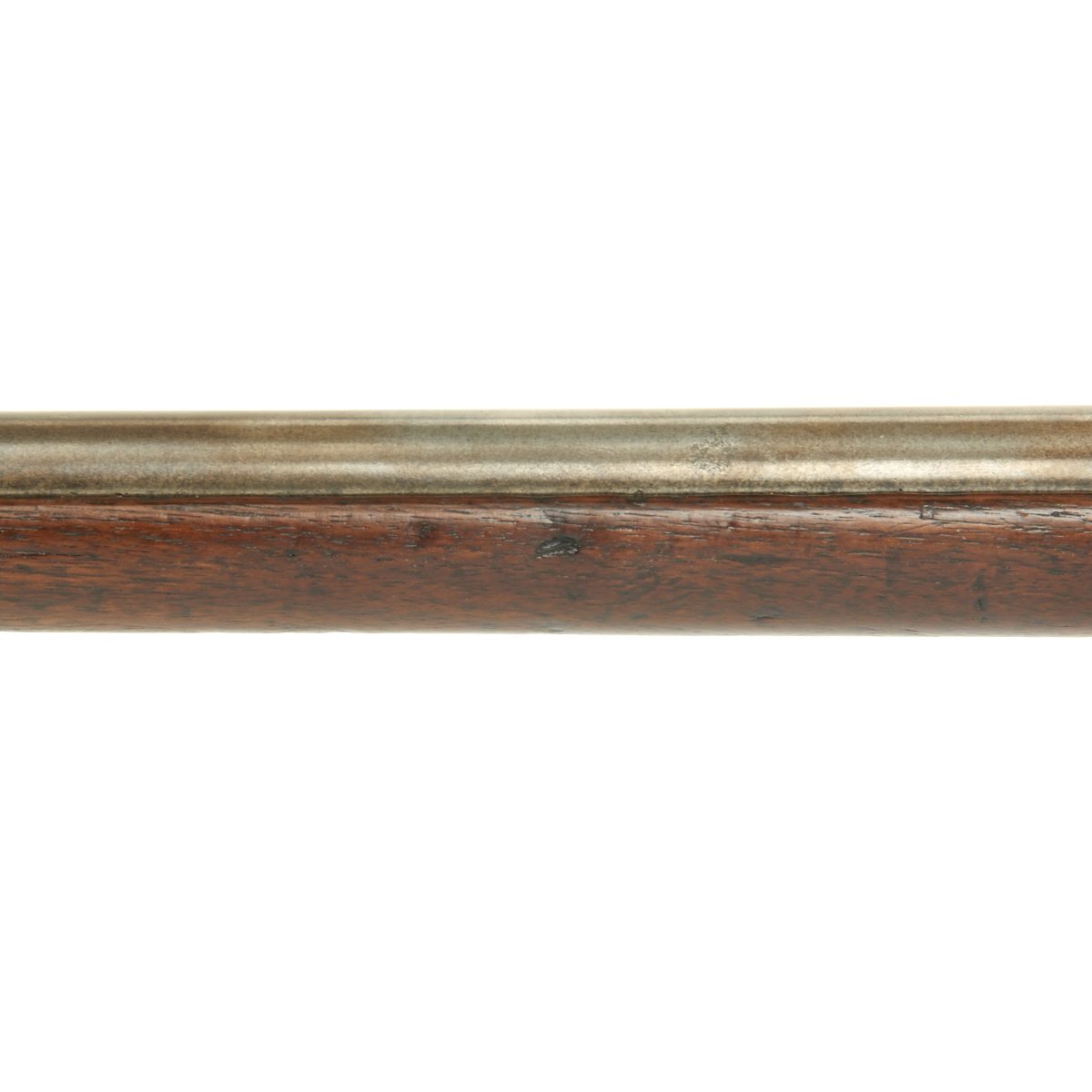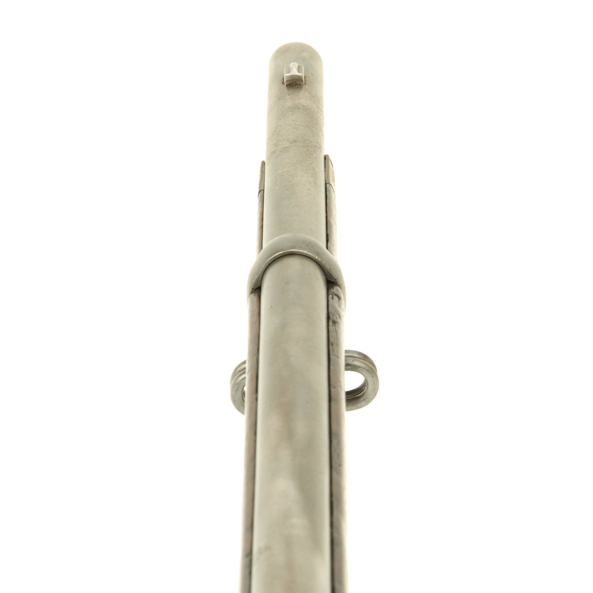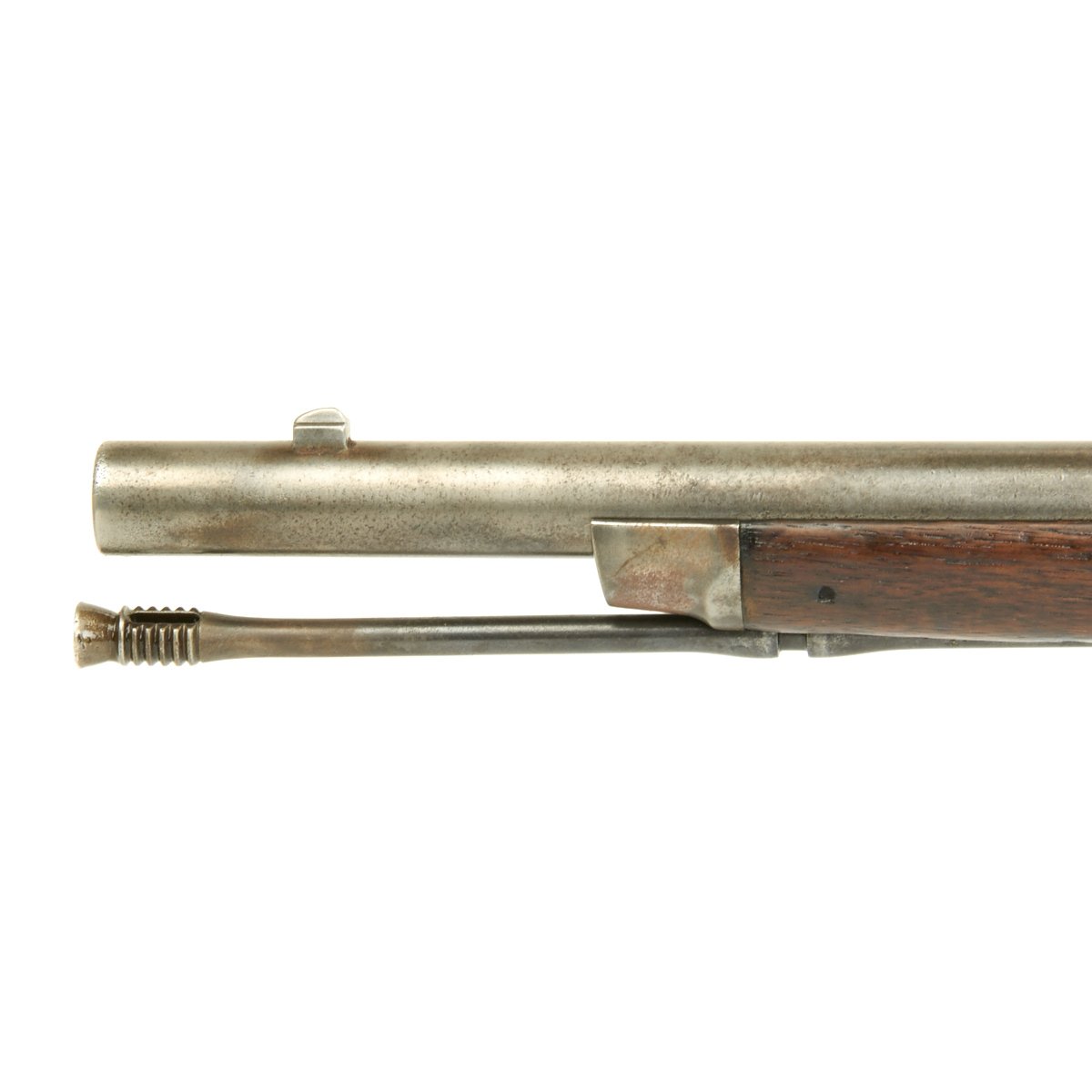 The elegant script SWP belongs to Samuel W. Porter, who was the Master Armorer and Chief Inspector of Springfield Armory from 15 September 1879 to 18 June 1894. A stylized P in a circle under the wrist of the stock indicates that the rifle passed all of its overpressure proof testing. Additional marks of interest include inspectors' and proof marks around the breech end of the barrel: a capital A on top; and a V over a P over an eagle's head over another P on the left side just above the stock. The upper right corner of the Buffington sight leaf is marked R to indicate that the sight graduations are for a rifle and not a carbine.