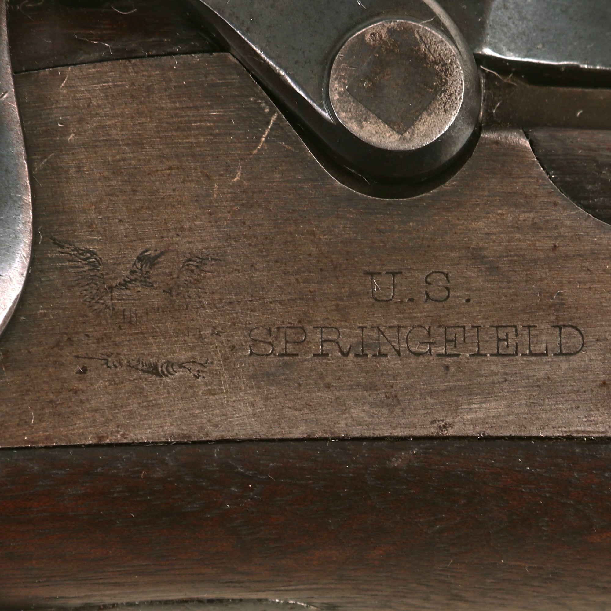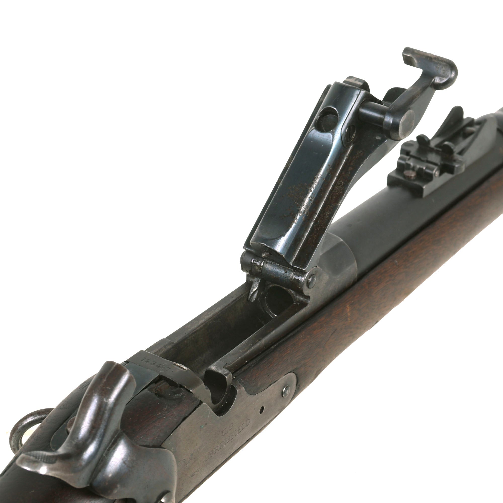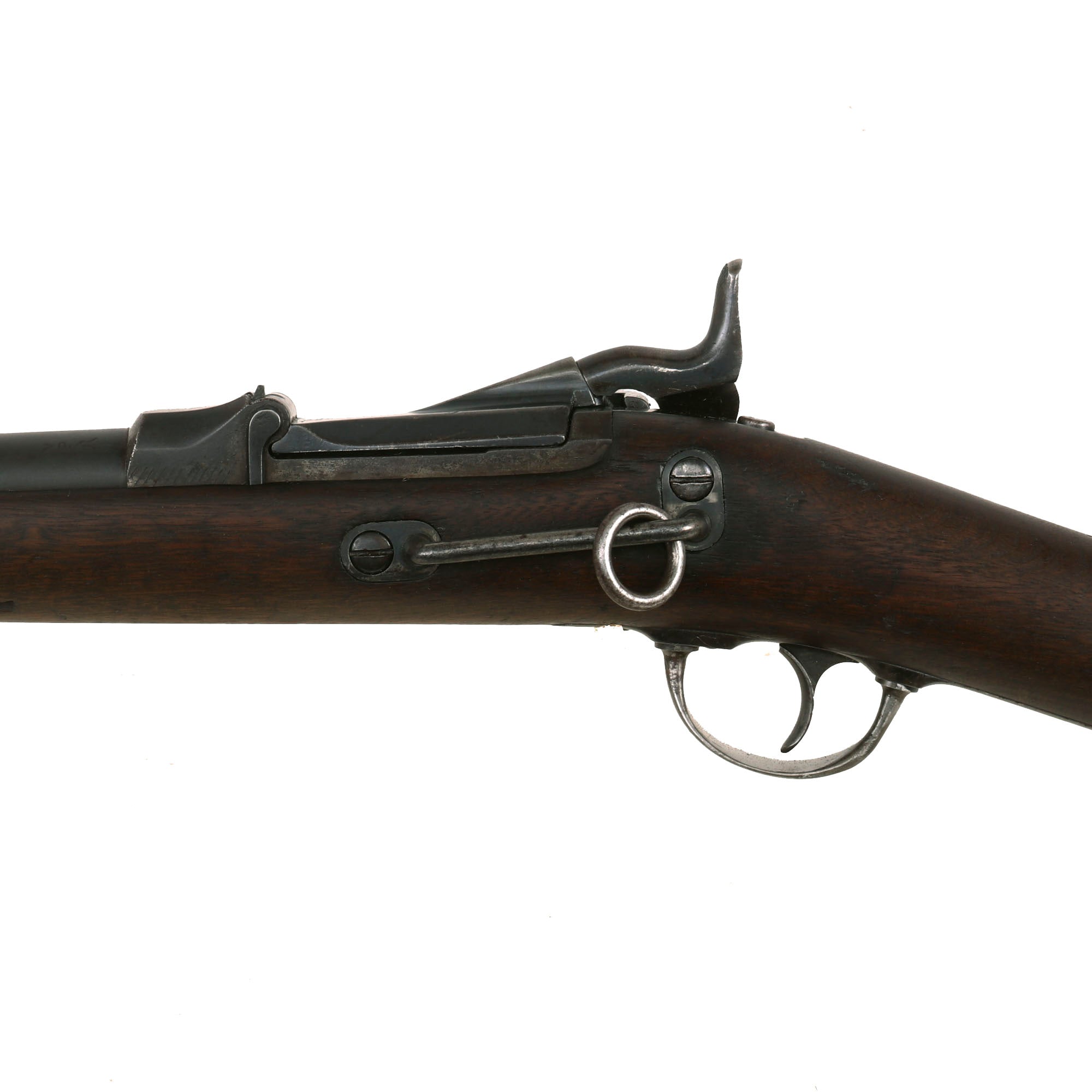 The butt plate is marked U.S. and the front band is U marked. The metalwork has been is in really nice condition, without any major oxidation issues, just some light peppering in areas. Center fire breechloader, .45 cal., single band, saddle-ring on sliding bar, and a working carbine M1879 rear ladder sight that is a bit stiff. Lock is marked with an eagle and U.S. / SPRINGFIELD, manufactured at the United States Armory and Arsenal at Springfield, in Springfield, Massachusetts.