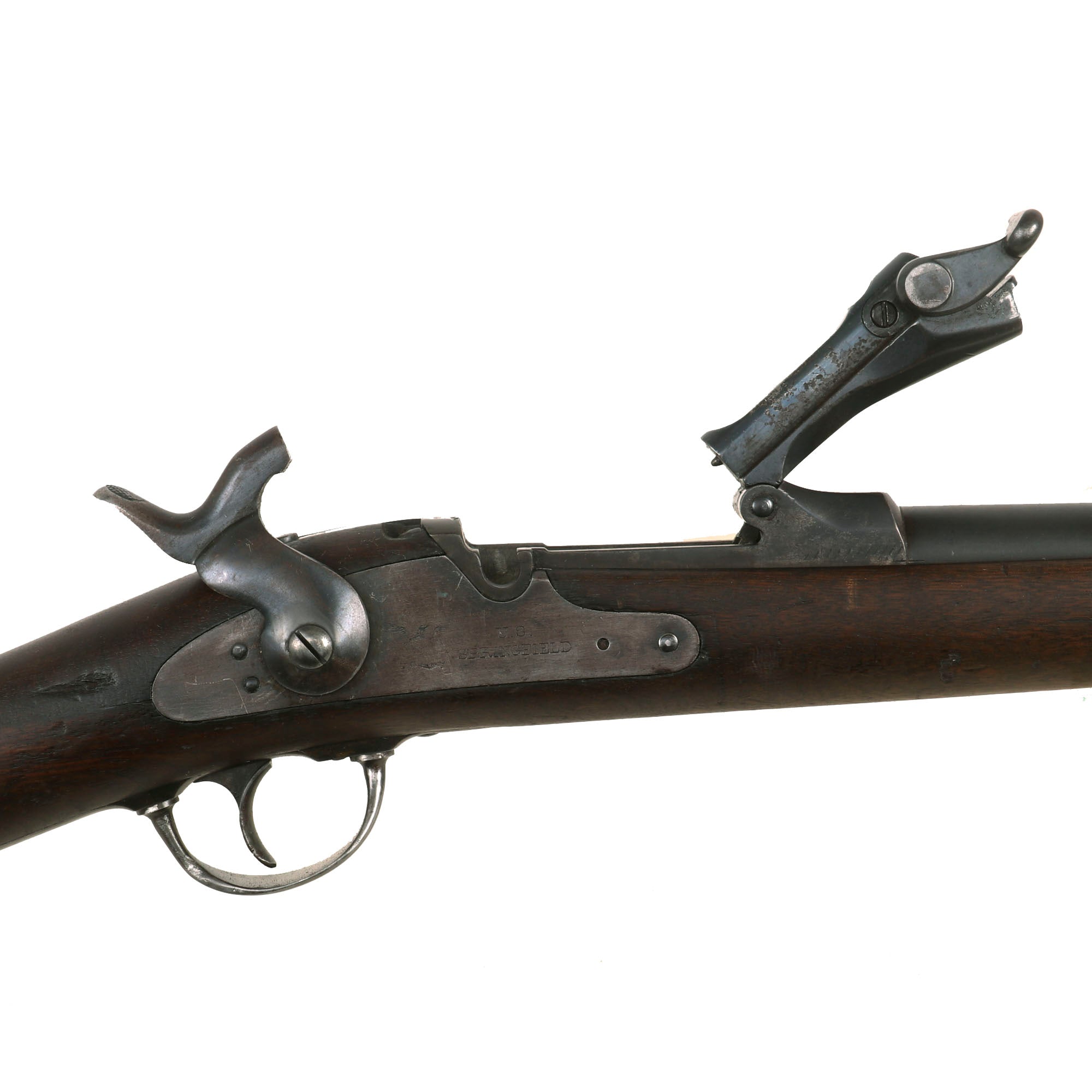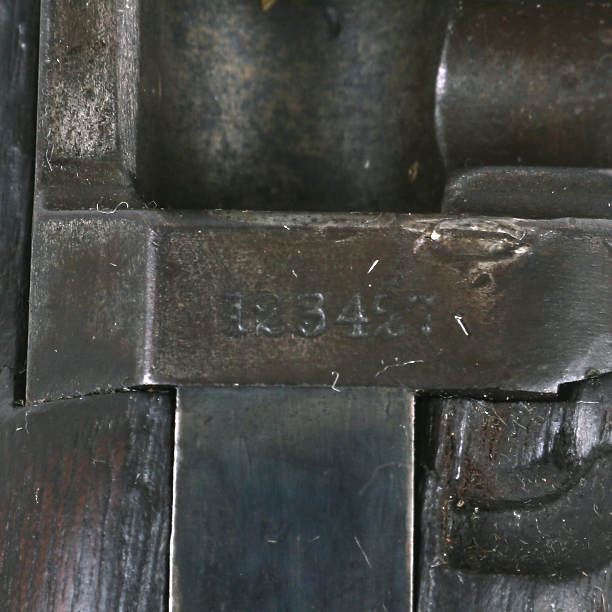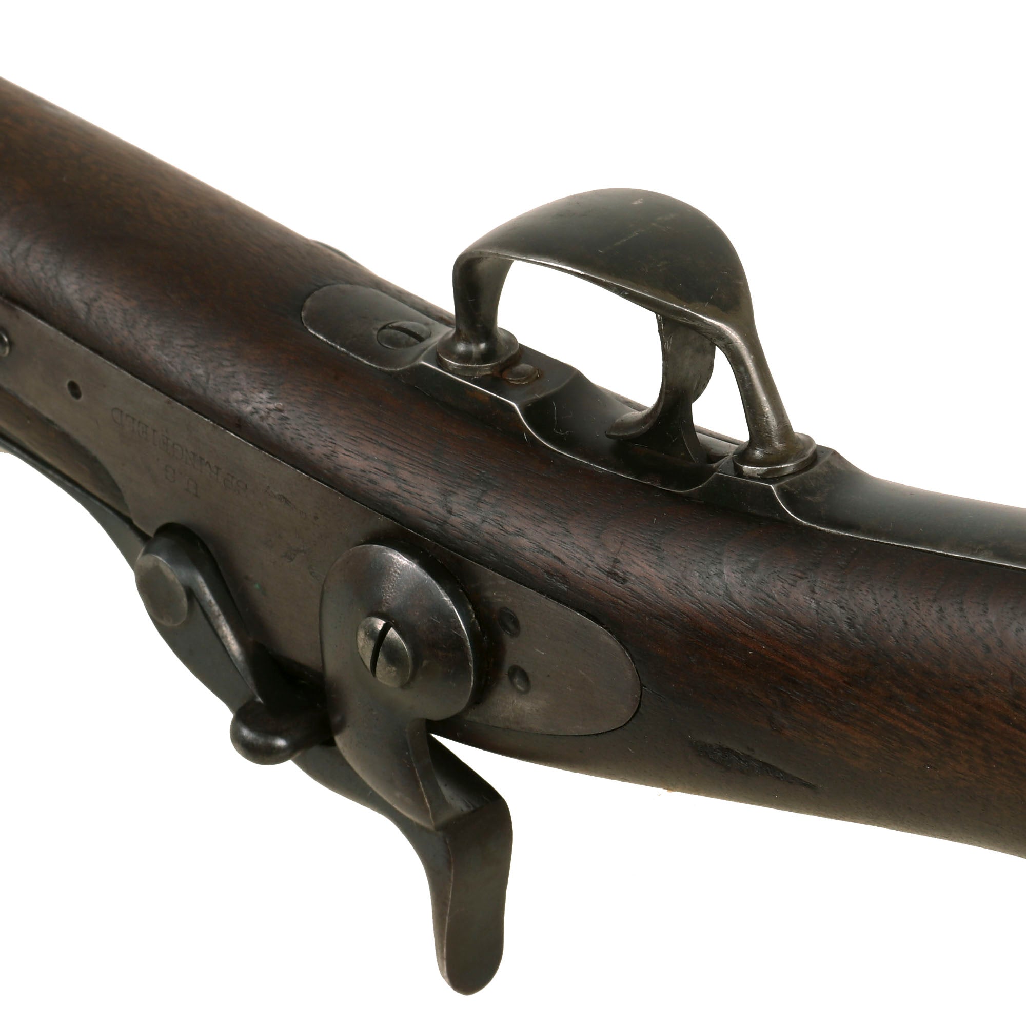 The butt plate is marked U.S. and the front band is U marked. The metalwork has been is in really nice condition, without any major oxidation issues, just some light peppering in areas. Center fire breechloader, .45 cal., single band, saddle-ring on sliding bar, and a working carbine M1879 rear ladder sight that is a bit stiff. Lock is marked with an eagle and U.S. / SPRINGFIELD, manufactured at the United States Armory and Arsenal at Springfield, in Springfield, Massachusetts.