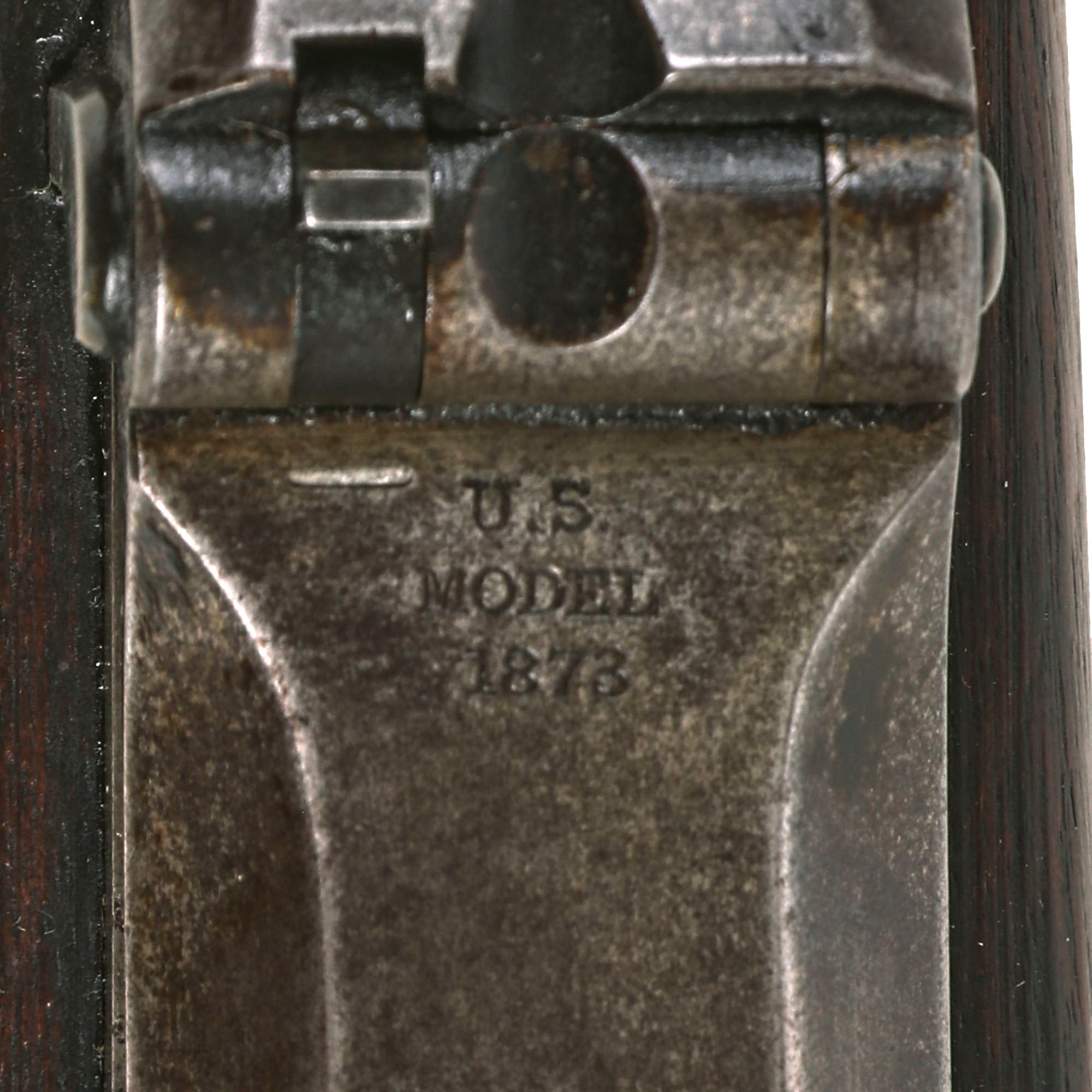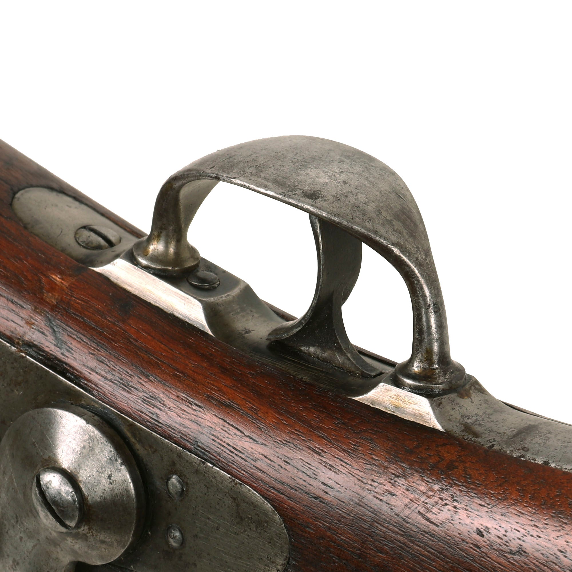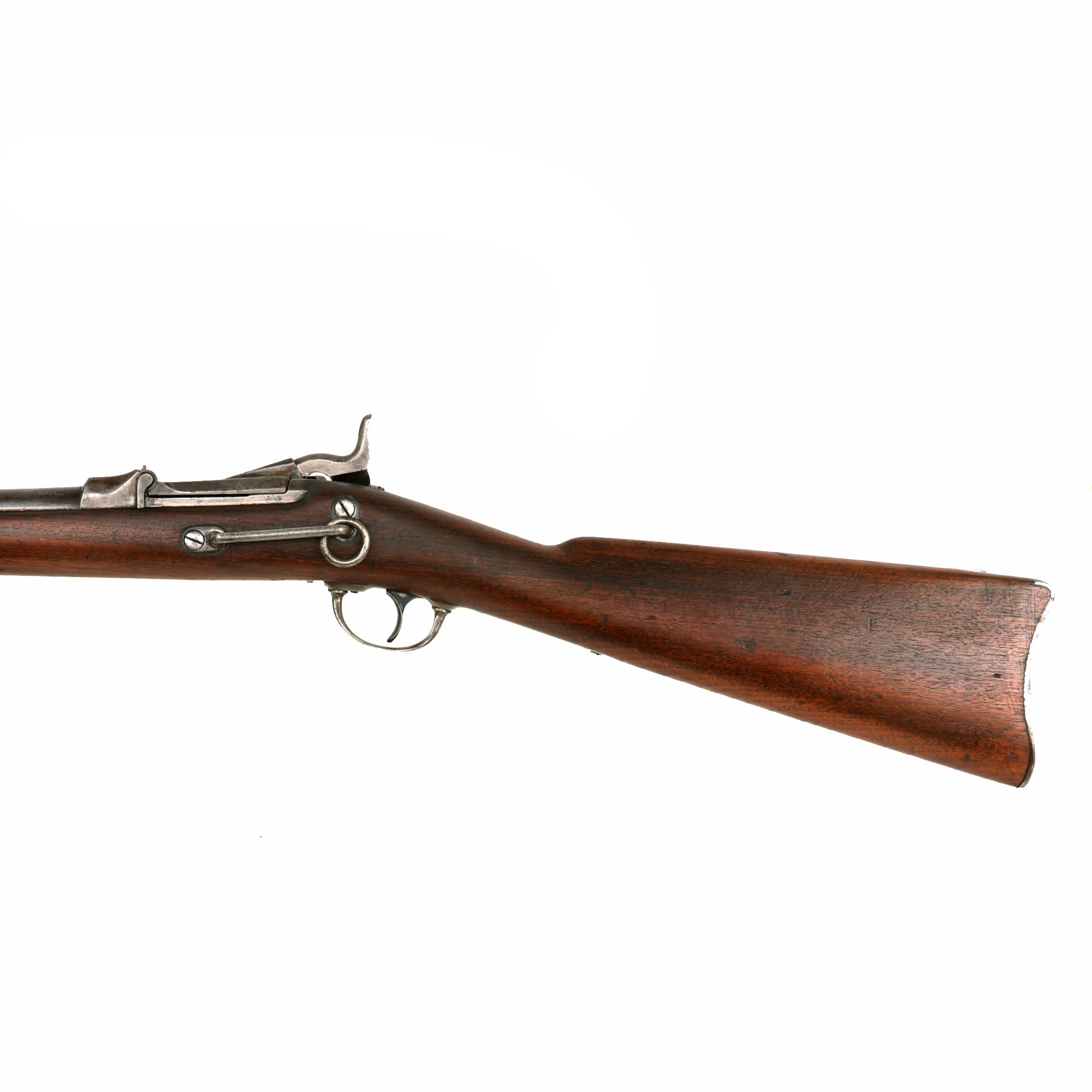 The butt plate is marked U.S. and the front band is U marked. The metalwork has been is in really nice condition, without any major oxidation issues, just some light peppering in areas, particularly on the lock plate. Center fire breechloader, .45 cal., single band, saddle-ring on sliding bar, and a working carbine M1879 rear ladder sight. Lock is marked with an eagle and U.S. / SPRINGFIELD, manufactured at the United States Armory and Arsenal at Springfield, in Springfield, Massachusetts.