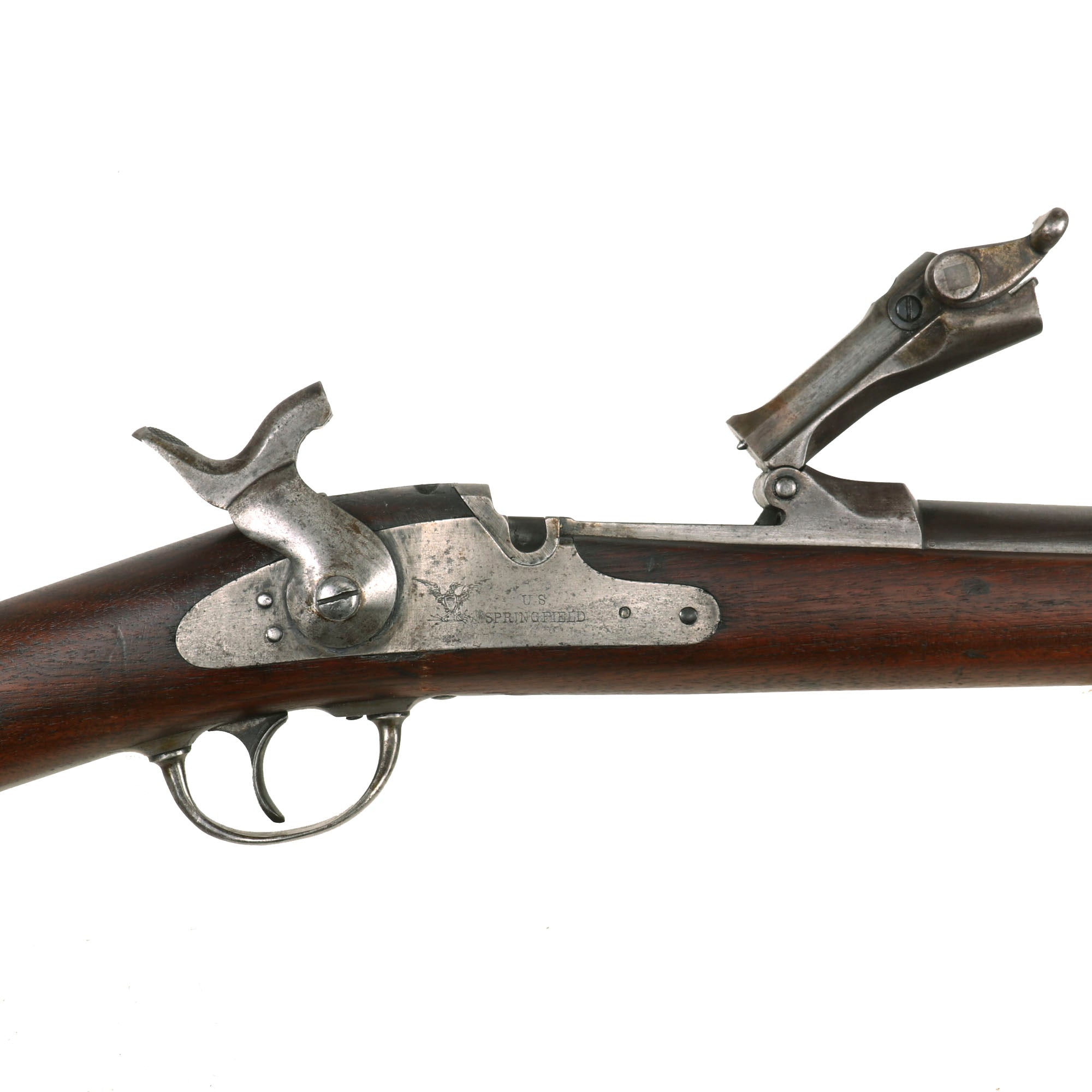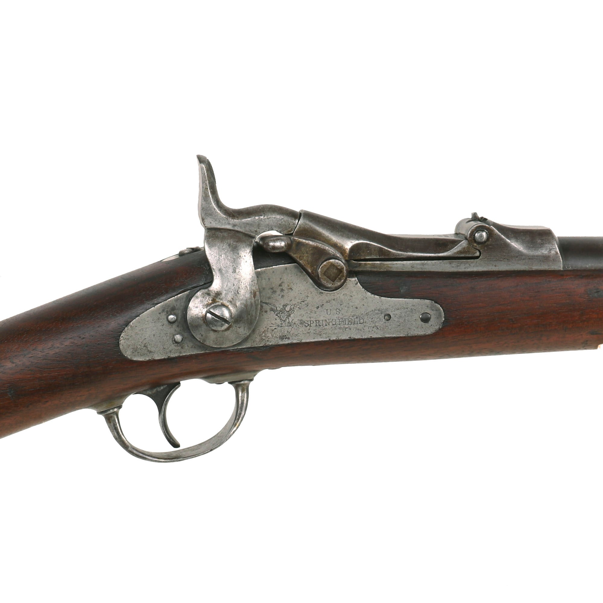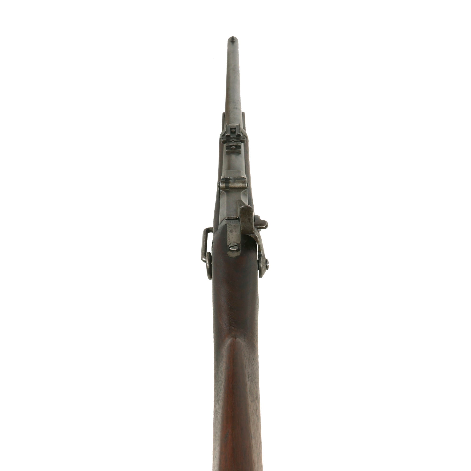 The butt plate is marked U.S. and the front band is U marked. The metalwork has been is in really nice condition, without any major oxidation issues, just some light peppering in areas, particularly on the lock plate. Center fire breechloader, .45 cal., single band, saddle-ring on sliding bar, and a working carbine M1879 rear ladder sight. Lock is marked with an eagle and U.S. / SPRINGFIELD, manufactured at the United States Armory and Arsenal at Springfield, in Springfield, Massachusetts.