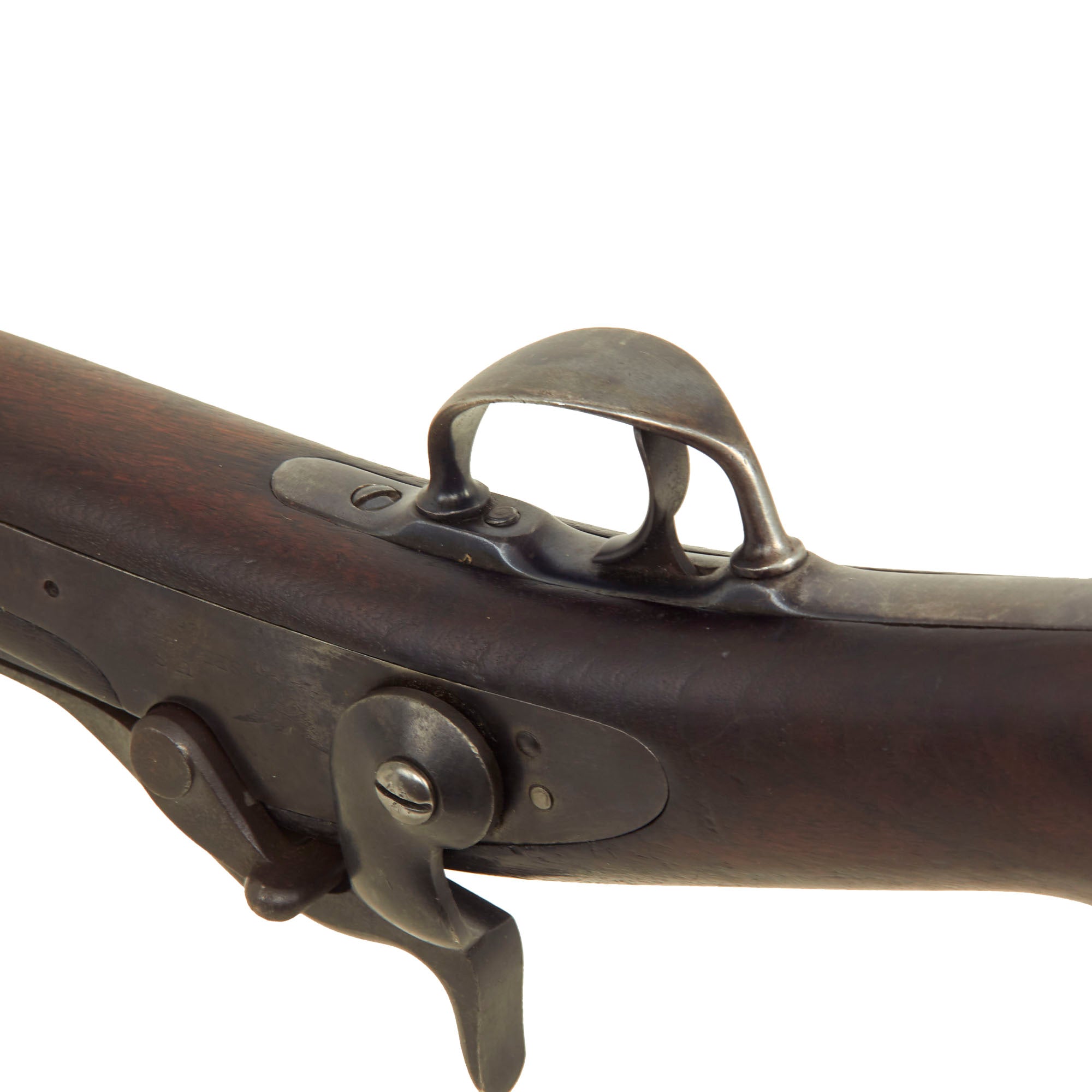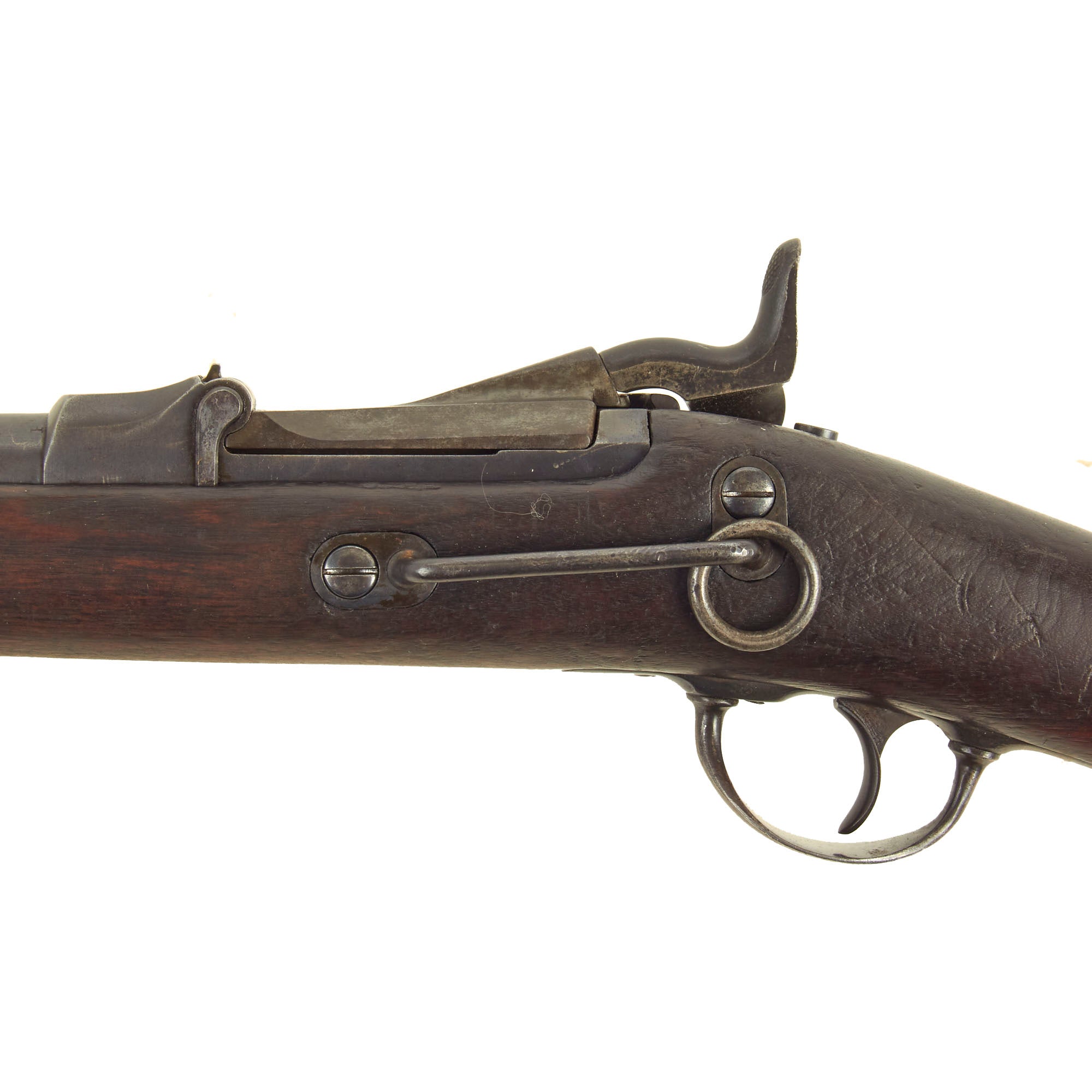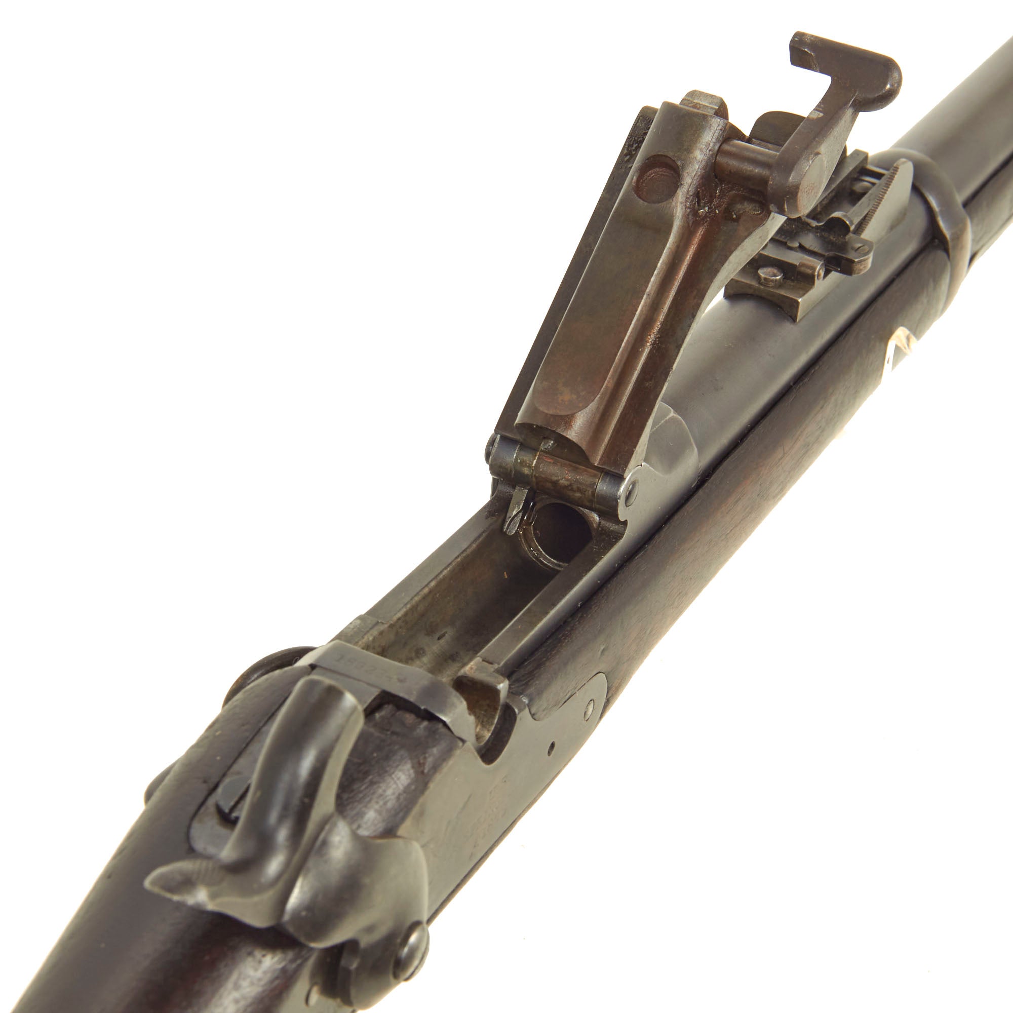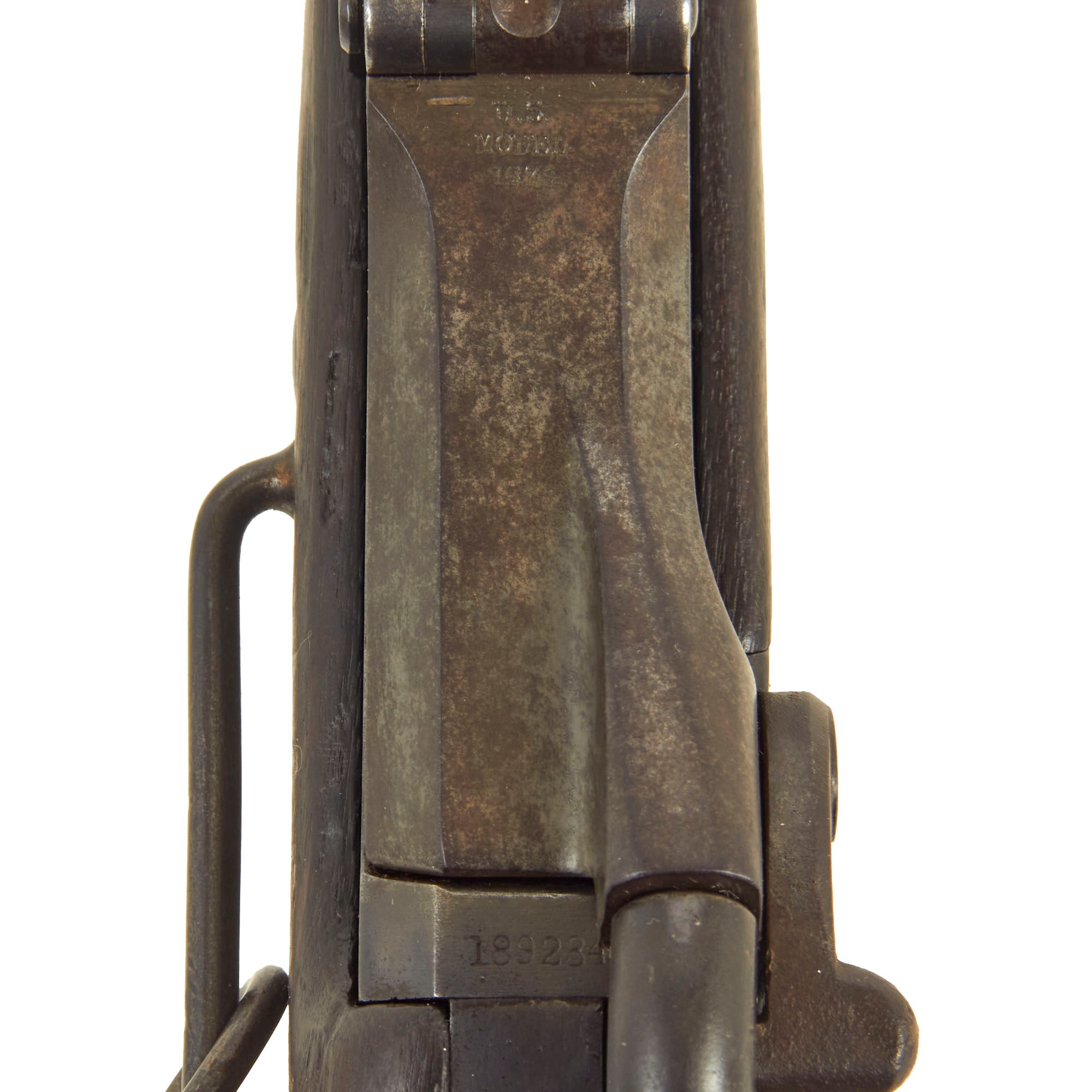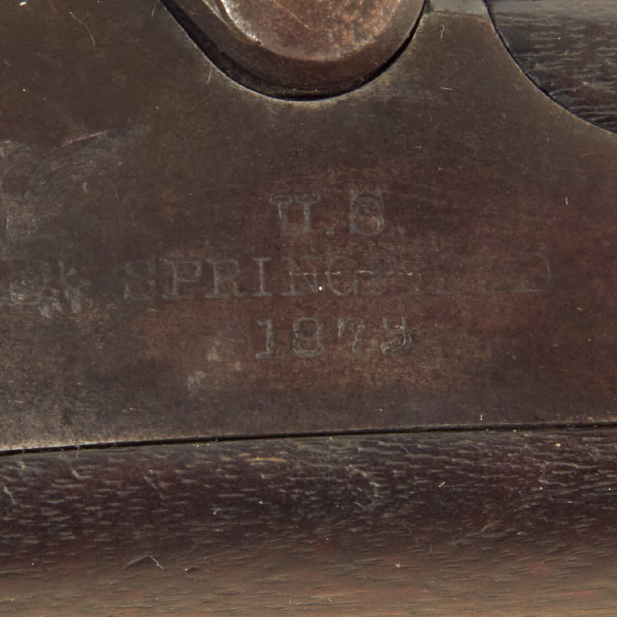 The butt plate is marked U.S. and the front band is U marked. The metalwork has been worn to a lovely faded blue patina overall, with a mottled patina on the breech block, which was originally case hardened. Center fire breechloader, .45 cal., single band, saddle-ring on sliding bar, and fully functional carbine M1879 rear ladder sight. Lock is marked with an eagle and U.S. / SPRINGFIELD / 1873, manufactured at the United States Armory and Arsenal at Springfield, in Springfield, Massachusetts. This is the early pattern lock plate, often seen on "star" serial number examples, but it has the correct later 3 notch tumbler.