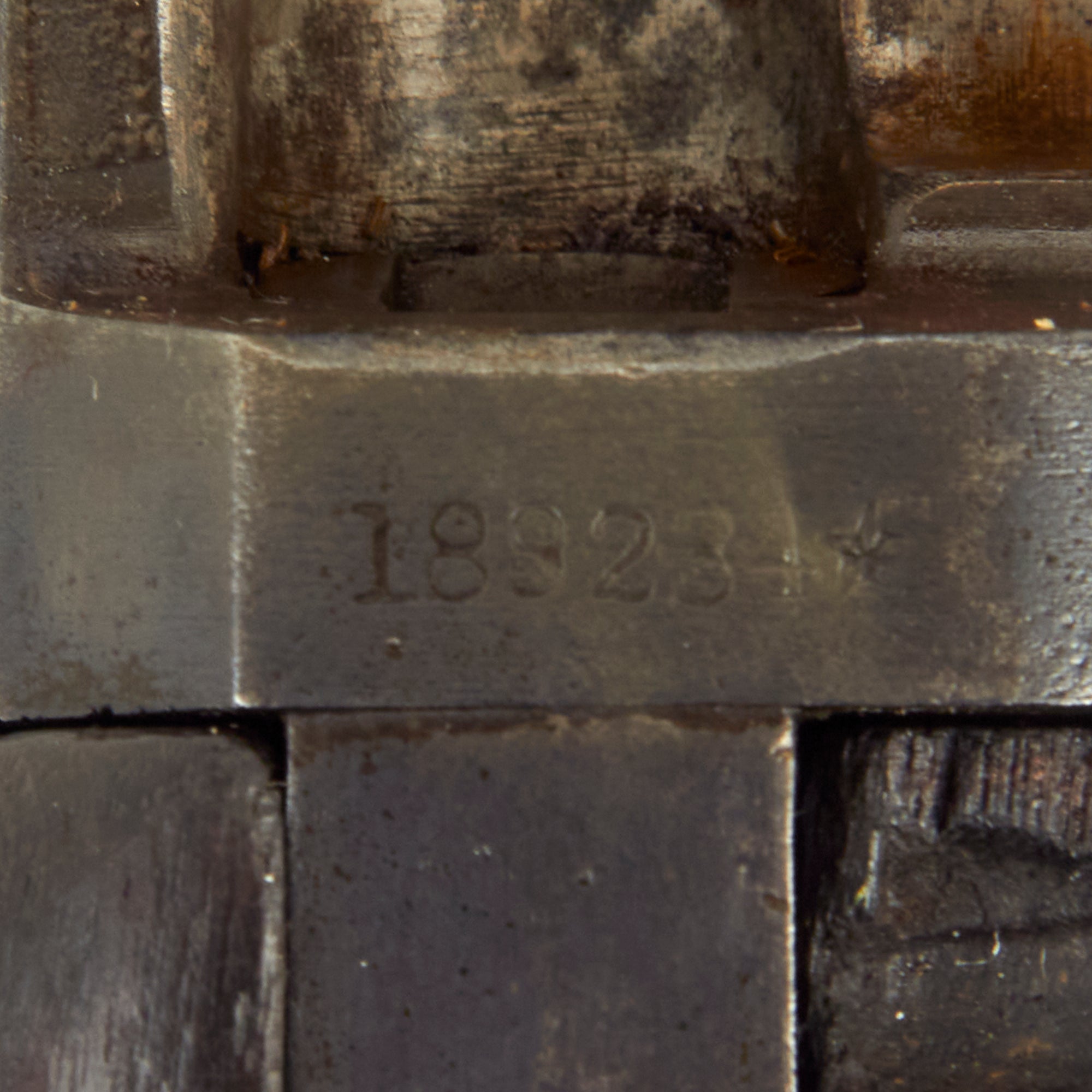 The bore is in very good condition, with a mostly bright finish and clear lands and grooves. There is just a bit of wear, and signs of past light oxidation and fouling overall. It did see service, but was definitely well cared for. The breech block moves correctly, and the extractor is still present and functional, though we have not tested it with real brass. The saddle ring bar is still present, with the correct saddle ring present. It has the correct butt stock storage compartment for the cleaning rod, though it is unfortunately empty.