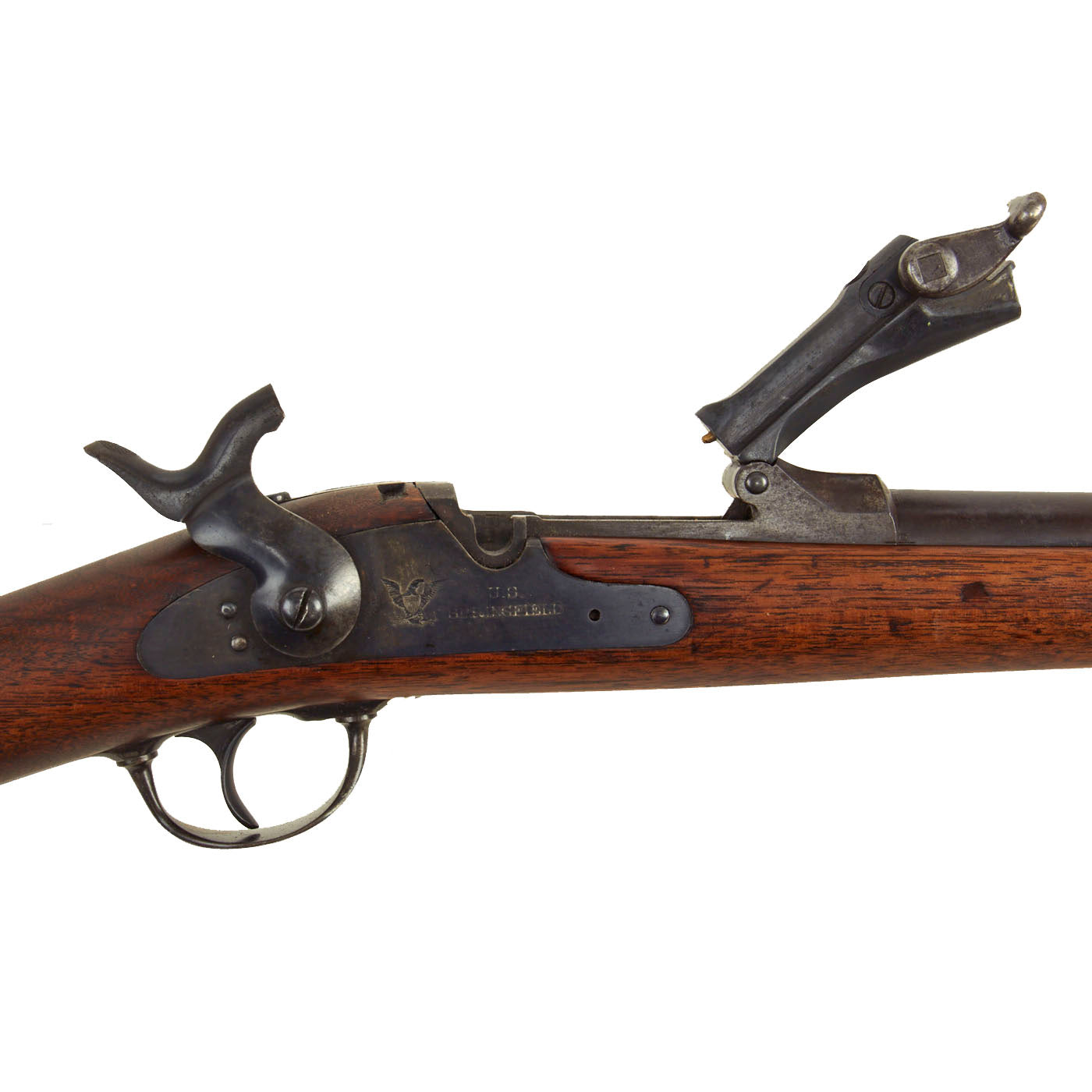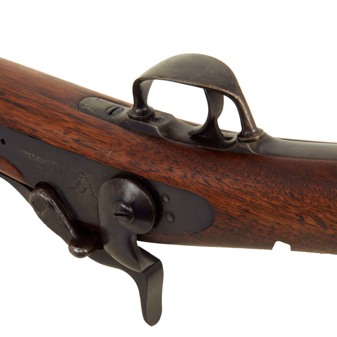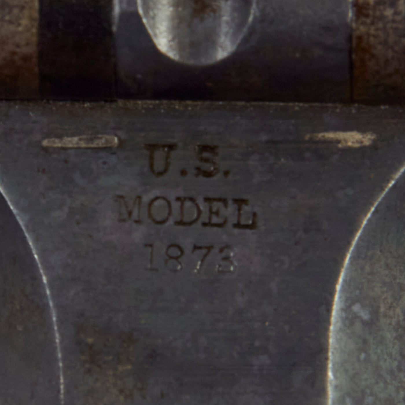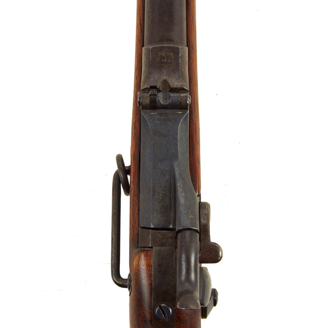 The butt plate is marked U.S. and the front band is U marked. The metalwork has been worn to a lovely faded blue patina overall, with signs of arsenal rebluing on the breech block and lock plate. Center fire breechloader, .45 cal., single band, saddle-ring on sliding bar, and fully functional carbine M1879 rear ladder sight. Lock is marked with an eagle and U.S. / SPRINGFIELD, manufactured at the United States Armory and Arsenal at Springfield, in Springfield, Massachusetts.