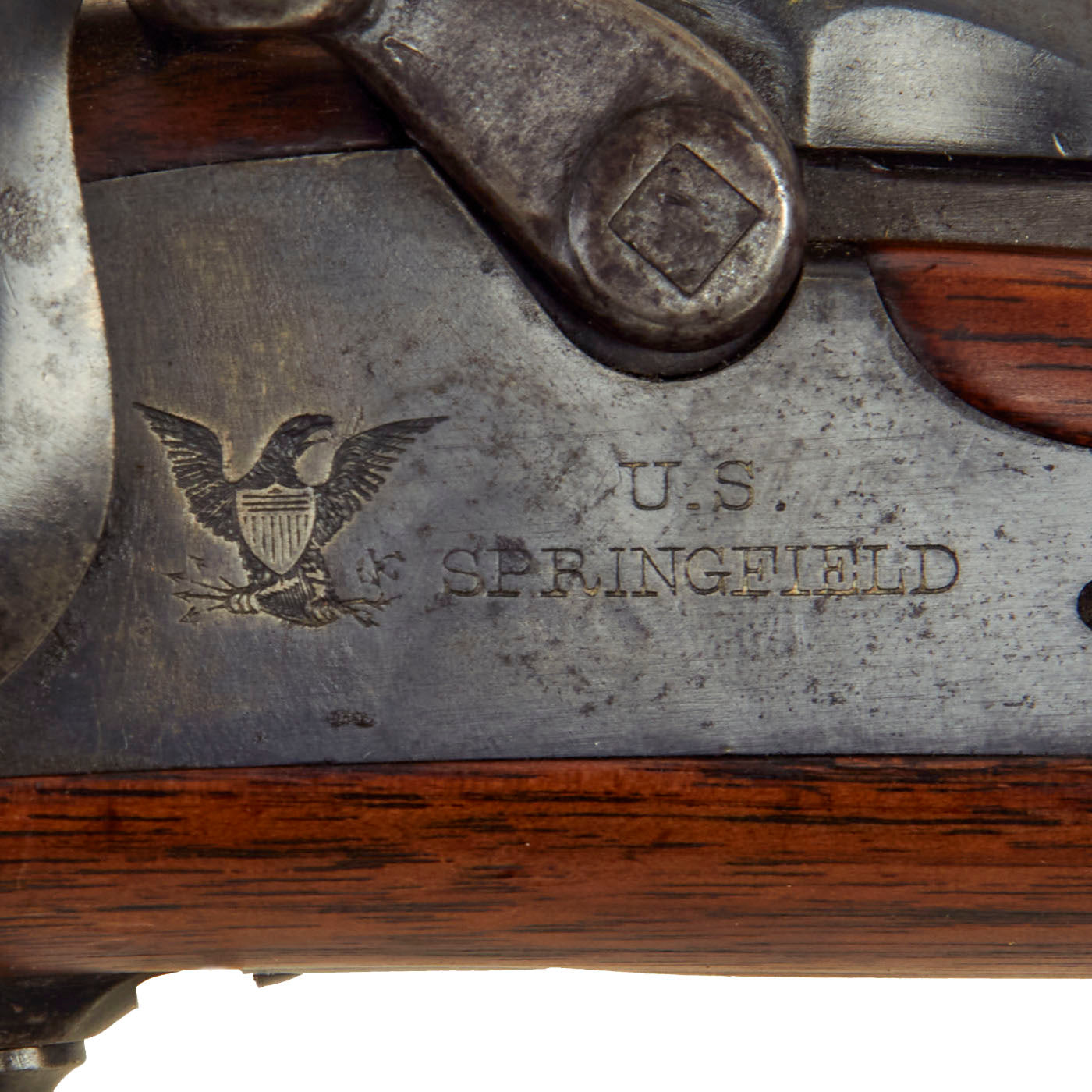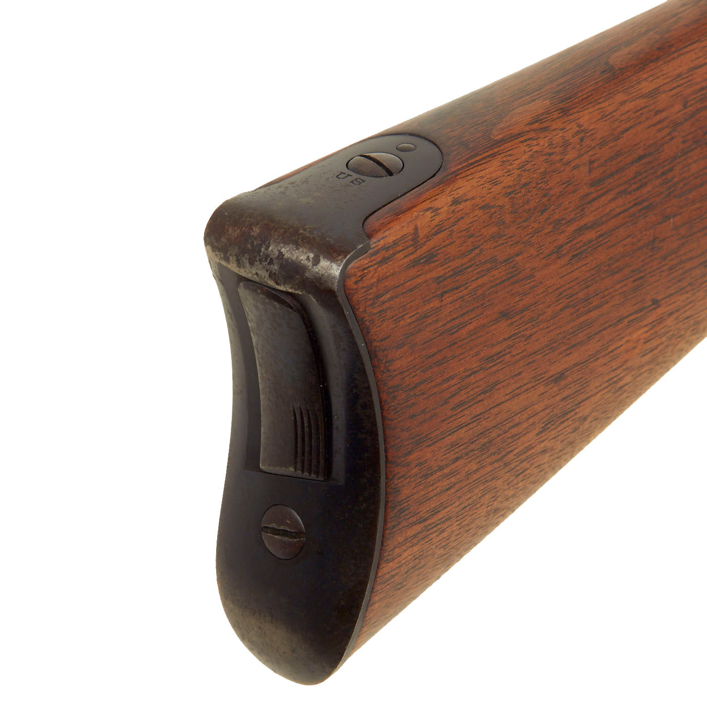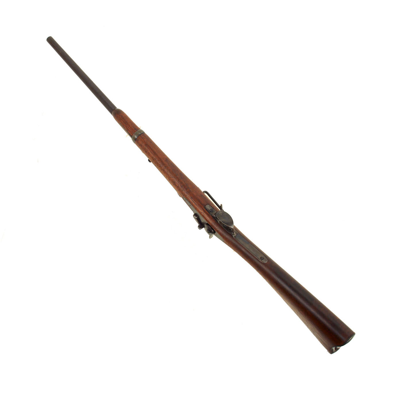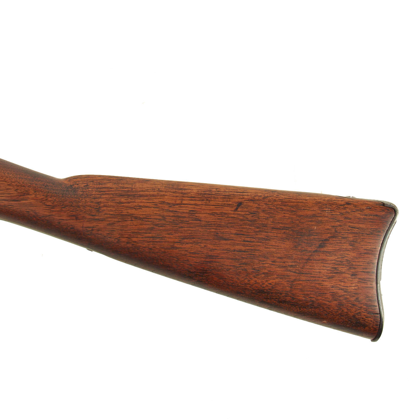 The butt plate is marked U.S. and the front band is U marked. The metalwork has been worn to a lovely faded blue patina overall, with signs of arsenal rebluing on the breech block and lock plate. Center fire breechloader, .45 cal., single band, saddle-ring on sliding bar, and fully functional carbine M1879 rear ladder sight. Lock is marked with an eagle and U.S. / SPRINGFIELD, manufactured at the United States Armory and Arsenal at Springfield, in Springfield, Massachusetts.