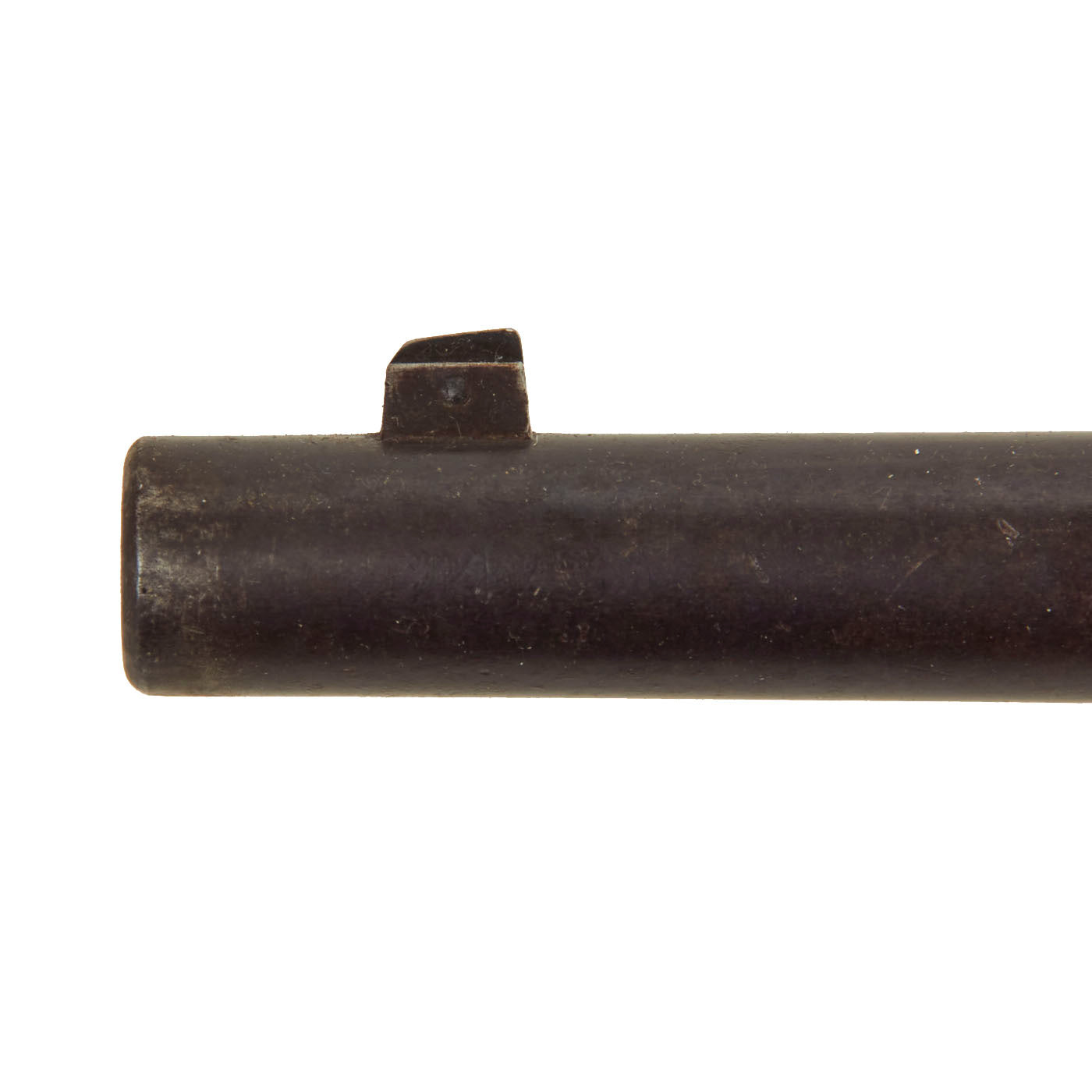 Additional marks of interest include inspectors' and proof marks around the breech end of the barrel, which are still clear: a capital R over the chamber, and a V over a P over an eagle's head over another P on the left side just above the stock. The upper right corner of the M1879 standard sliding sight leaf and the left side of the ramp are marked C to indicate that the sight graduations are for a rifle and not a carbine.
