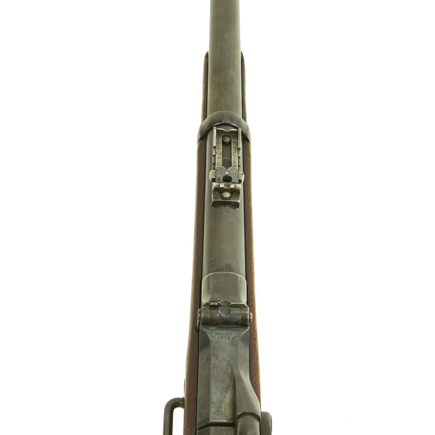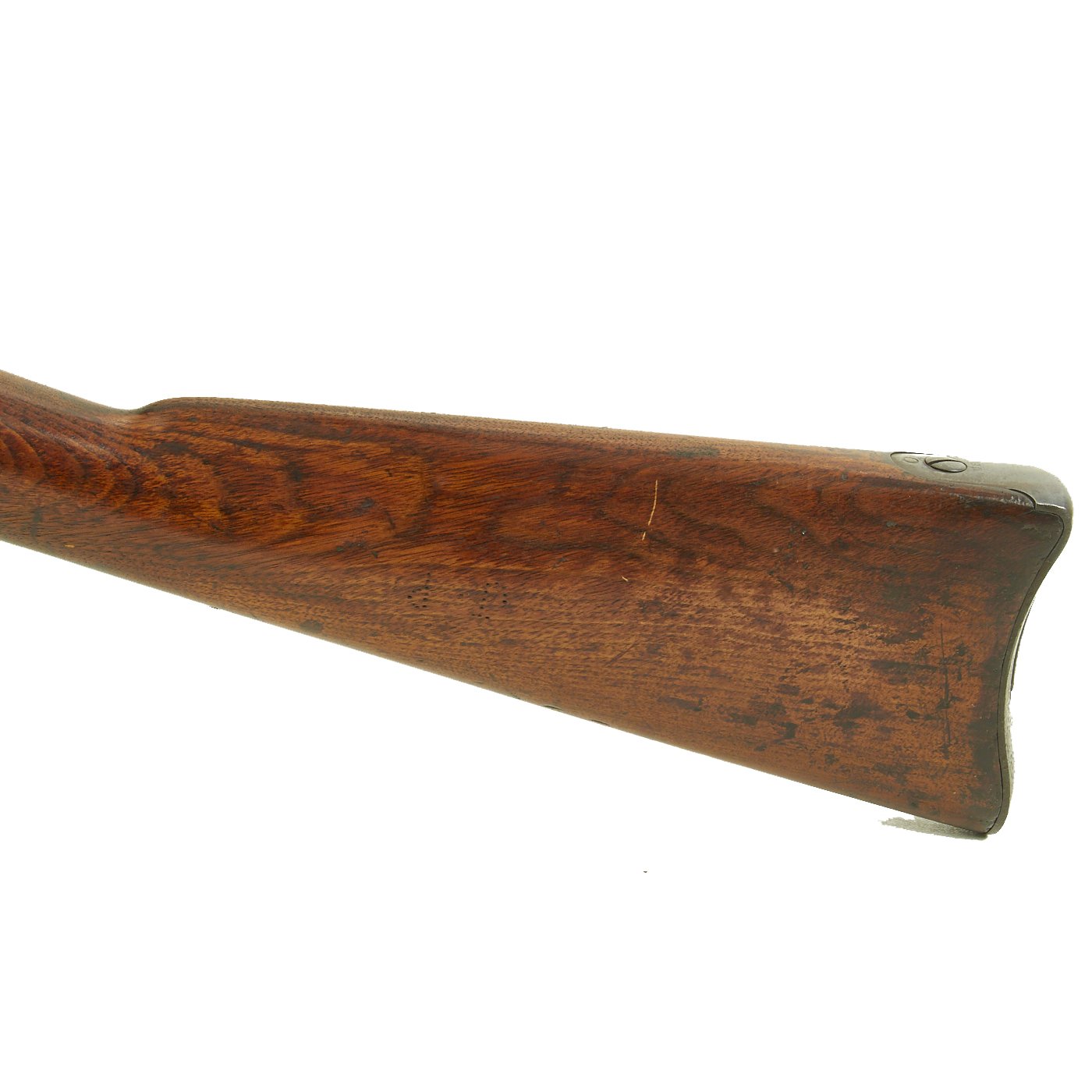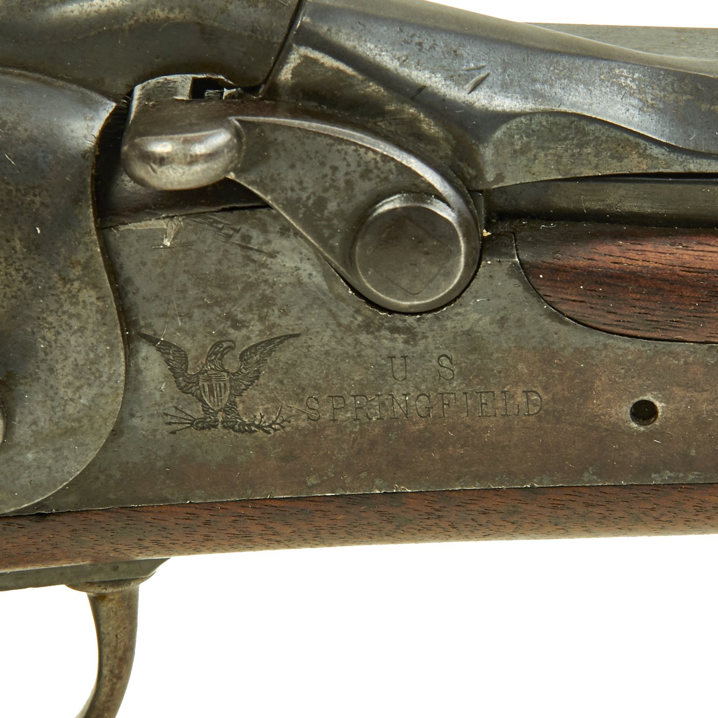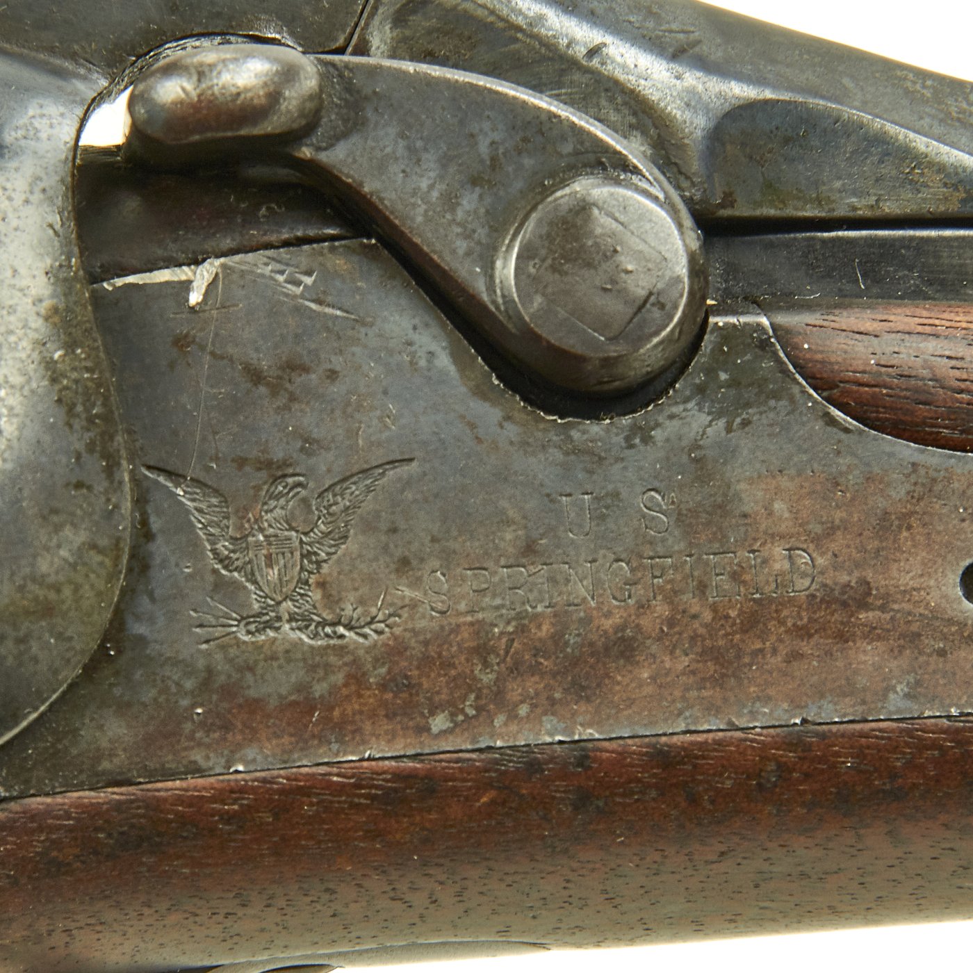 The butt plate is marked U.S. and the barrel band is U marked. Metal finish is a very nice, with a great faded plum color. Center fire breechloader, .45 cal., single band, no sling swivels, and a standard rear ladder sight. Lock is marked with an eagle and U.S. / SPRINGFIELD, manufactured by Springfield Armory, Springfield Massachusetts. Additional marks of interest include inspectors' and proof marks around the breech end of the barrel: a V over a P over an eagle's head over another P on the left side just above the stock.