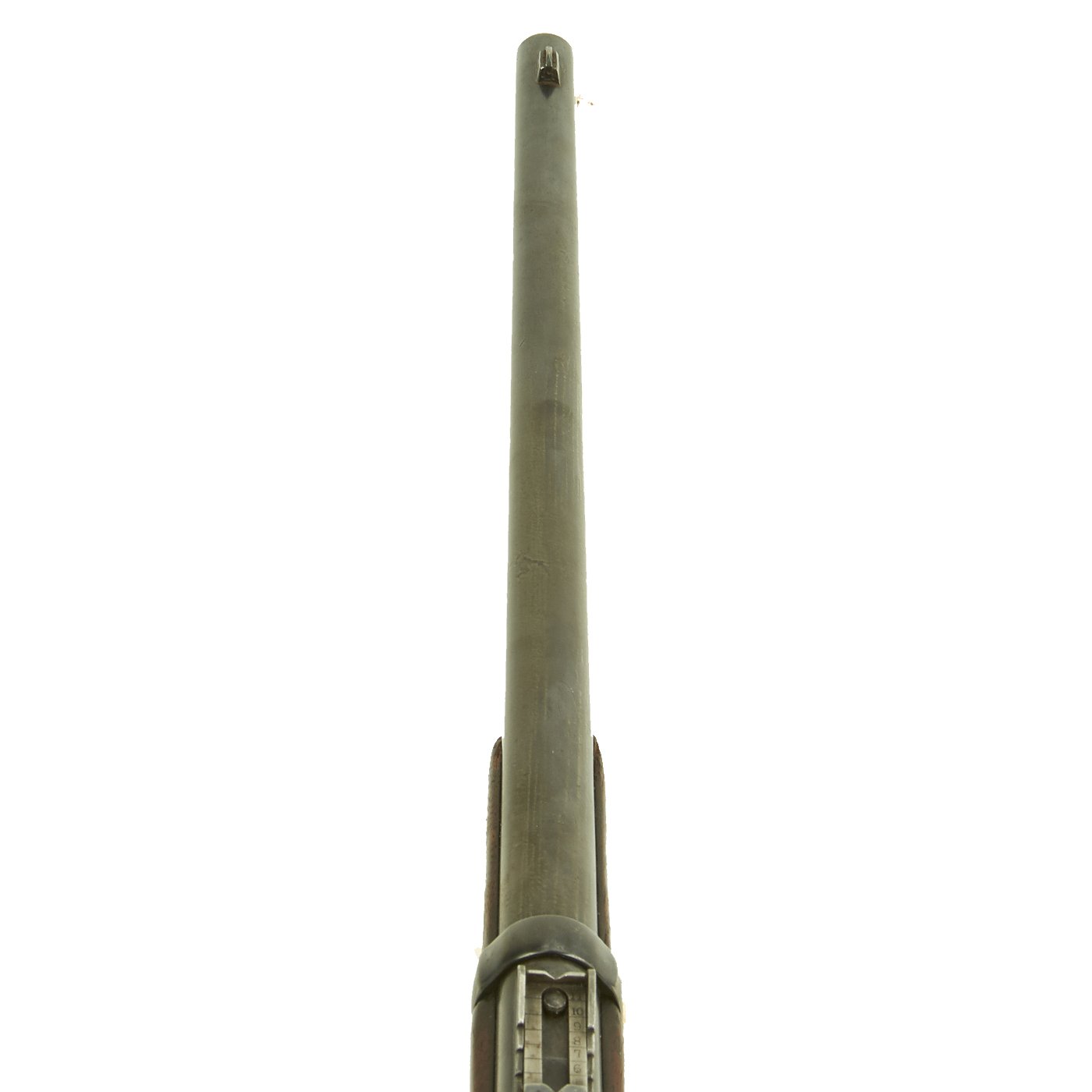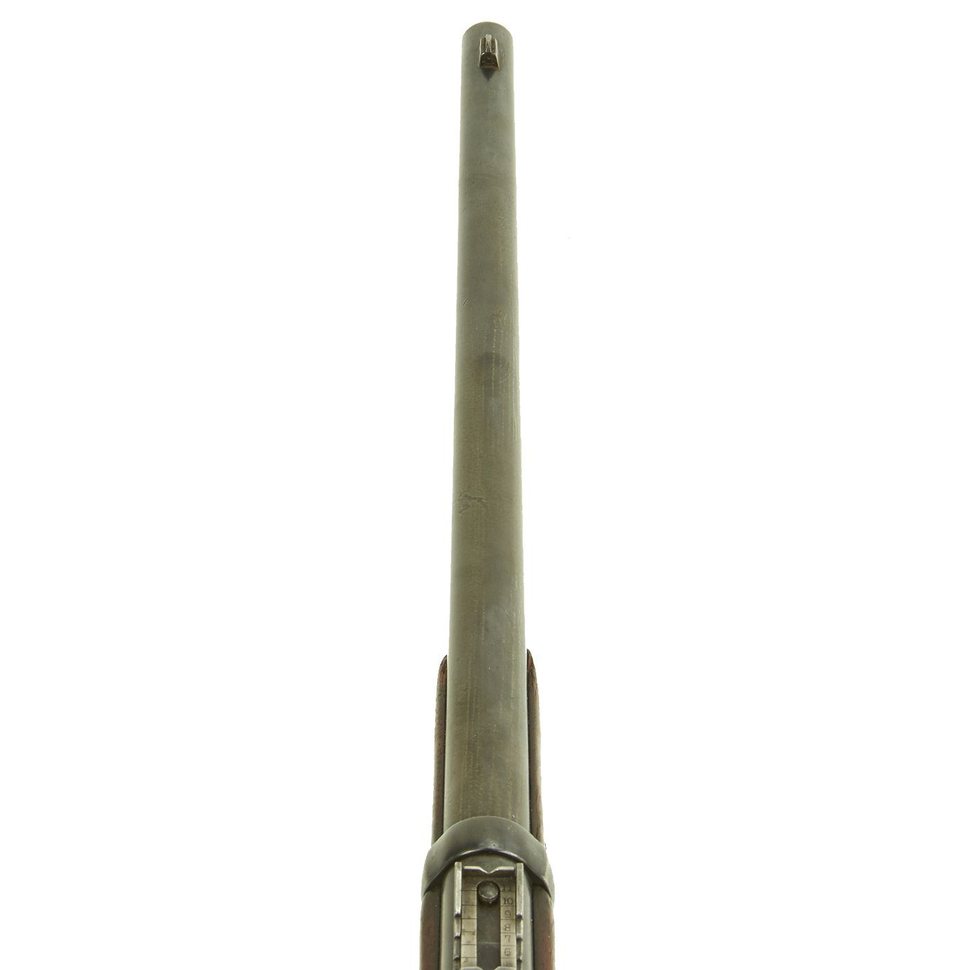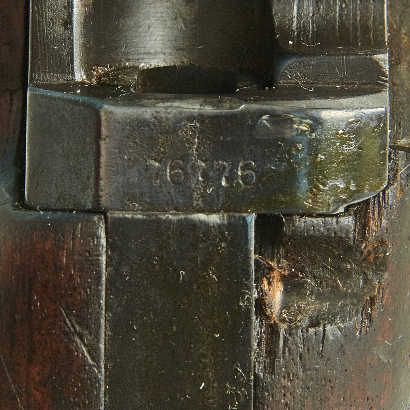 The stock is in good original condition, with a great color. It is still slightly proud over the lock plate, so it has not been reconditioned excessively. The bore shows clear lands and grooves, with a partly bright finish, and some oxidation in the grooves. The breech block extractor is present and functional, though we have not tested the ability to eject an actual spent cartridge. Another excellent and rarely seen feature on this example is the butt stock tool compartment, which is covered by a rotating door on the butt plate. This was used to store tools and the cleaning rod, definitely necessary on a carbine.