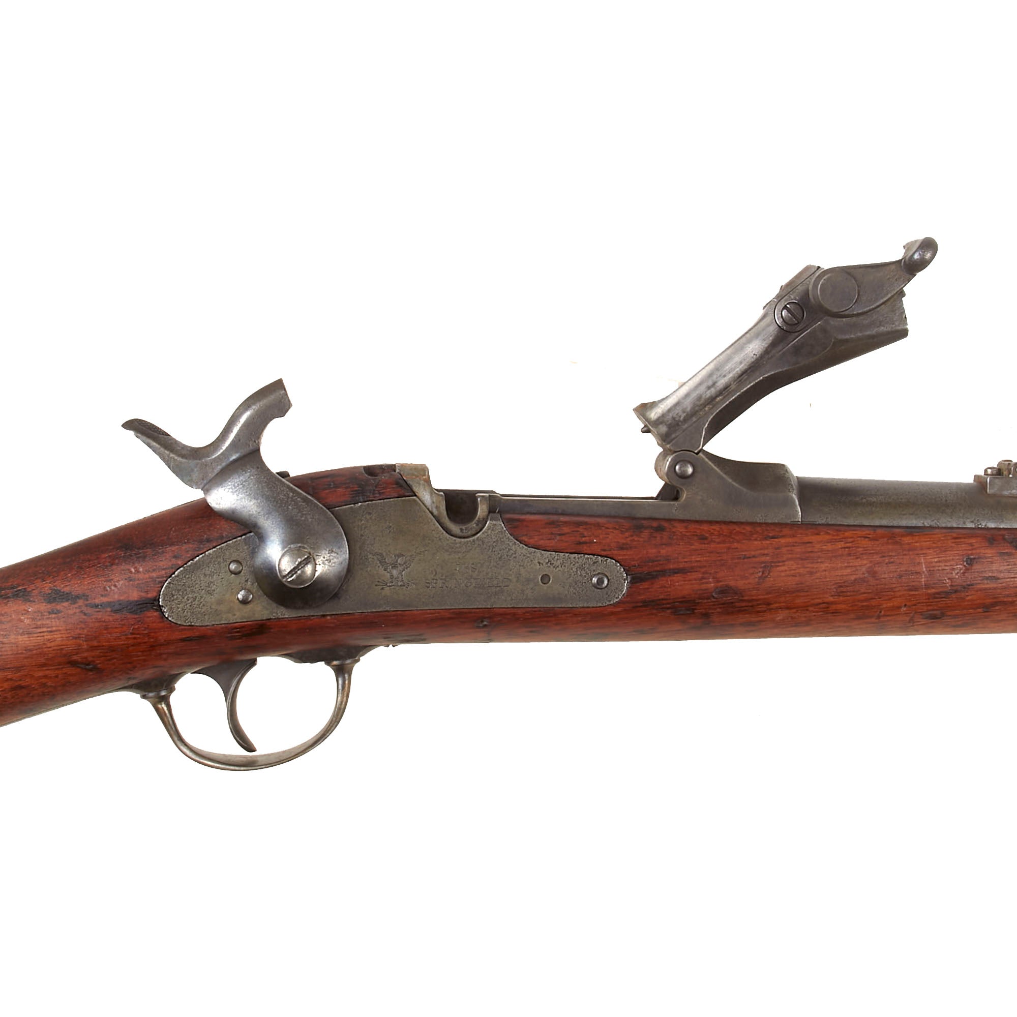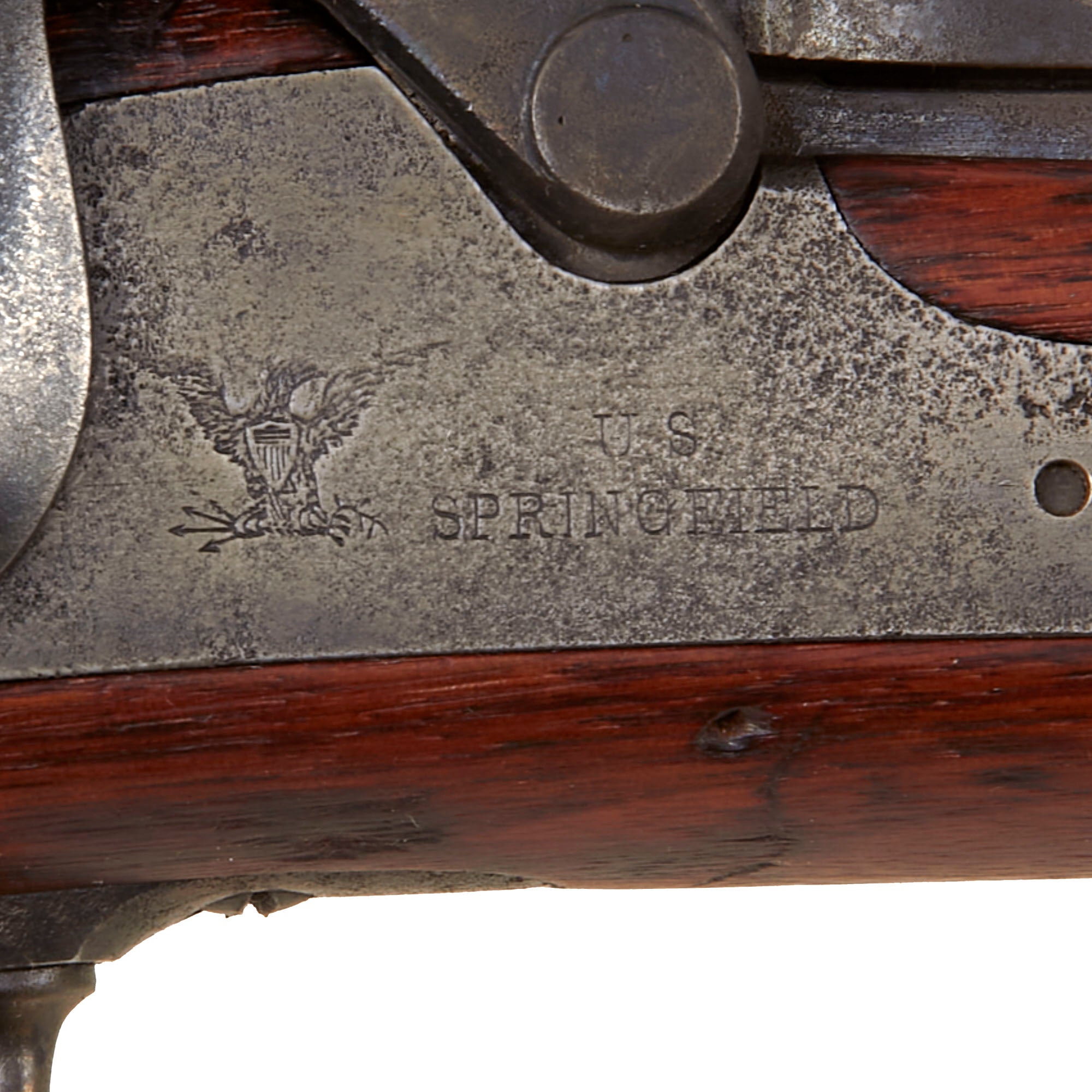 The butt plate is marked U.S. and the front band is U marked, as is correct, and the metalwork overall shows a light gray worn patina from years of use and cleaning. Center fire breechloader, .45 cal., single band, saddle-ring on sliding bar, and a working carbine M1879 rear ladder sight. Lock is marked with an eagle and U.S. / SPRINGFIELD, manufactured at the United States Armory and Arsenal at Springfield, in Springfield, Massachusetts.