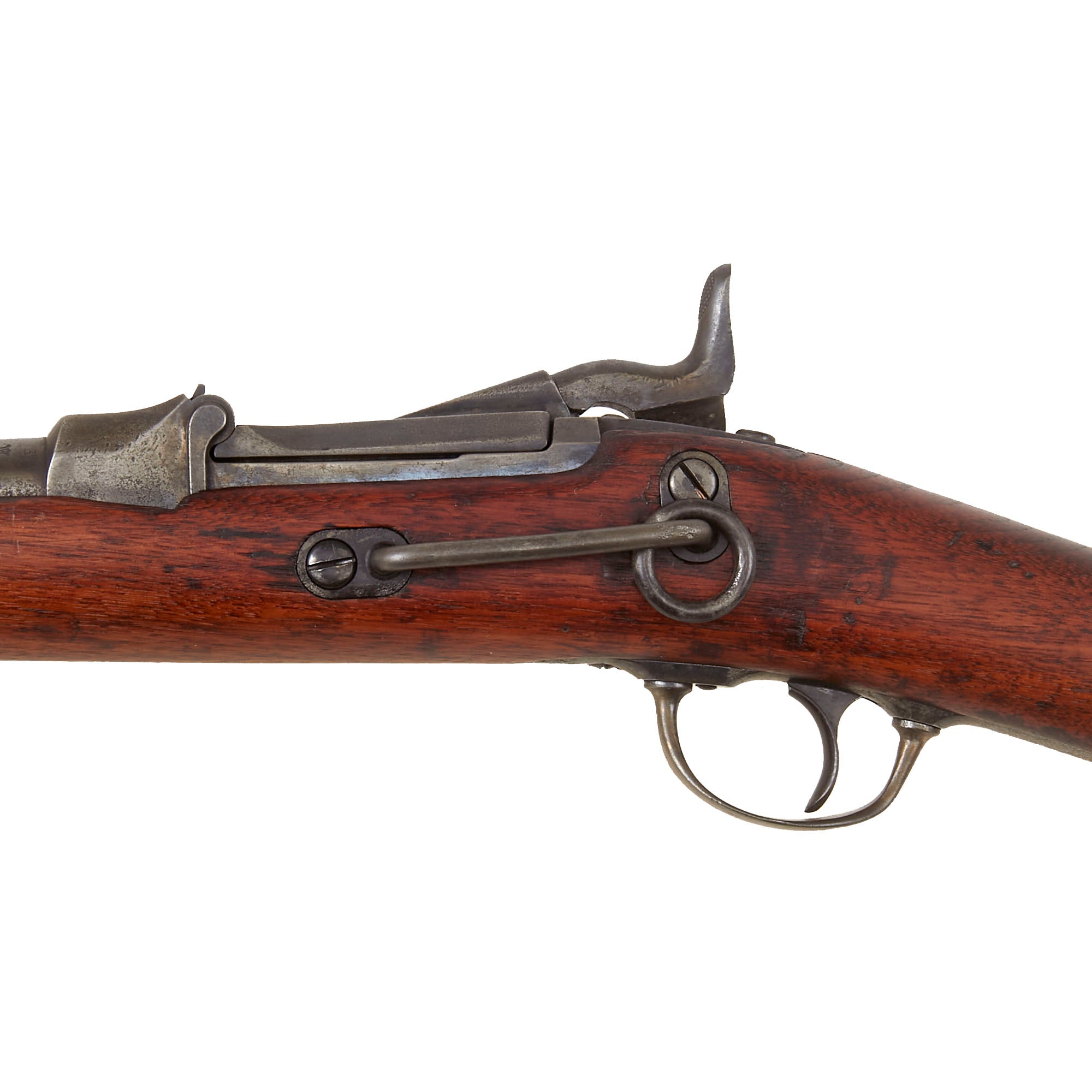 Offered in very good service used condition is this trapdoor rifle in .45-70 government caliber, complete with its original Saddle Ring and Bar on the left hand side of the wood stock. The serial number is 137503, and there are TRACES of what we believe was an SWP 1880 cartouche on the left side of the wrist. We can definitely see that the last number is a "0", but the rest is unclear. The serial number indicates production in approximately October 1880, per U.S. Government records, with stock inspection in the same year. The carbine has an overall service worn metal finish, with all proofs still present, and shows a lovely light gray matte patina. There are some traces of past peppering and light pitting on the exterior, particularly near the wood line and also on the lock plate.