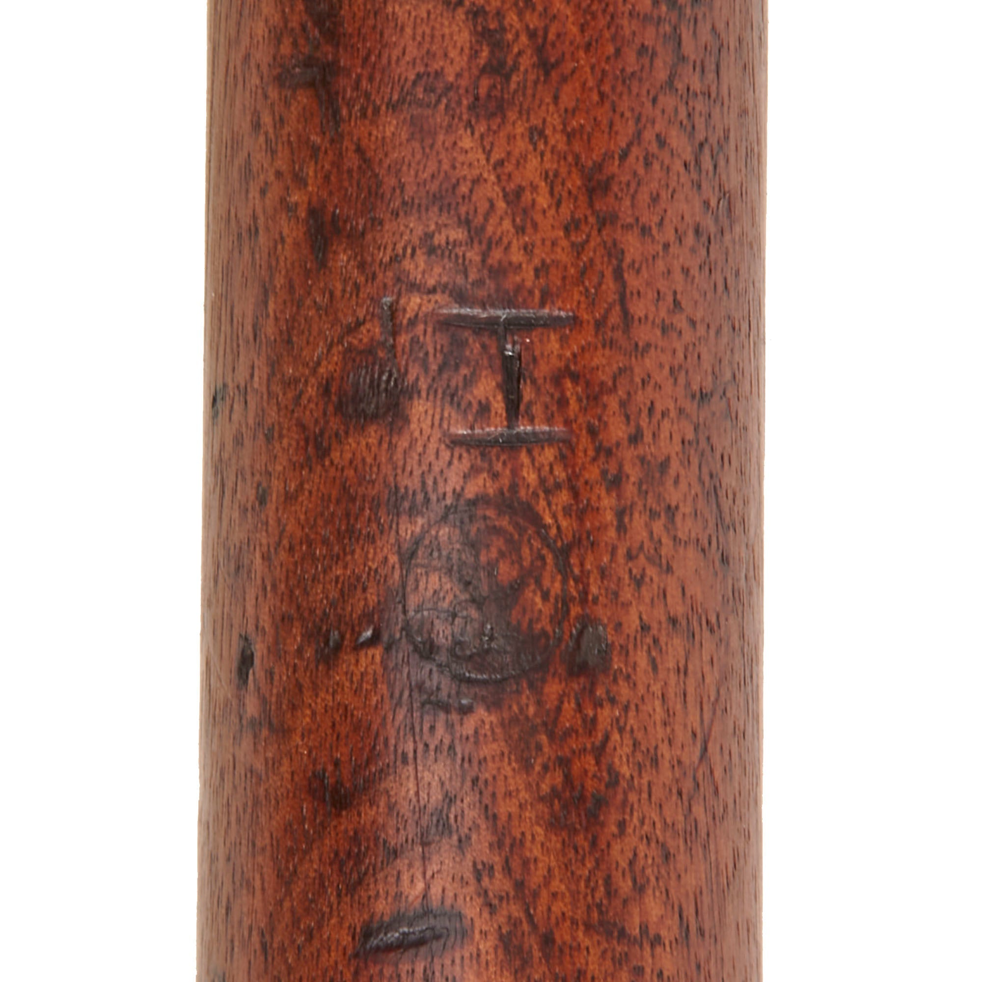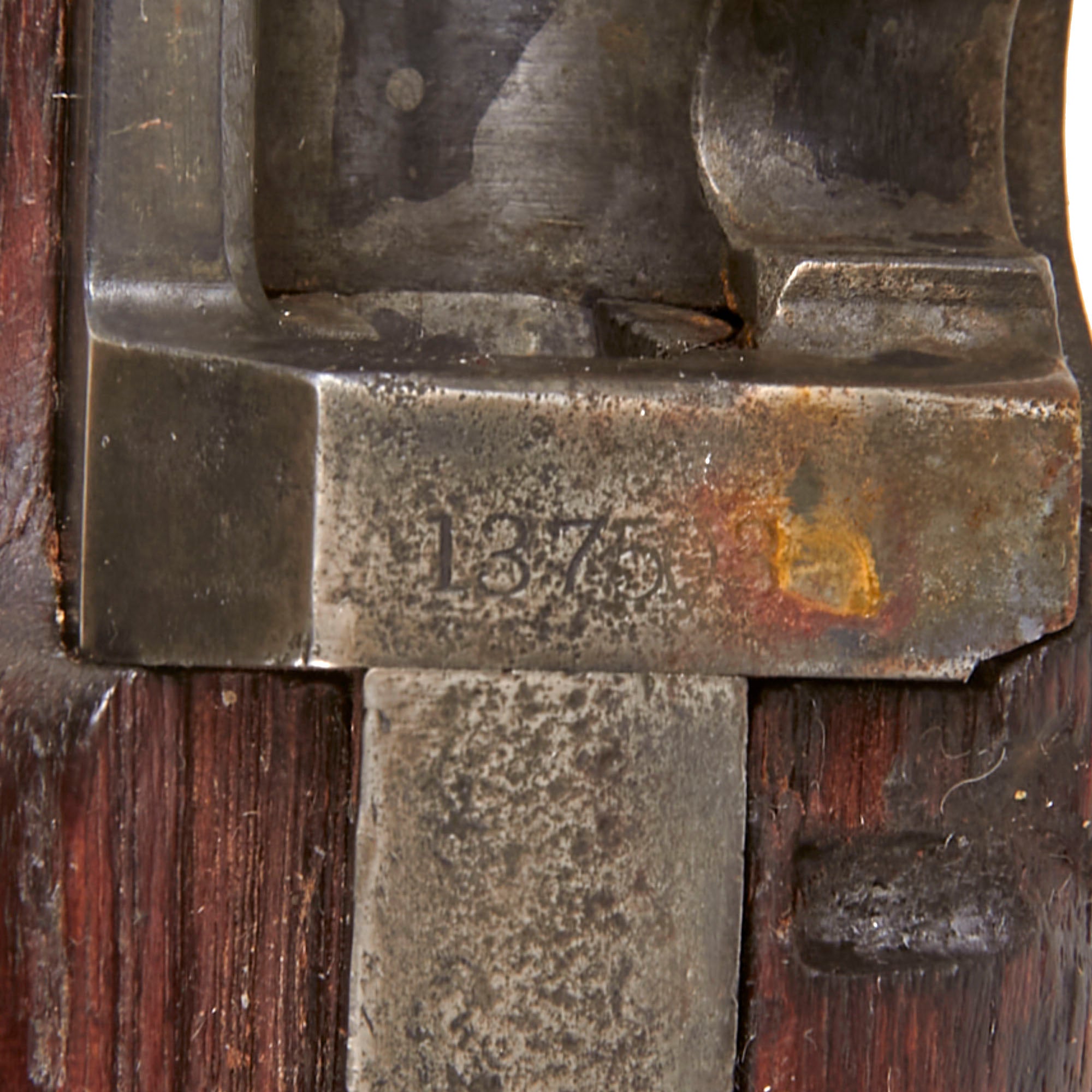 The faint script SWP belongs to Samuel W. Porter, who was the Master Armorer and Chief Inspector of Springfield Armory from 15 September 1879 to 18 June 1894. A faint stylized P in a circle under the wrist of the stock indicates that the rifle passed all of its overpressure proof testing. Additional marks of interest include inspectors' and proof marks around the breech end of the barrel, which are still clear: an R over the chamber, as well as a V over a P over an Eagle's head over another P on the left side just above the stock. The upper right corner of the M1879 standard sliding sight leaf and the left side of the ramp are marked C to indicate that the sight graduations are for a carbine and not a rifle.