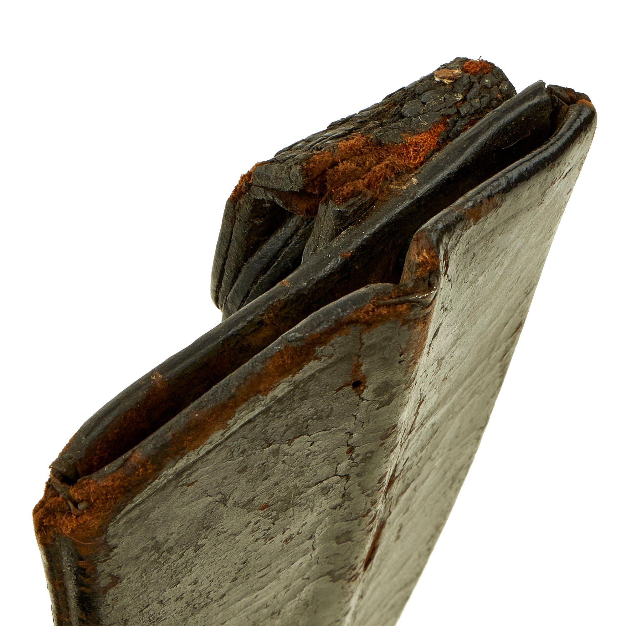 The bayonet comes complete with its original and rare leather covered tin scabbard with leather belt loop bearing and brass rosette showing a raised U.S. in a Circle. There is some rather extensive wear to the leather hanger and brass fittings, however these scabbards are rare in any condition.