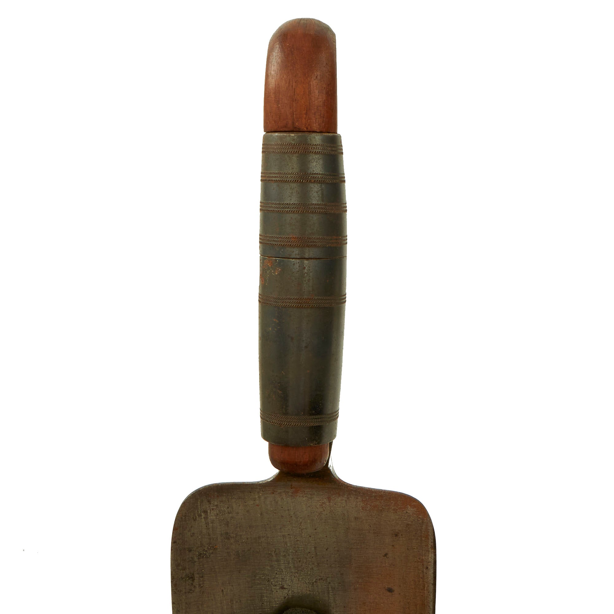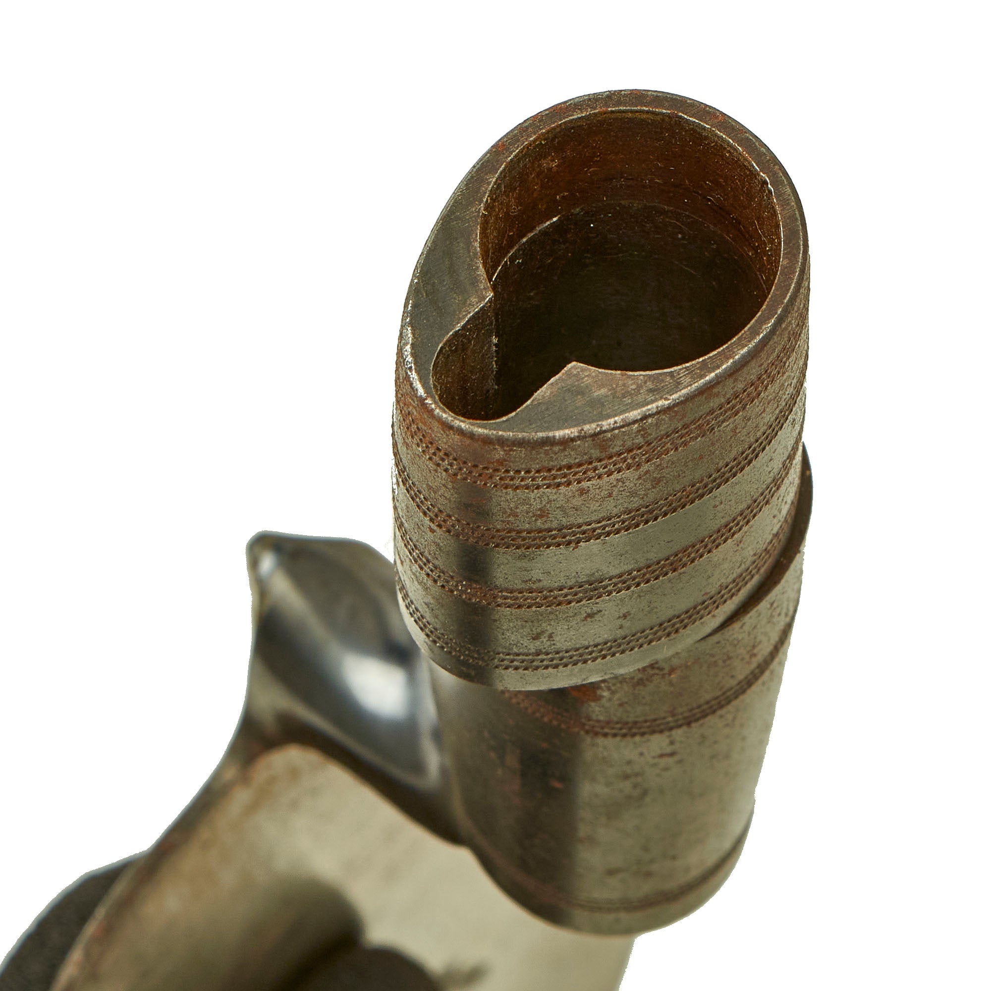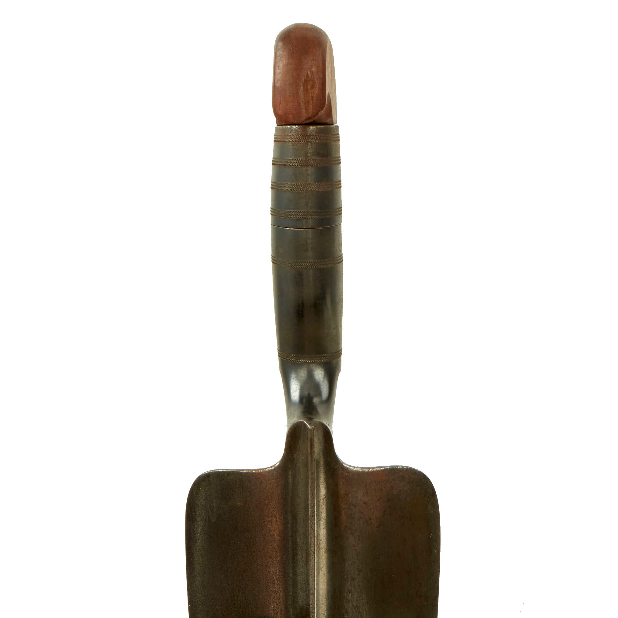 The trowel blade is 10-inch long and 3 3/8 inches wide, with a reinforced spine. The hilt portion of the Trowel/Bayonet still bears its heavily blued finish. The blade is still mostly bright, with just a tiny bit of staining and wear. Latching hinge in the socket is fully functional, and this example still includes the EXTREMELY RARE original wooden handle! It is a wooden rod with a curved end, which has a metal stud that locks it into the bayonet catch for the sight. It doesn't add much in length, but it definitely allows a much surer grip when "digging in." The Lightly knurled grip section is in excellent shape, with a faint patent marking on the right side above the hole for the front sight: PAT APR 16TH 72.