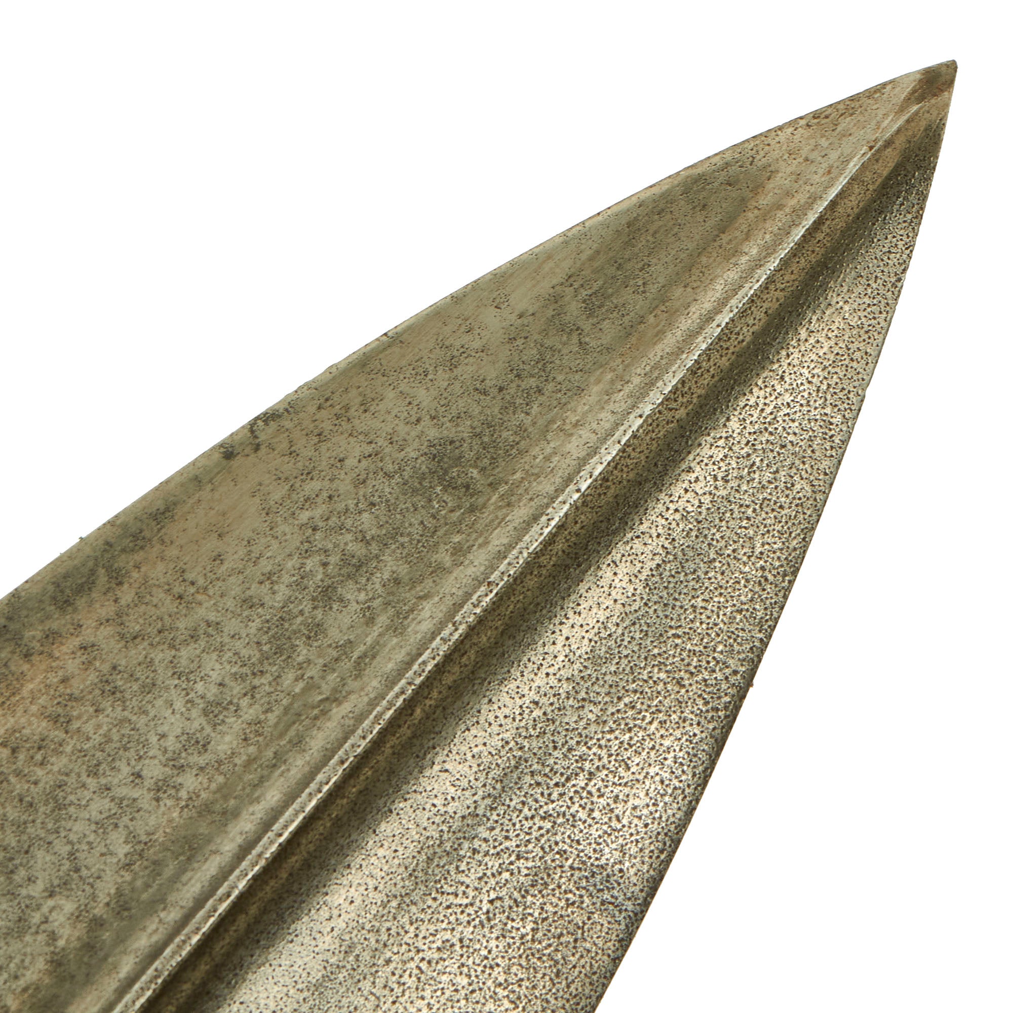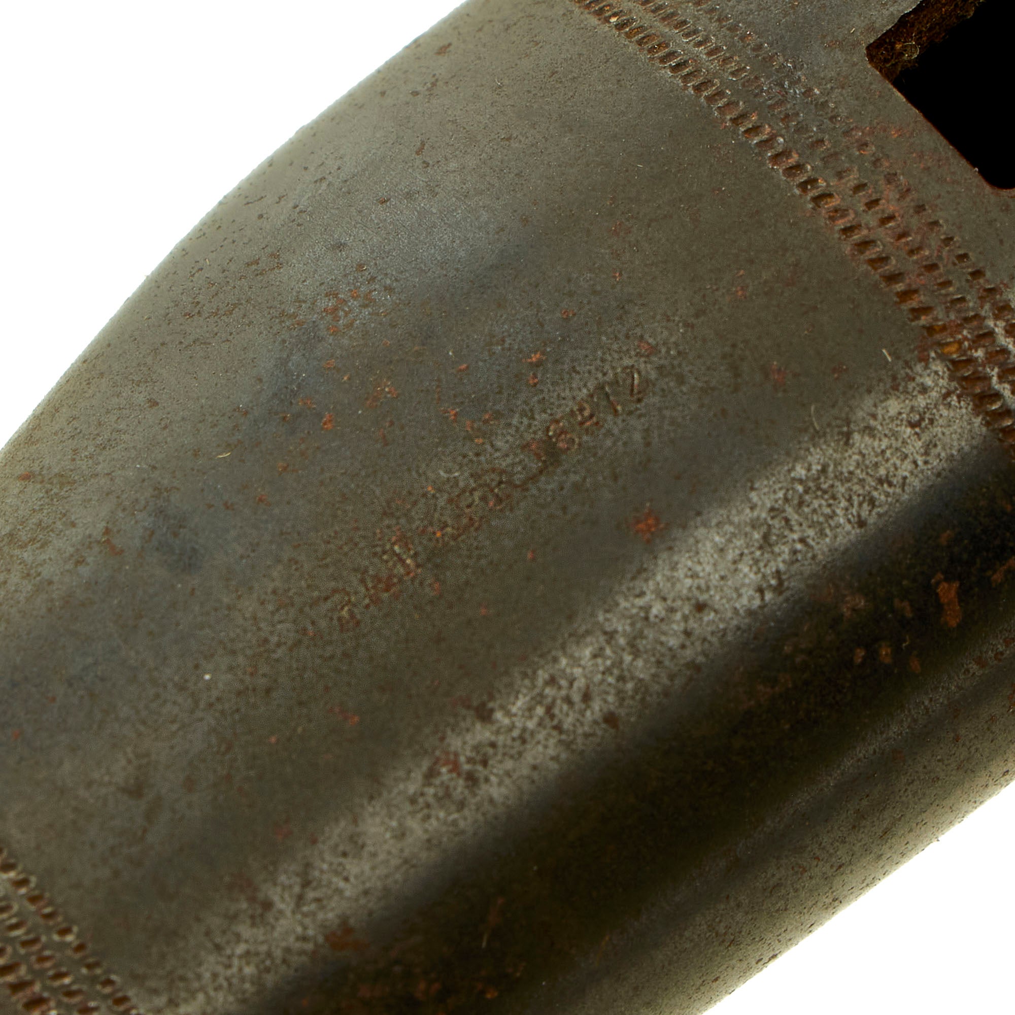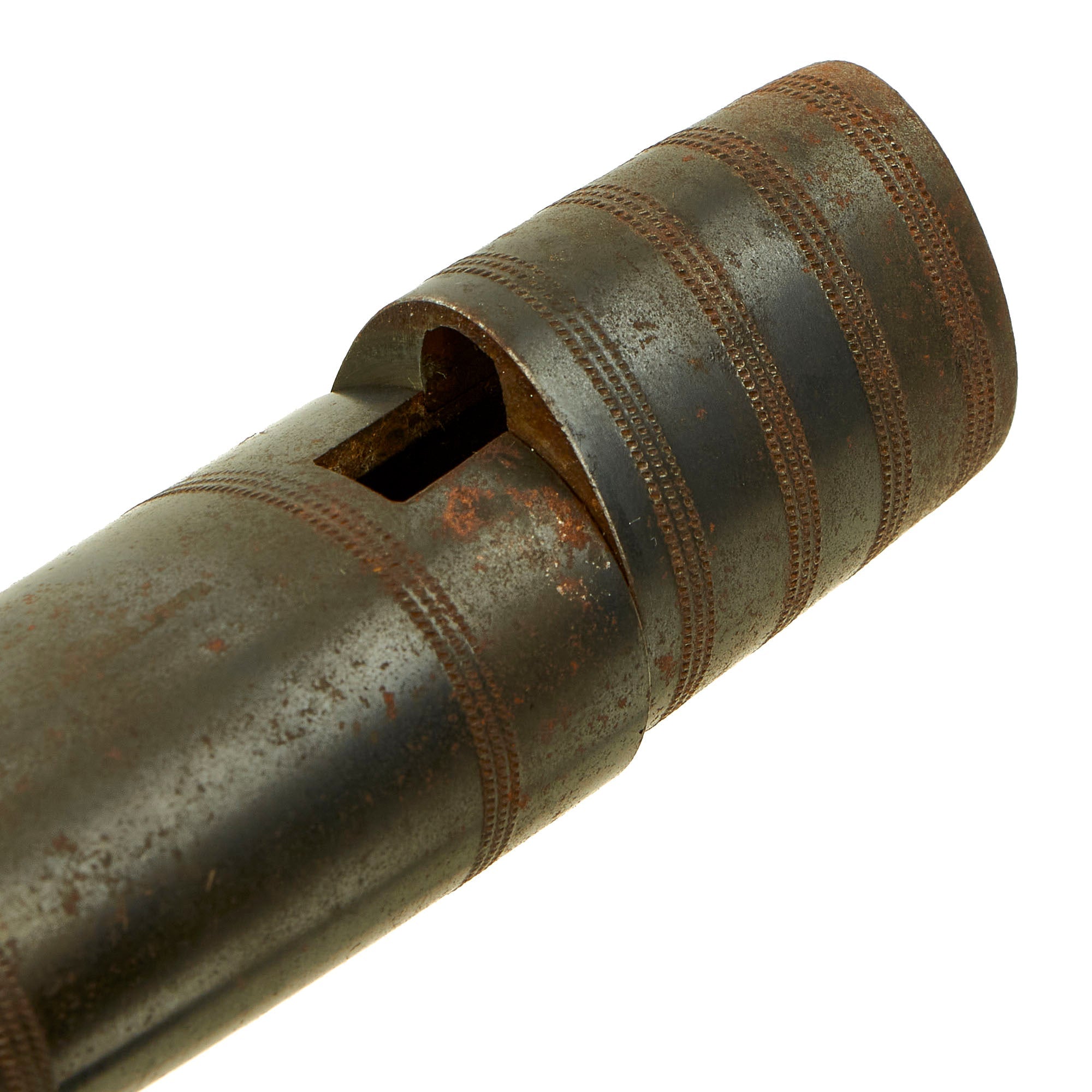 The trowel blade is 10-inch long and 3 3/8 inches wide, with a reinforced spine. The hilt portion of the Trowel/Bayonet still bears its heavily blued finish. The blade is still mostly bright, with just a tiny bit of staining and wear. Latching hinge in the socket is fully functional, and this example still includes the EXTREMELY RARE original wooden handle! It is a wooden rod with a curved end, which has a metal stud that locks it into the bayonet catch for the sight. It doesn't add much in length, but it definitely allows a much surer grip when "digging in." The Lightly knurled grip section is in excellent shape, with a faint patent marking on the right side above the hole for the front sight: PAT APR 16TH 72.