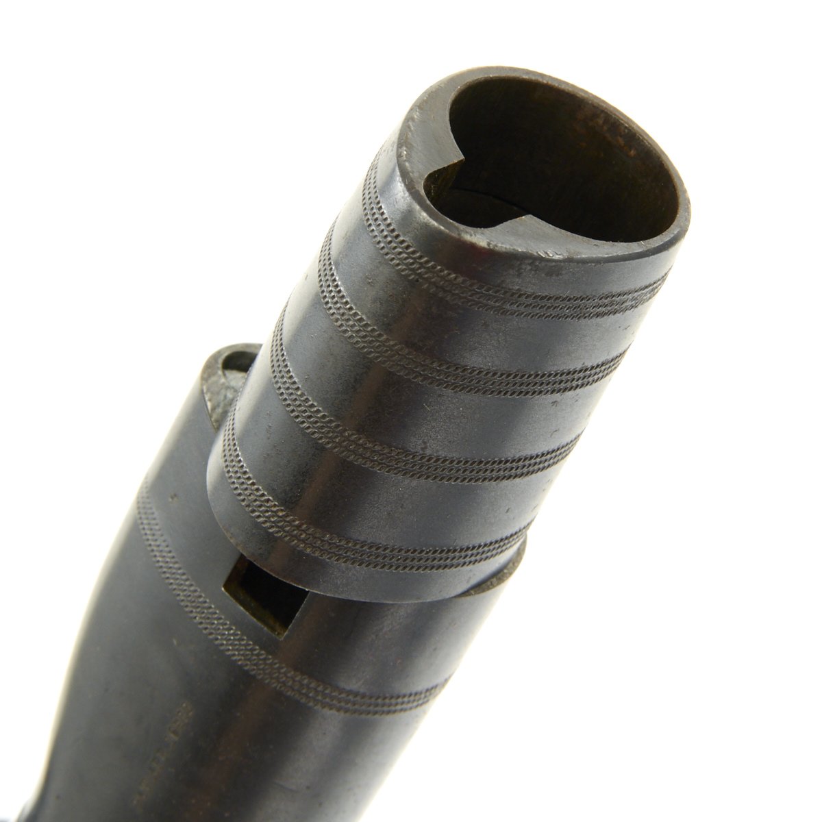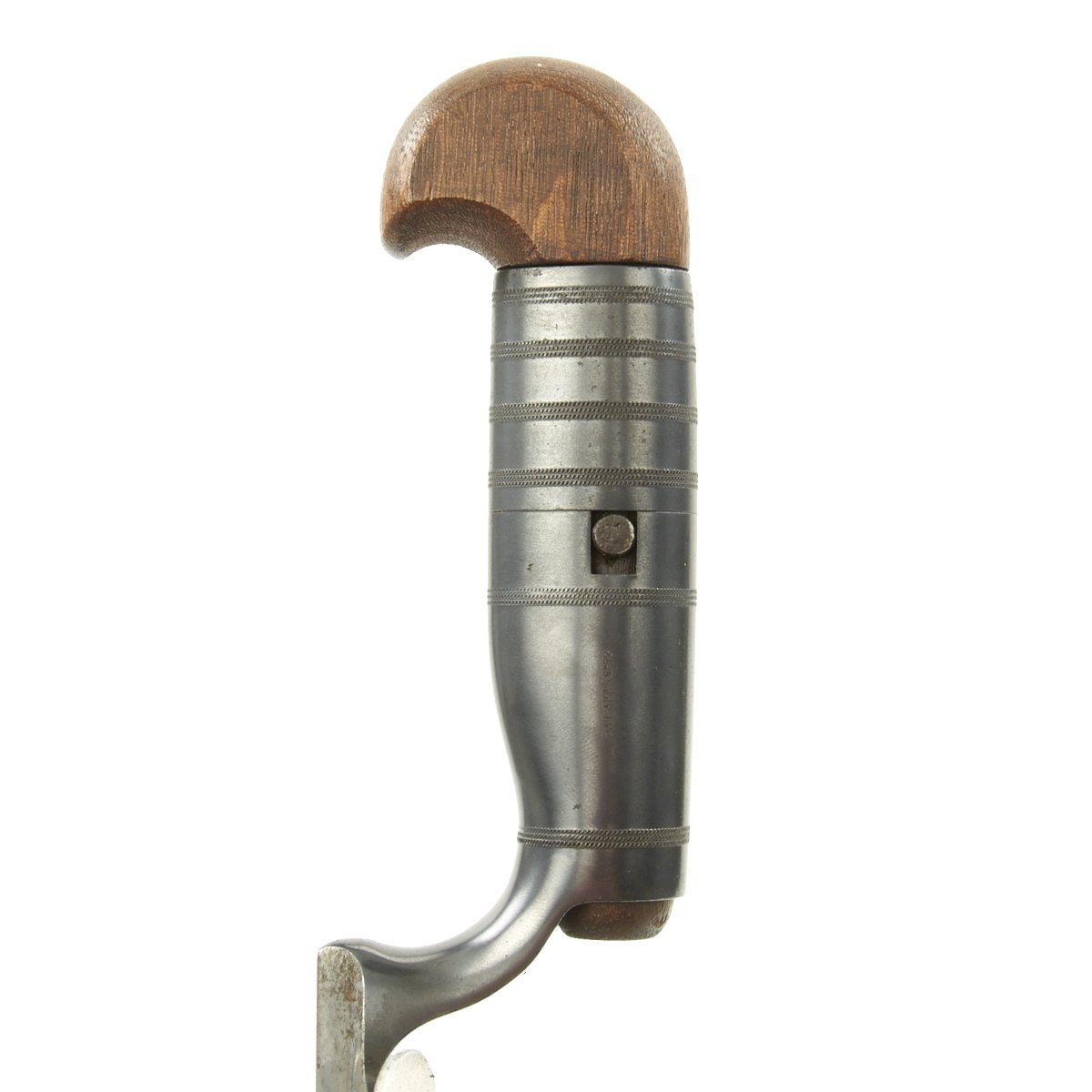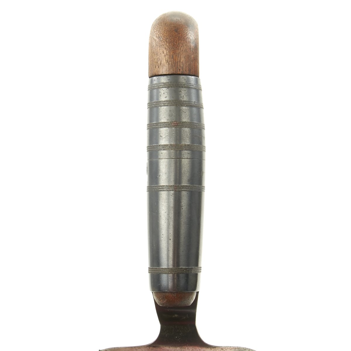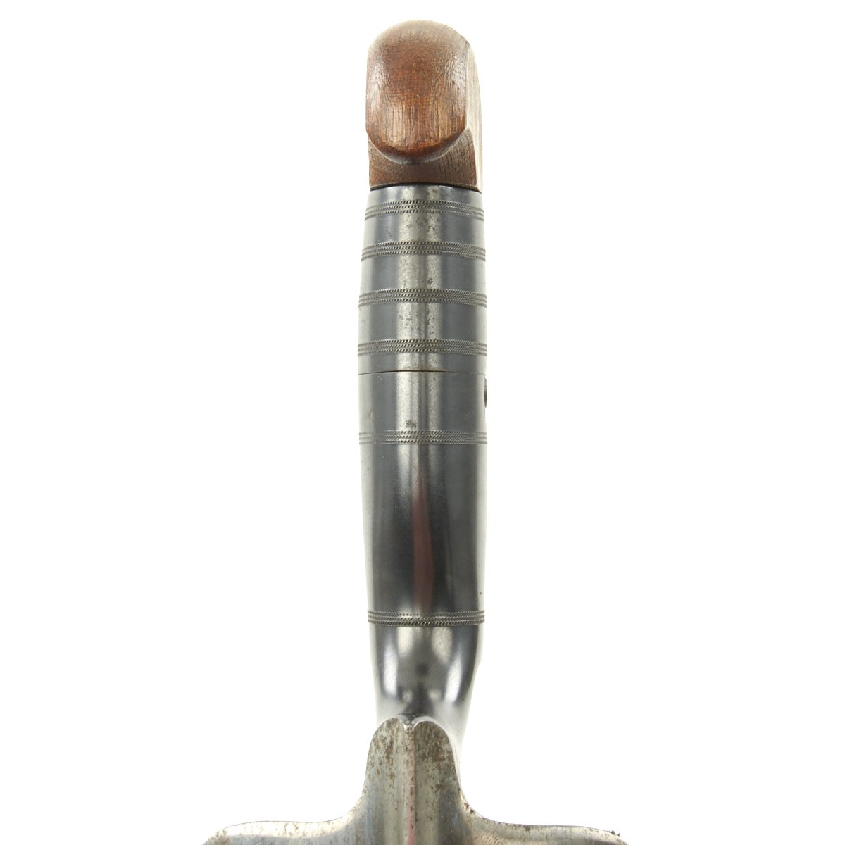 The trowel blade is 10-inch long and 3 3/8 inches wide, with a reinforced spine. The hilt portion of the Trowel/Bayonet still bears its heavily blued finish. The blade is still bright, with just a tiny bit of staining and wear. Latching hinge in the socket is fully functional, and this example still includes the EXTREMELY RARE original wooden handle! It is a wooden rod with a curved end, which has a metal stud that locks it into the bayonet catch for the sight. It doesn't add much in length, but it definitely allows a much surer grip when "digging in." The Lightly knurled grip section is in excellent shape, with a patent marking on the right side above the hole for the front sight: PAT APR 16TH 72.