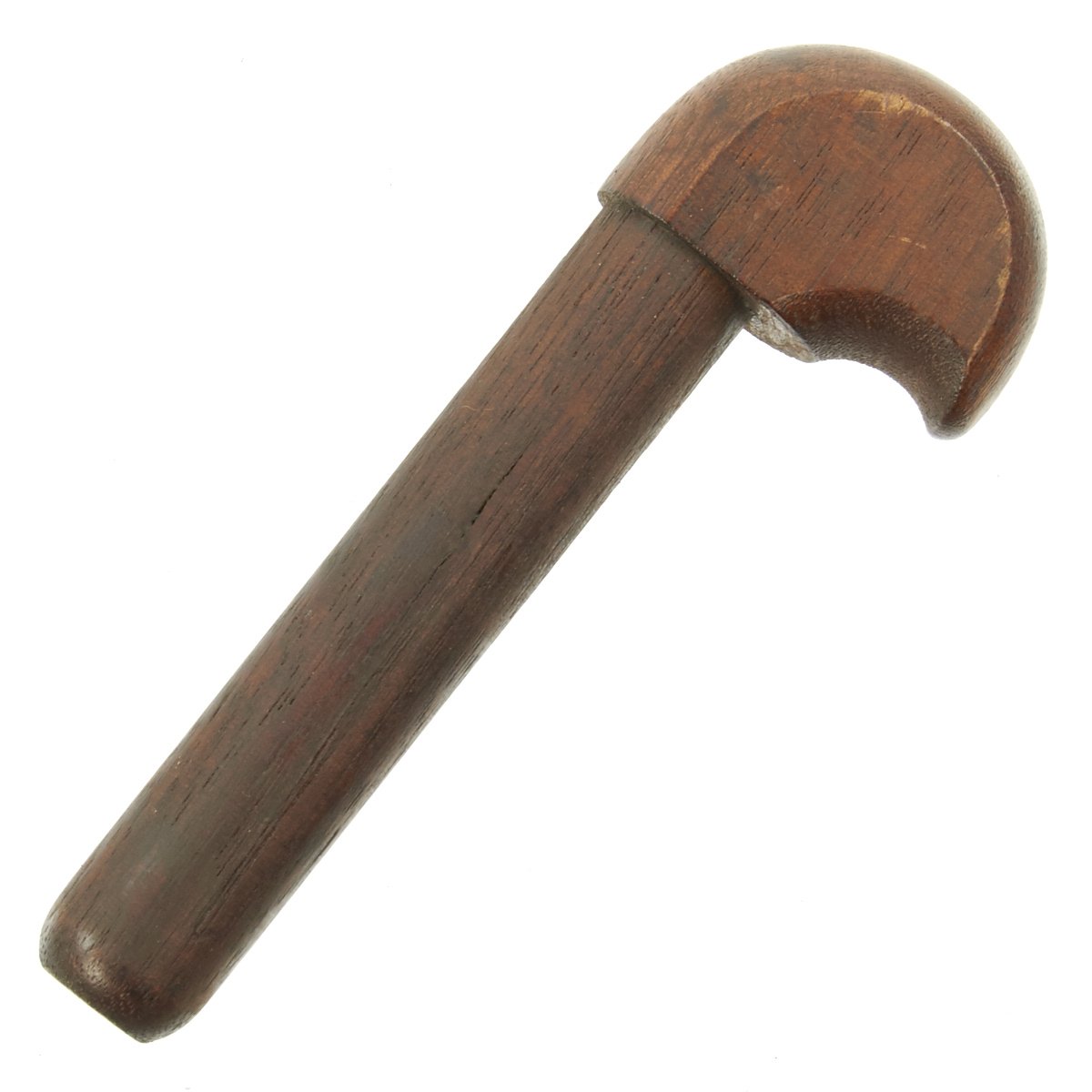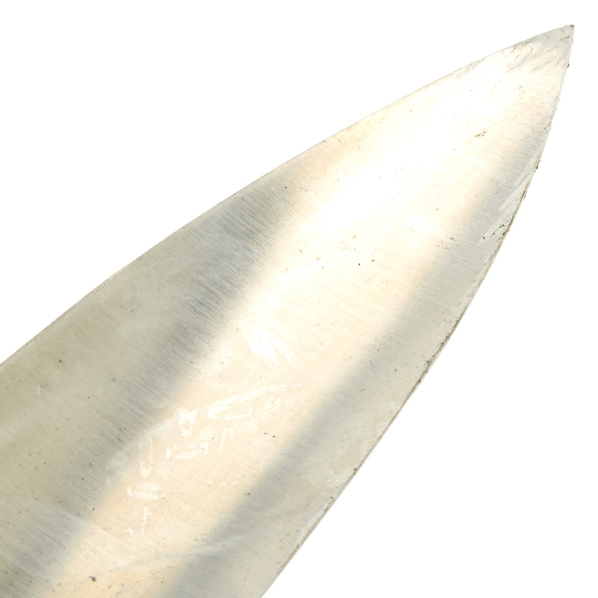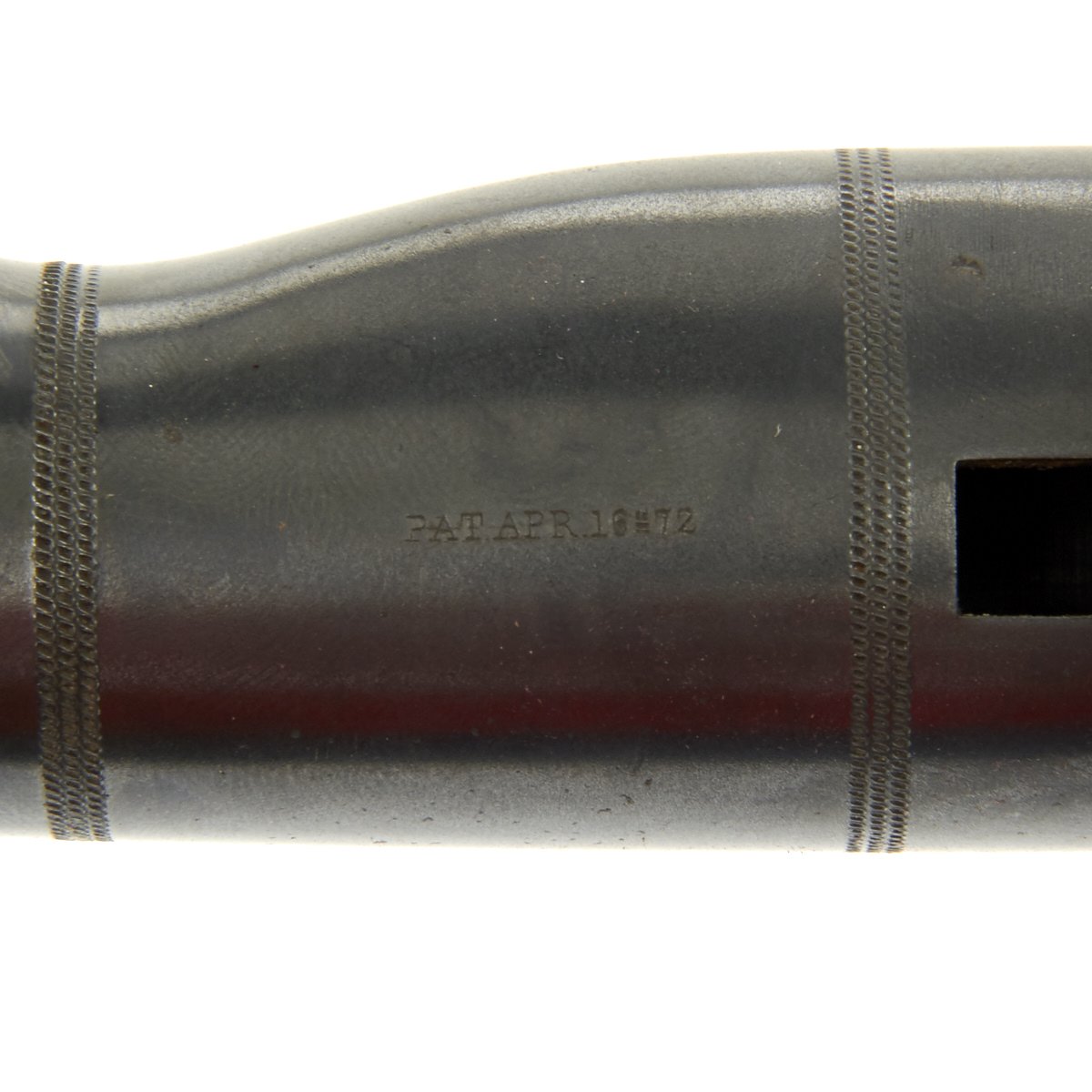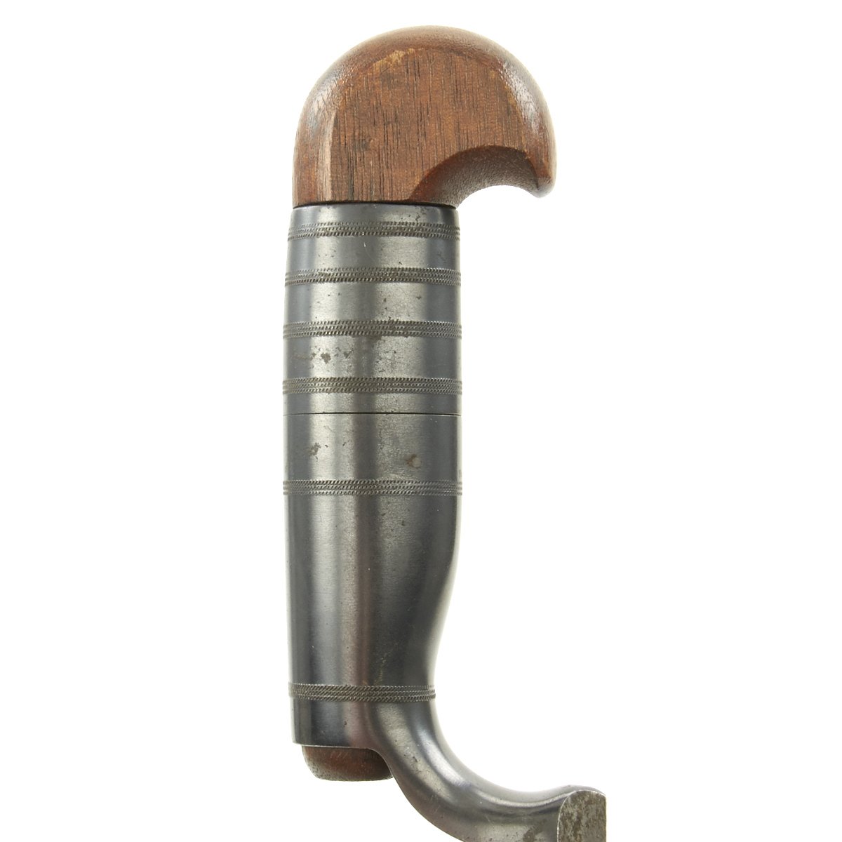 The trowel blade is 10-inch long and 3 3/8 inches wide, with a reinforced spine. The hilt portion of the Trowel/Bayonet still bears its heavily blued finish. The blade is still bright, with just a tiny bit of staining and wear. Latching hinge in the socket is fully functional, and this example still includes the EXTREMELY RARE original wooden handle! It is a wooden rod with a curved end, which has a metal stud that locks it into the bayonet catch for the sight. It doesn't add much in length, but it definitely allows a much surer grip when "digging in." The Lightly knurled grip section is in excellent shape, with a patent marking on the right side above the hole for the front sight: PAT APR 16TH 72.