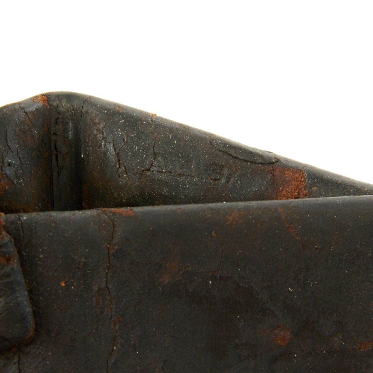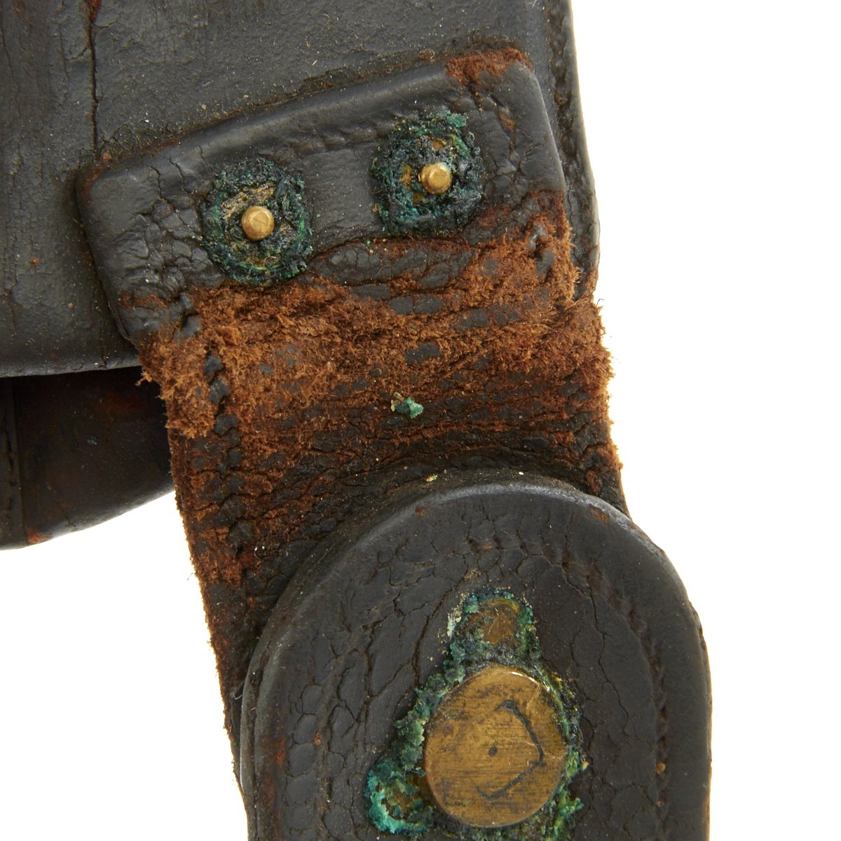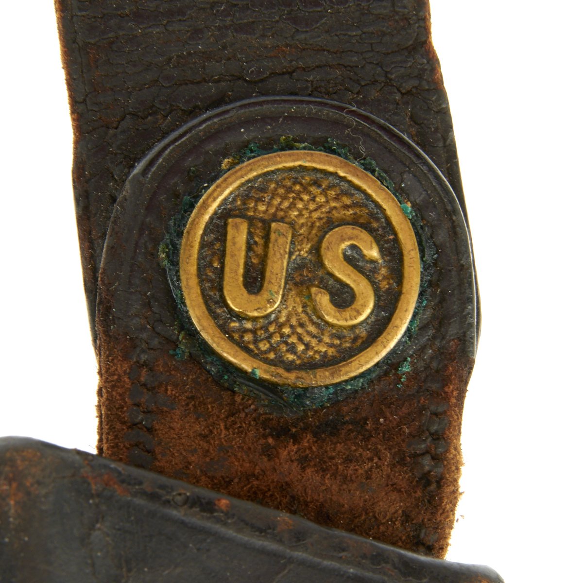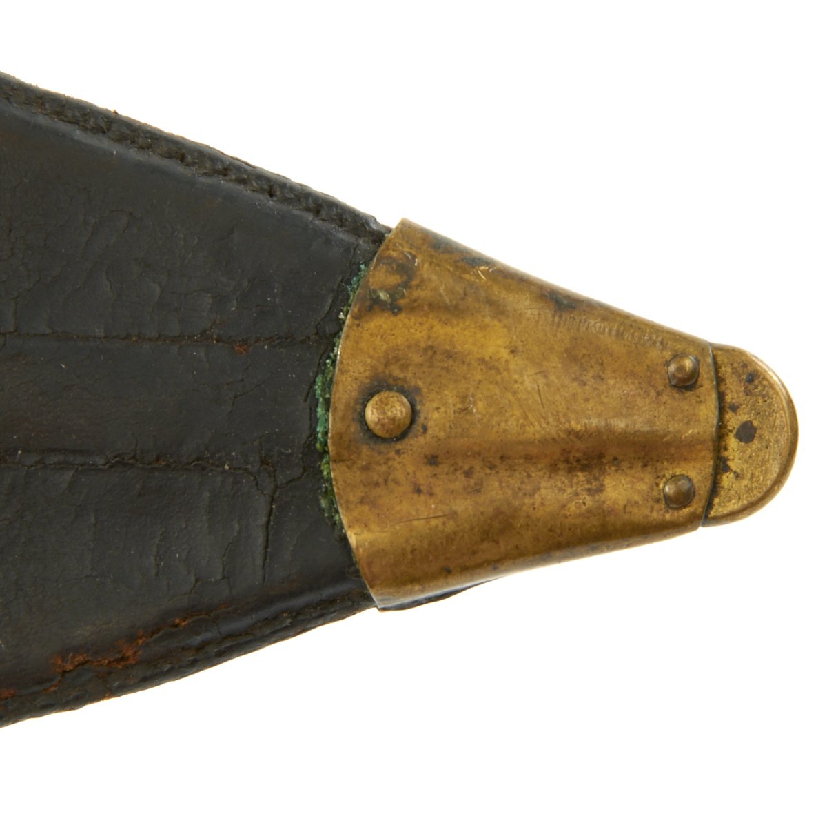 The bayonet comes complete with its original and rare leather covered tin scabbard with leather belt loop bearing and brass rosette showing a raised U.S.