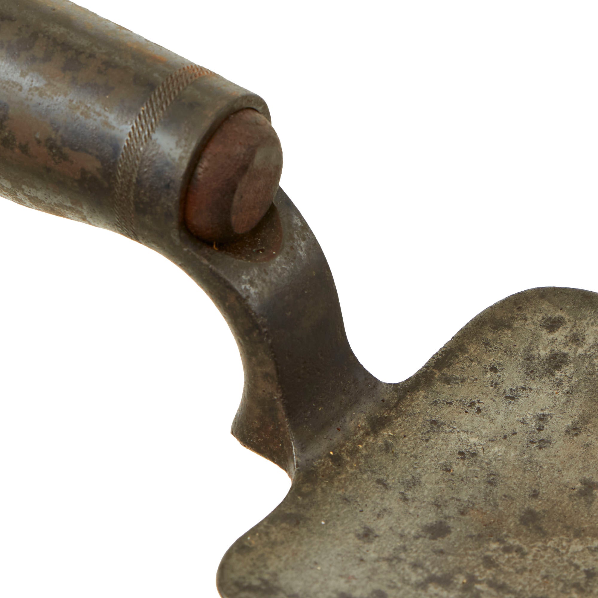 The trowel blade is 10-inch long and 3 3/8 inches wide, with a reinforced spine. The hilt portion of the Trowel/Bayonet still bears its heavily blued finish in spots. The blade is still partly bright, but there is definitely some staining and light pitting and wear. There are some areas of darker rust but it does look to be able to be cleaned up if you wish to do so. The wooden plug insert is well-retained without any serious wear, looking to be an arsenal spare or possibly a replica.