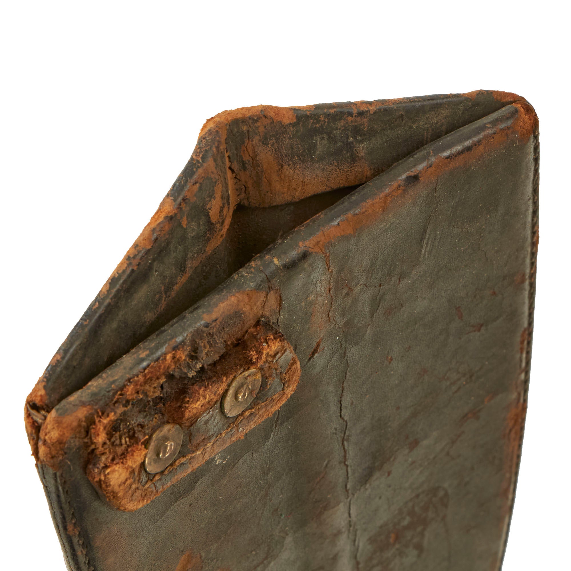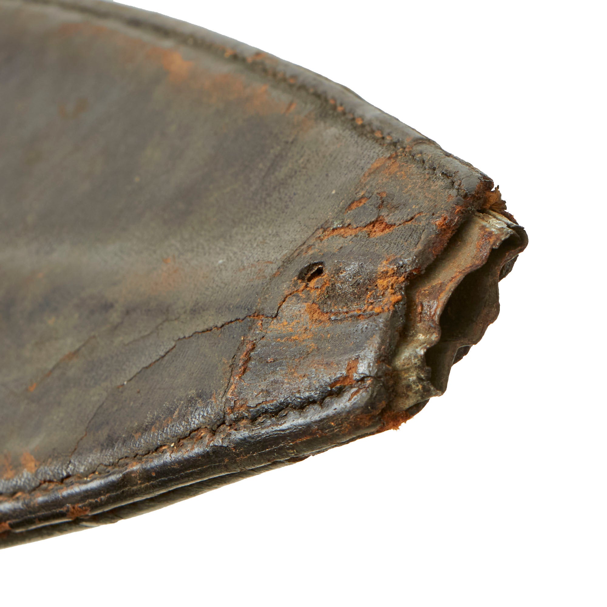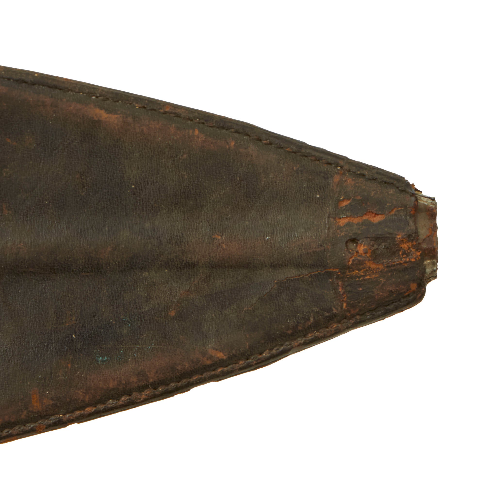 The bayonet comes complete with its original and rare leather covered tin scabbard, only missing the leather belt loop bearing and brass rosette and the brass drag. There is some rather extensive wear to the leather hanger, however these scabbards are rare in any condition.