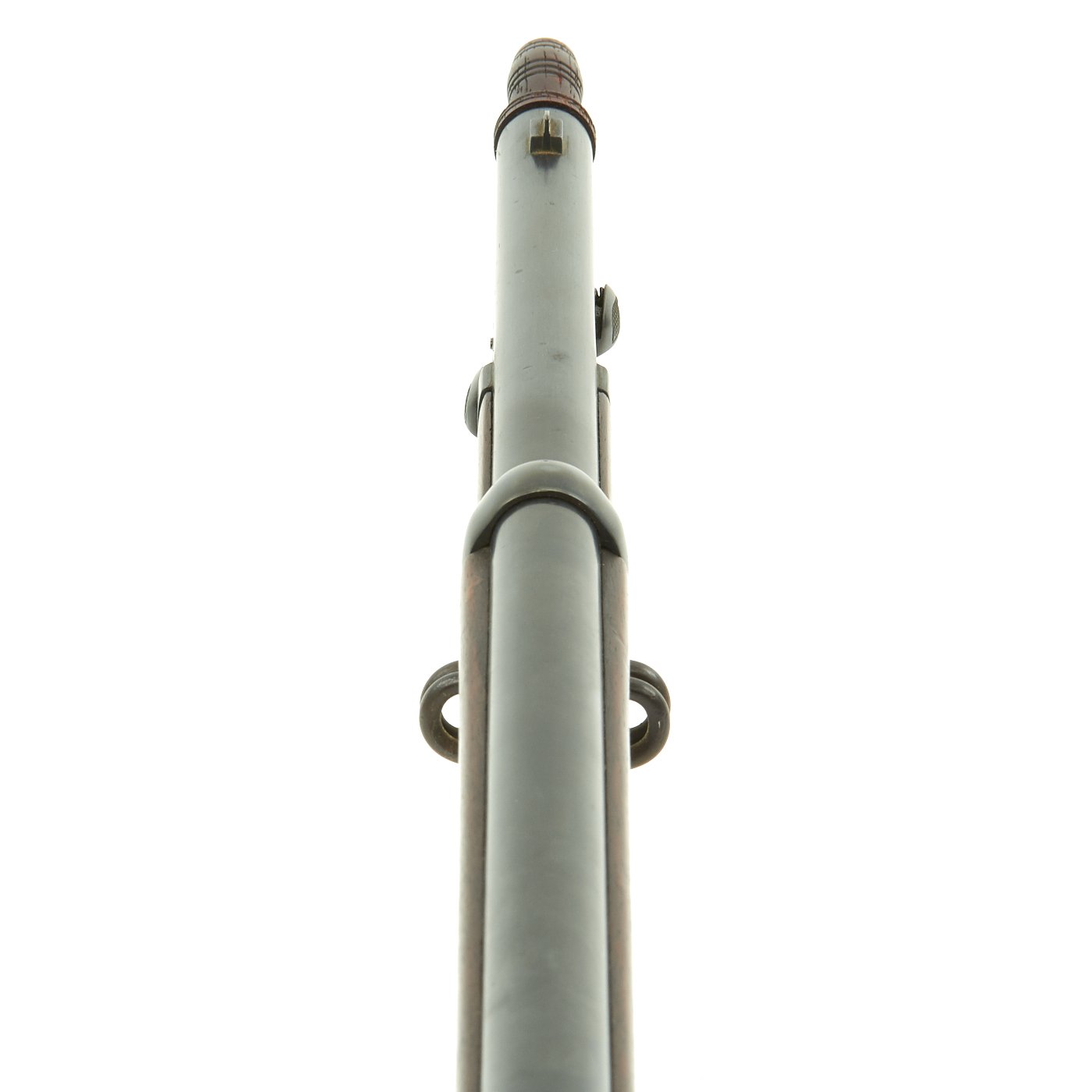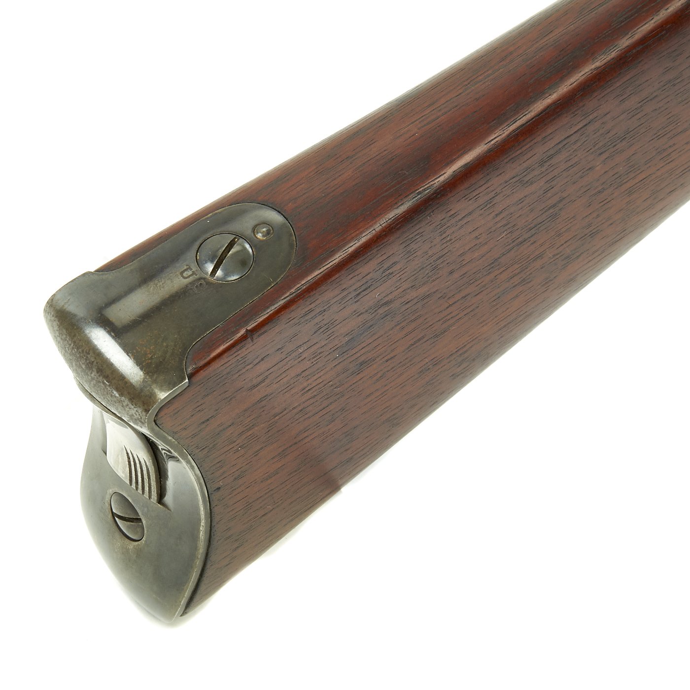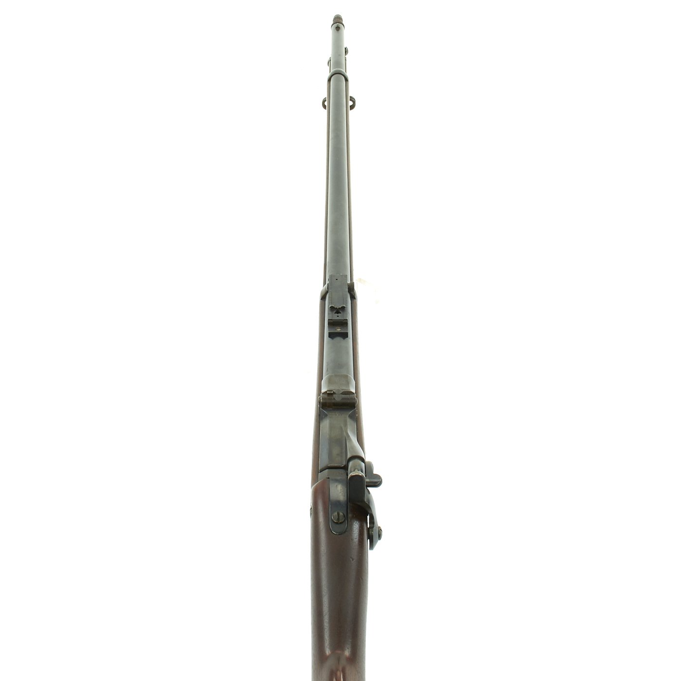 Center fire breechloader, .45 cal., two bands, two sling swivels with stacking swivel, Buffington sight, sliding ramrod bayonet. Lock is marked with an eagle and U.S. / SPRINGFIELD, manufactured by Springfield Armory, Springfield Massachusetts. The top tension screw on the sight has unfortunately broken off in the channel, but could probably be replaced.