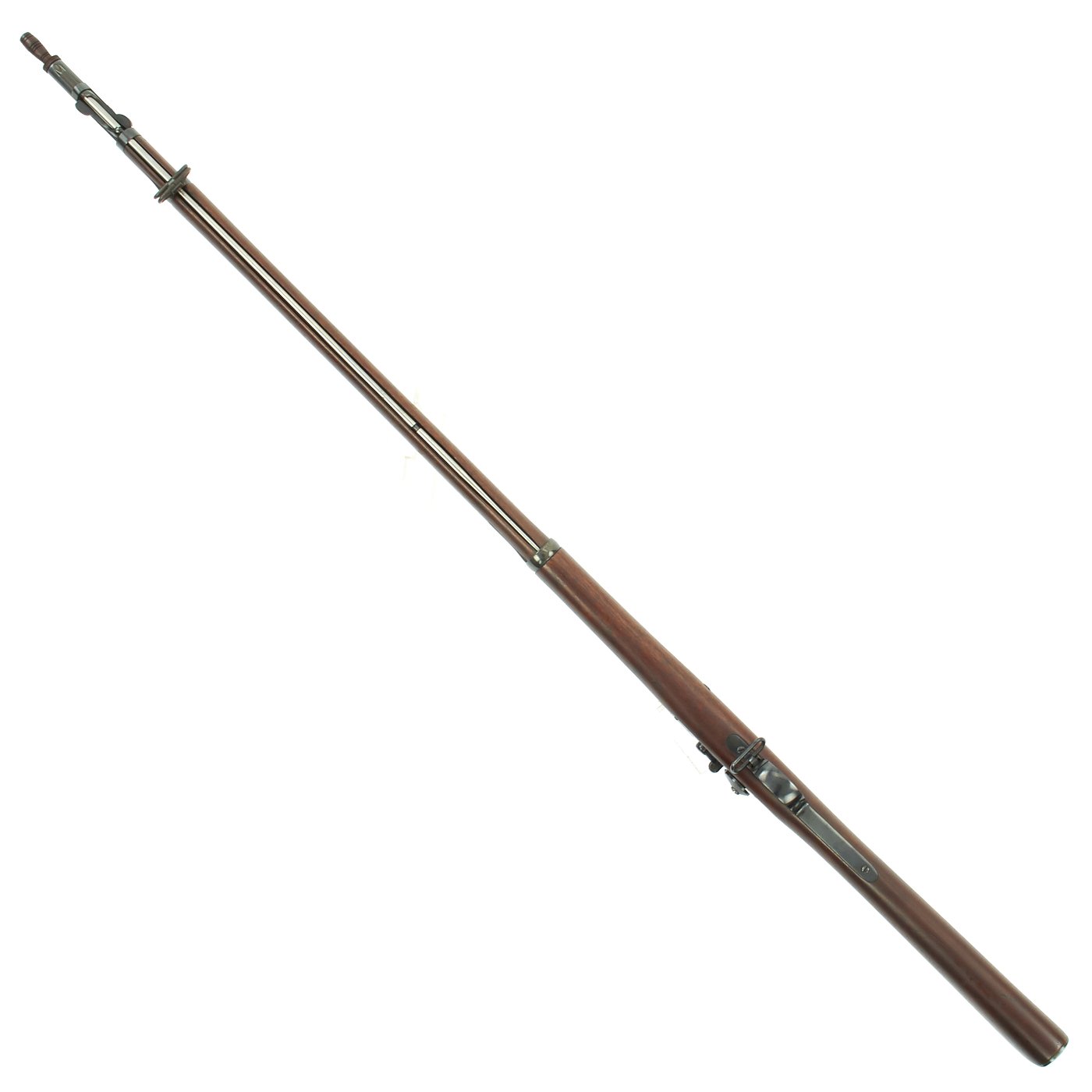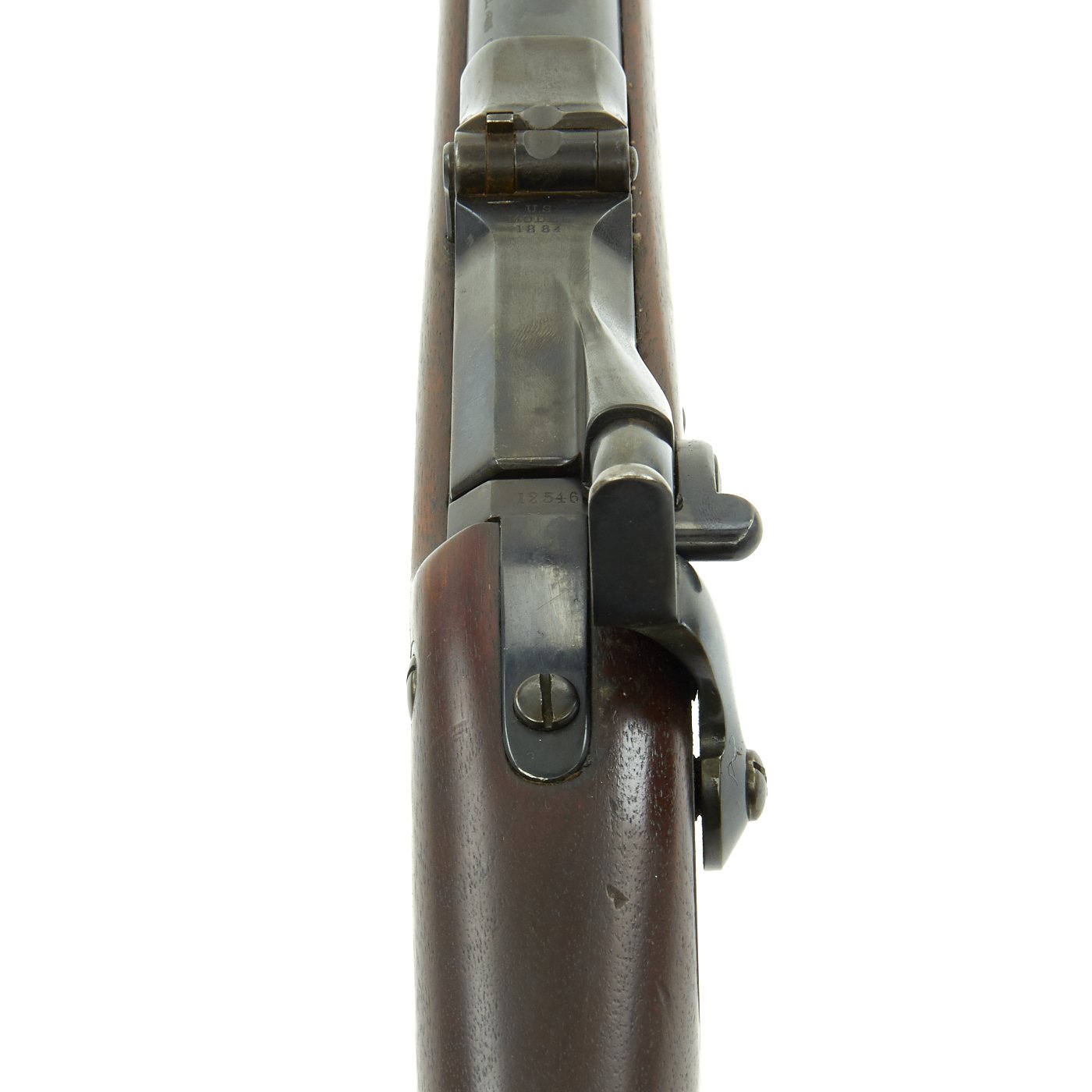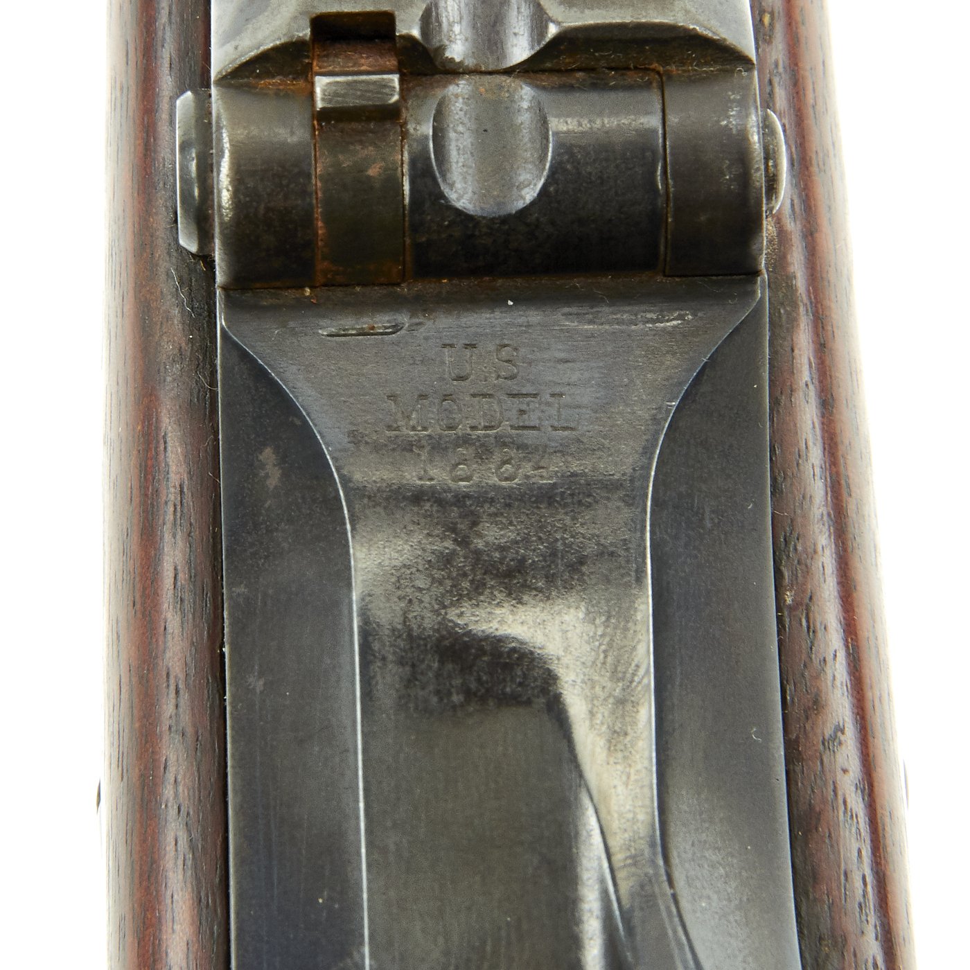 Center fire breechloader, .45 cal., two bands, two sling swivels with stacking swivel, Buffington sight, sliding ramrod bayonet. Lock is marked with an eagle and U.S. / SPRINGFIELD, manufactured by Springfield Armory, Springfield Massachusetts. The top tension screw on the sight has unfortunately broken off in the channel, but could probably be replaced.