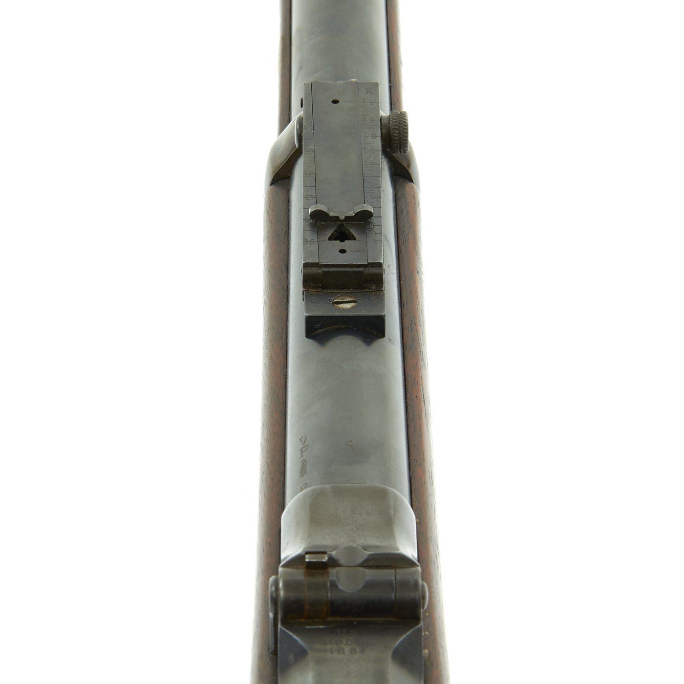 Additional marks of interest include inspectors' and proof marks around the breech end of the barrel: a capital A on top; a V over a P over an eagle's head over another P on the left side just above the stock. The upper right corner of the Buffington sight leaf is marked R to indicate that the sight graduations are for a rifle and not a carbine.