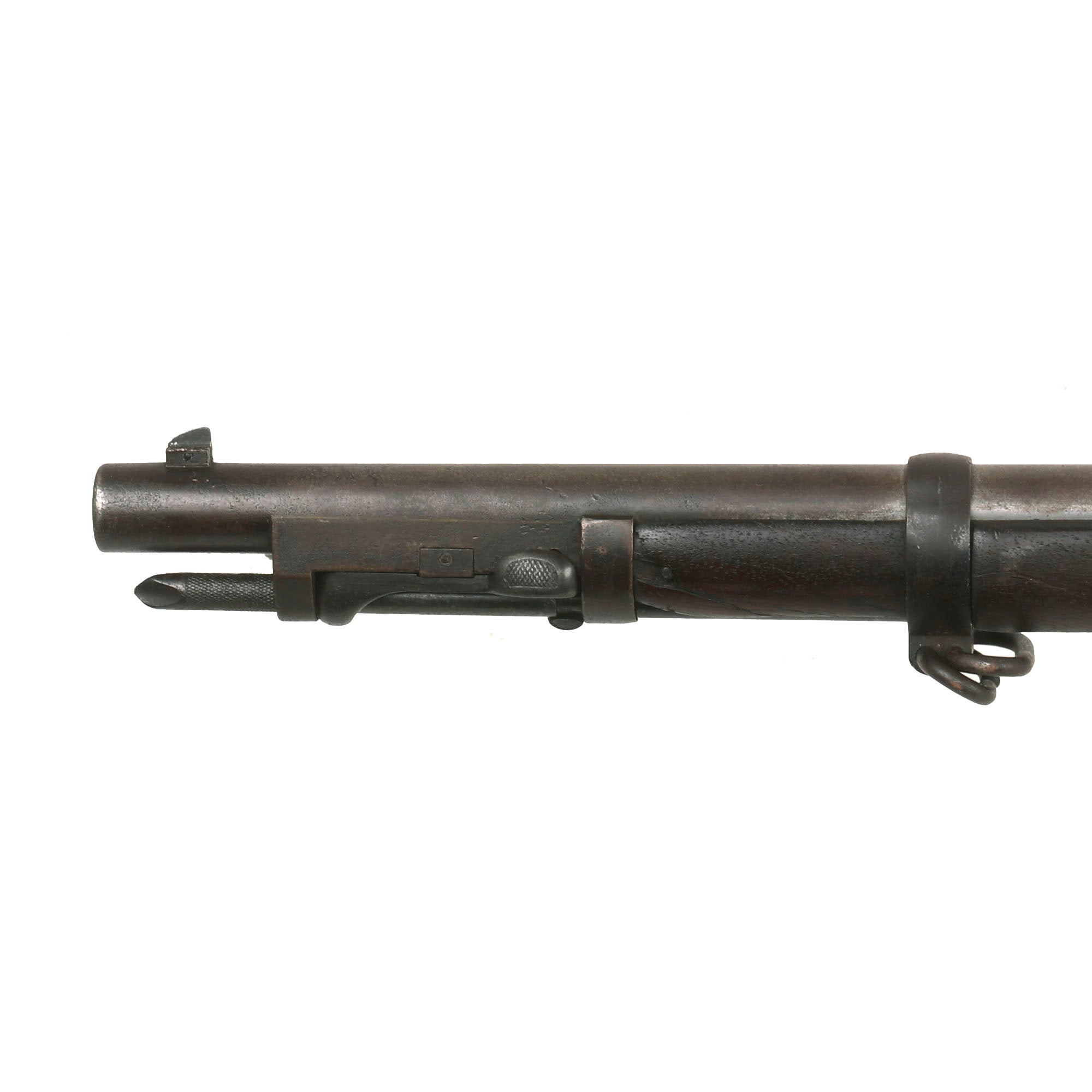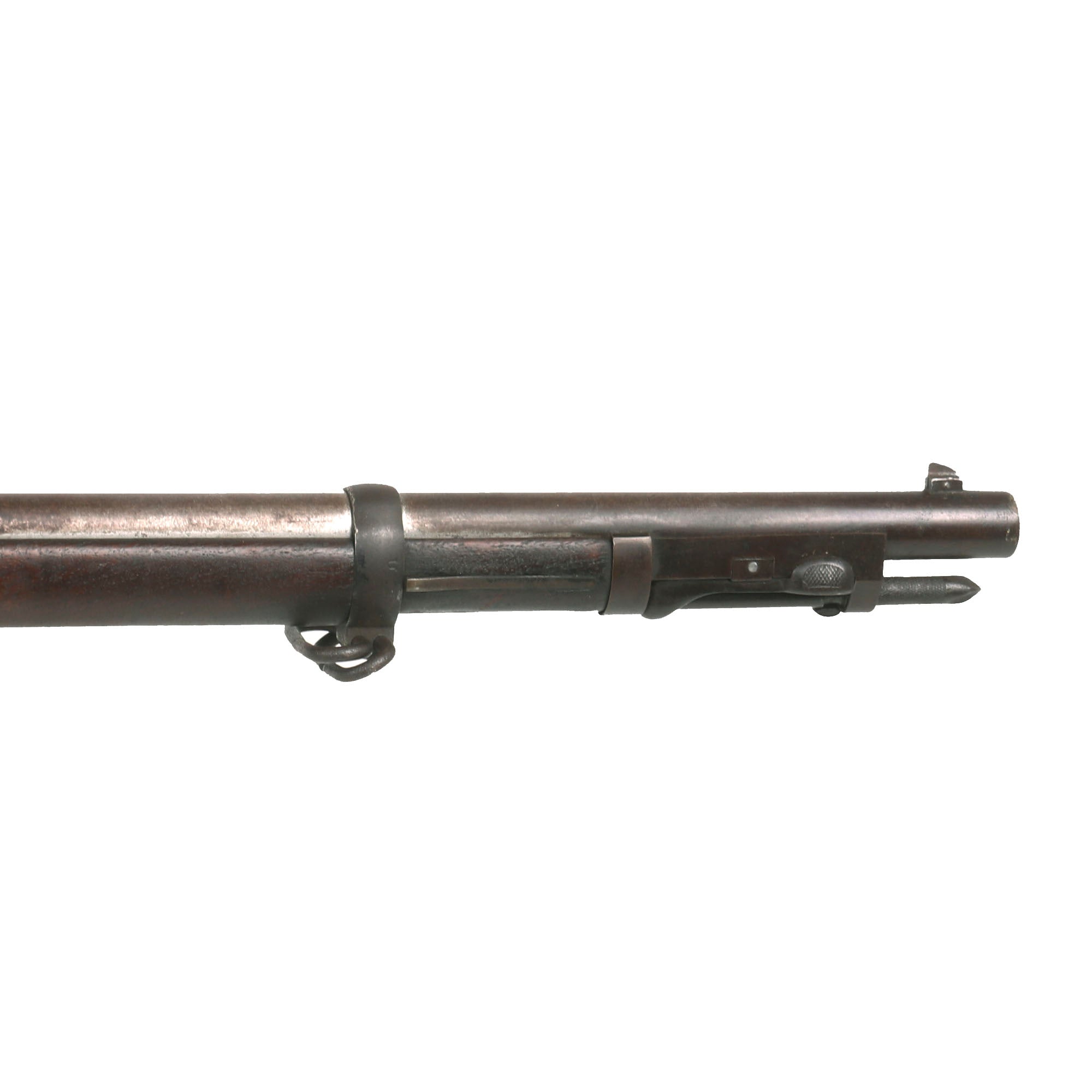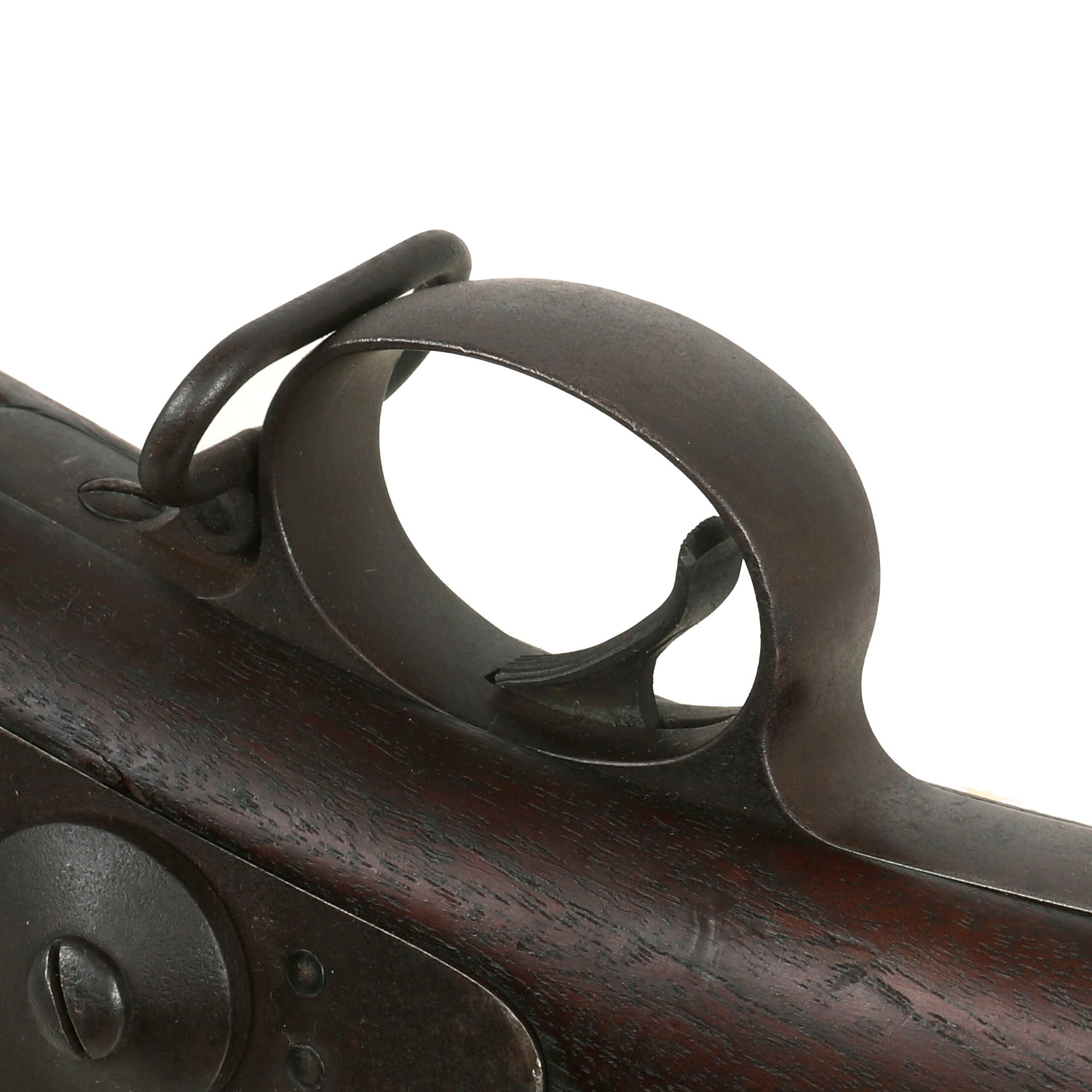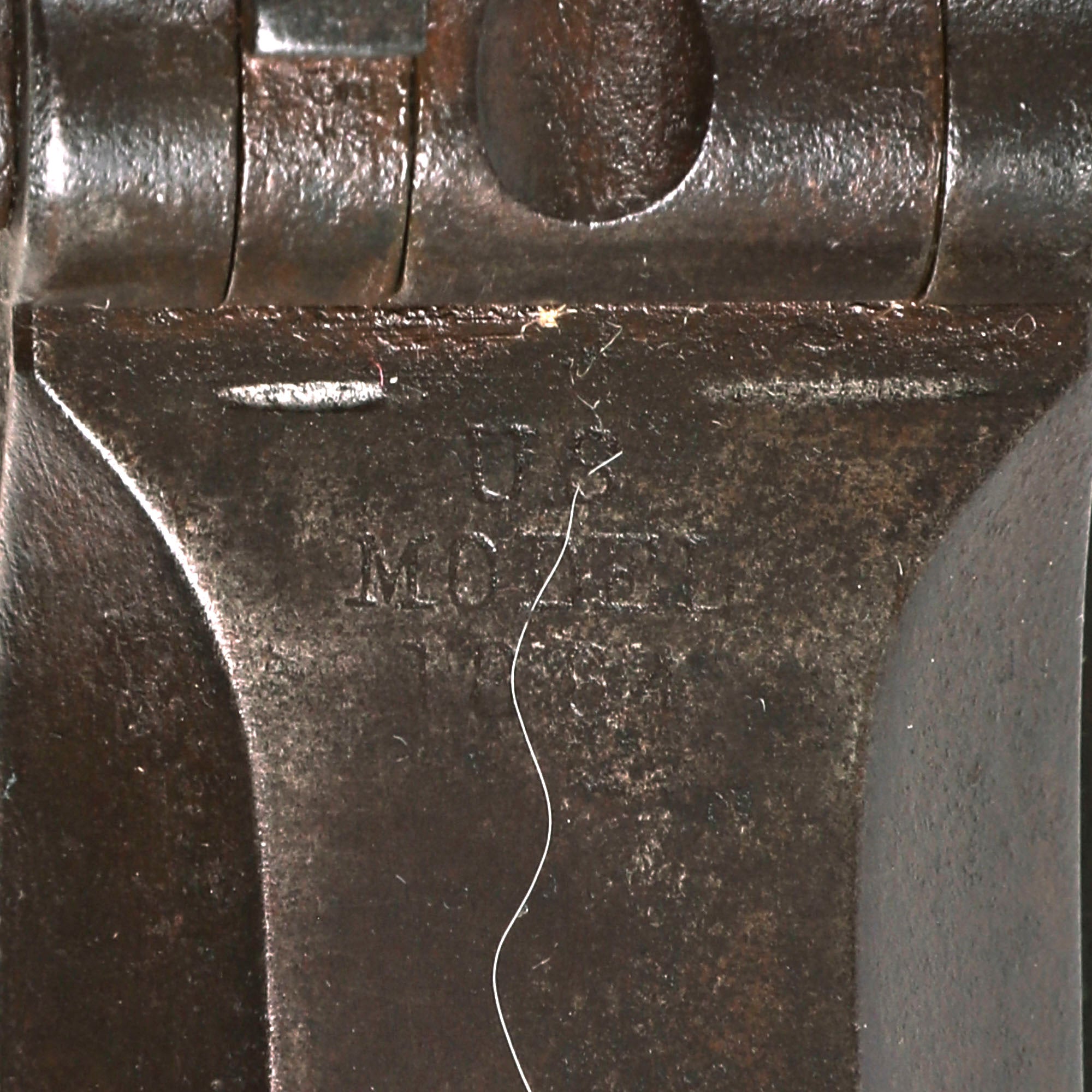 The both barrel bands are U marked, and the butt plate tang is marked with the correct U.S. stamp. Center fire breechloader, .45 cal., two bands, two sling swivels with stacking swivel, Buffington sight, sliding ramrod bayonet. Lock is marked with an eagle and U.S. / SPRINGFIELD, manufactured at the United States Armory and Arsenal at Springfield, in Springfield, Massachusetts. The lock is fully functional, and the cartridge extractor is present and functional, however we cannot guarantee it will work on actual brass. The rear sight is fully intact, with the range and windage easily adjustable.