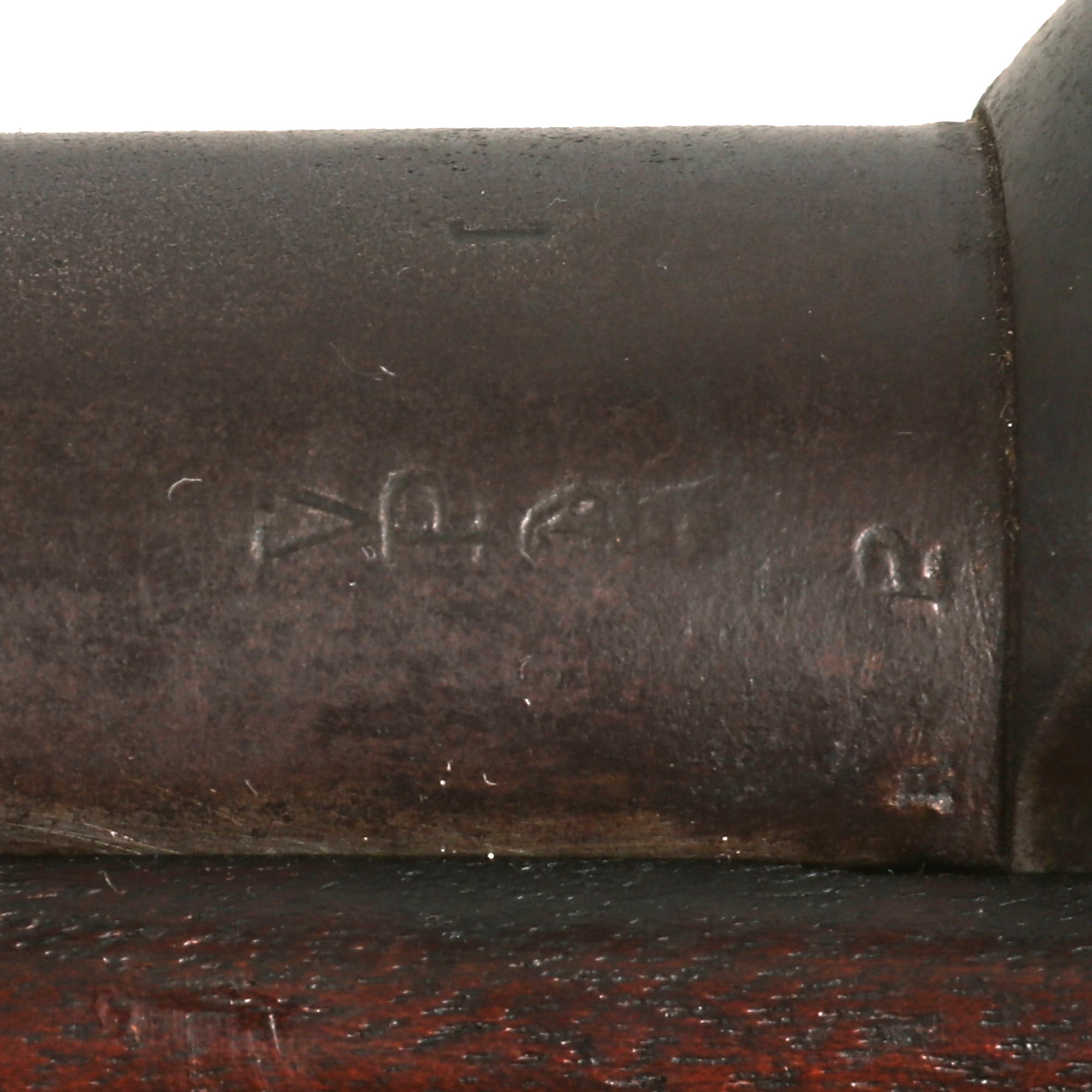 A VERY faint partial stylized P in a circle under the wrist of the stock indicates that the rifle passed all of its overpressure proof testing. Additional marks of interest include inspectors' and proof marks around the breech end of the barrel: a capital I on top; and a V over P over an Eagle's head over another P on the left side just above the stock. The upper right corner of the Buffington sight leaf is marked R to indicate that the sight graduations are for a rifle and not a carbine.