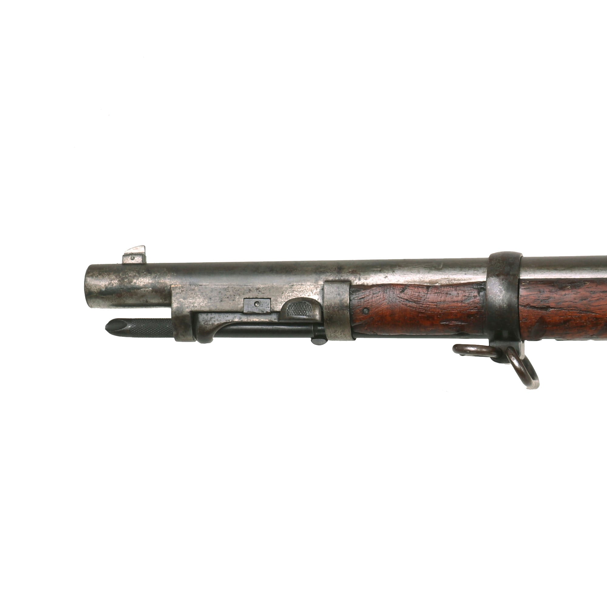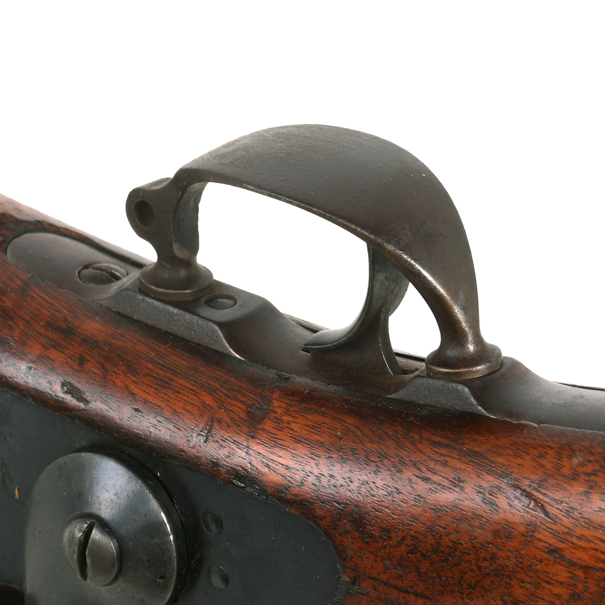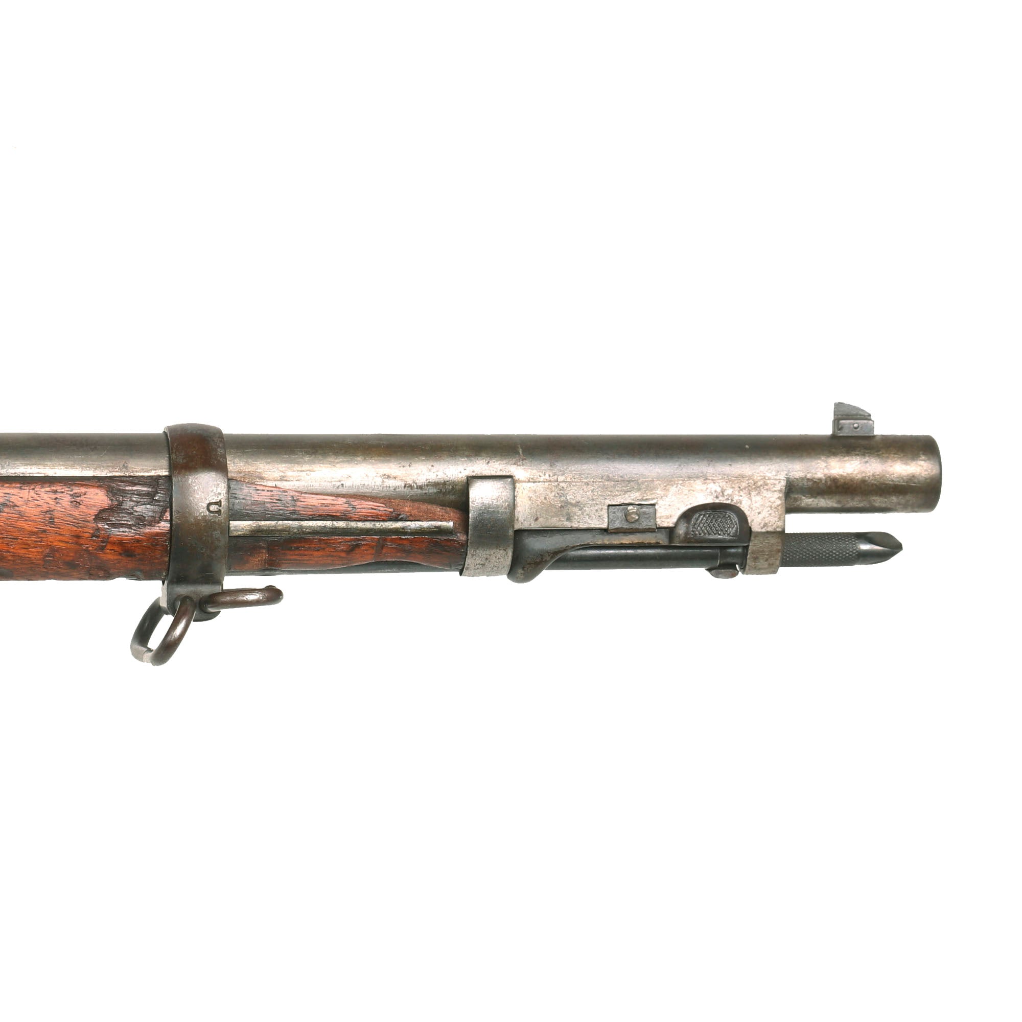 The metalwork on the rifle still shows the original blued finish now faded to a lovely peppered patina overall, which we have left intact to preserve the "arsenal fresh" look of the rifle. There are traces of the original case-hardening on the bottom of the breech block, as well as inside the breech. The bore is in excellent condition, showing a great bright finish with crisp lands and grooves. There is just a small bit of wear present, but this is definitely one of the best bores we’ve seen on a trapdoor. The cleaning rod / bayonet is functional, with a worn finish and intact threads on the end, and the locking mechanism by the muzzle is fully functional, just a tiny bit stiff.